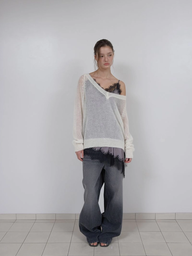알파카가 혼용된 원사로 적당히 시스루하게 재직하여 봄, 가을 간절기뿐 아니라 겨울까지 착용가능한 꽈배기 조직 오프숄더 니트.