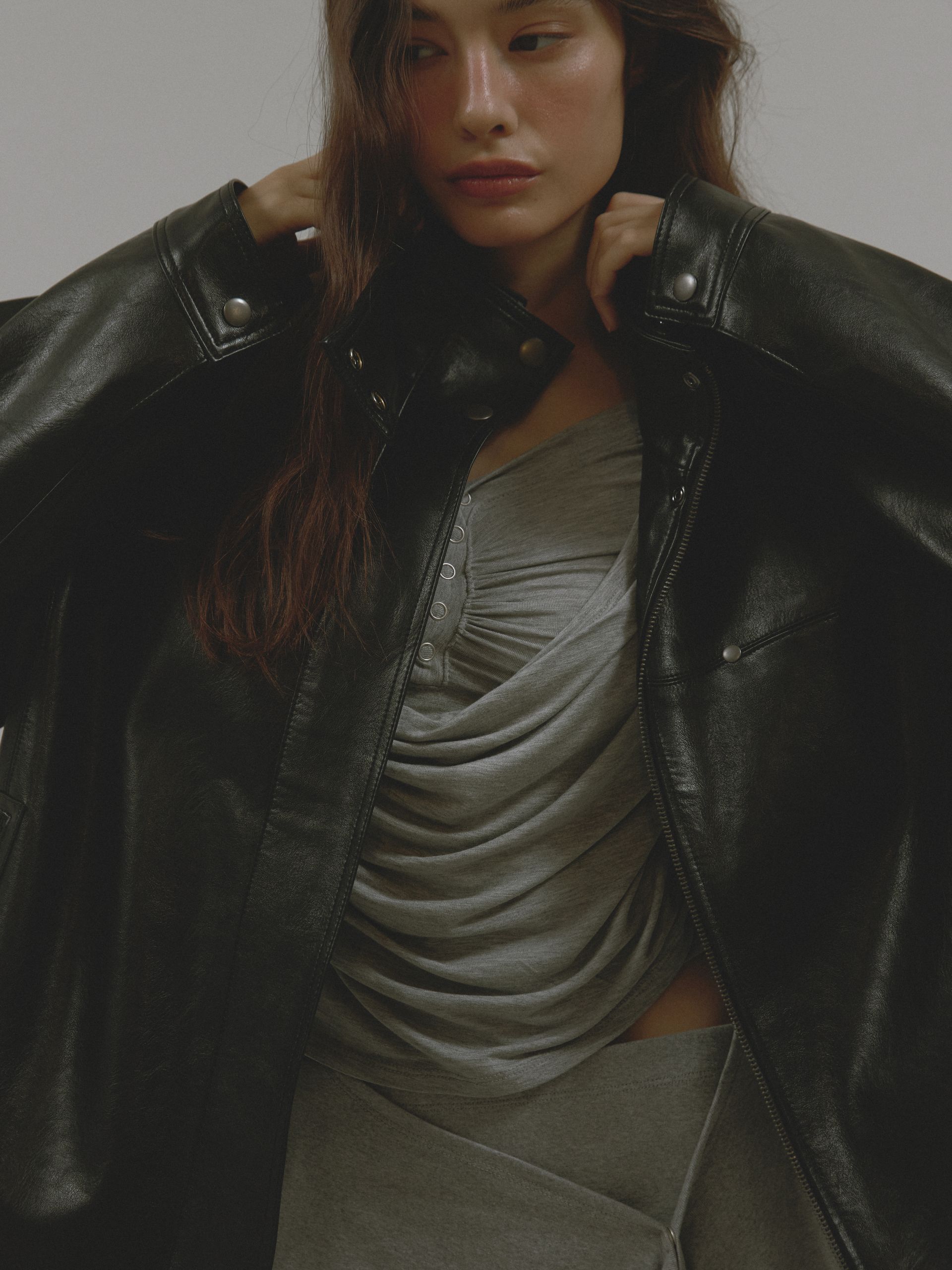 레더와 스웨이드의 배색이 돋보이는 점퍼.