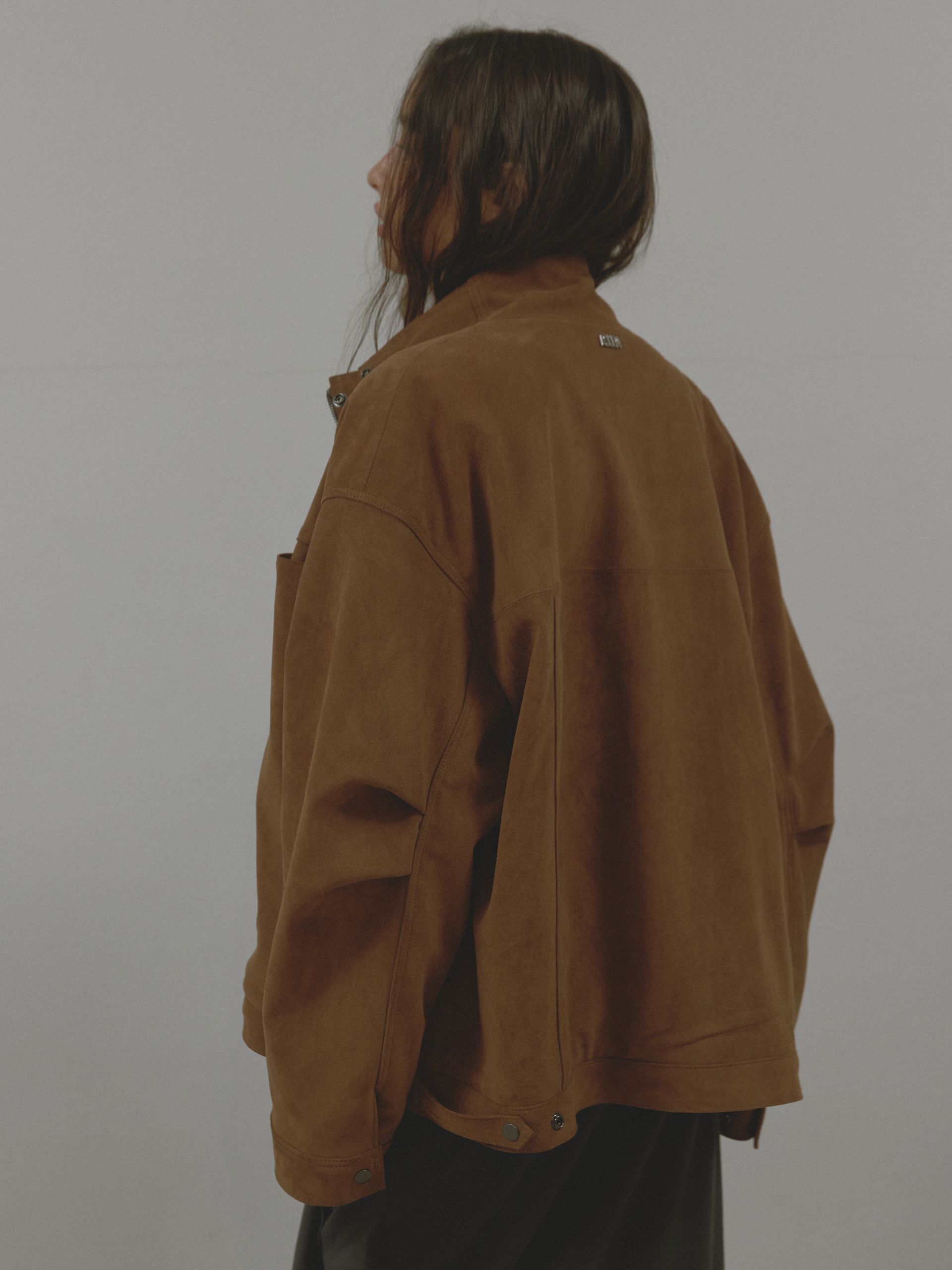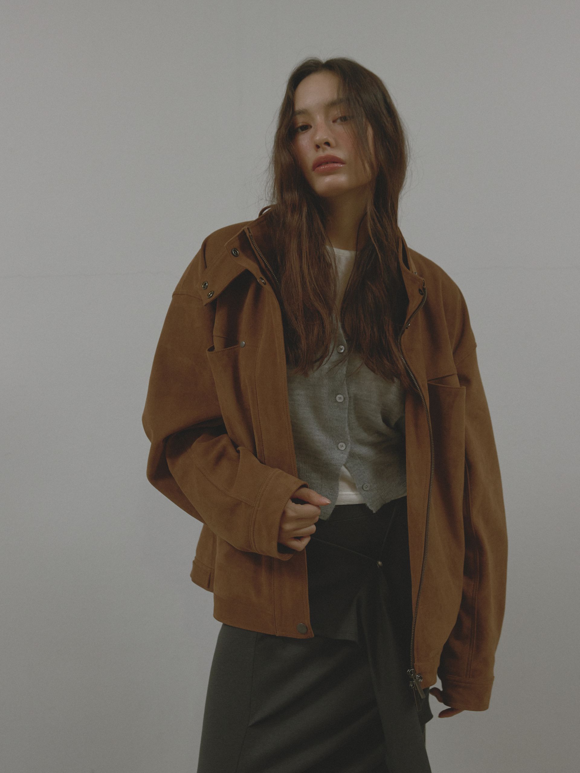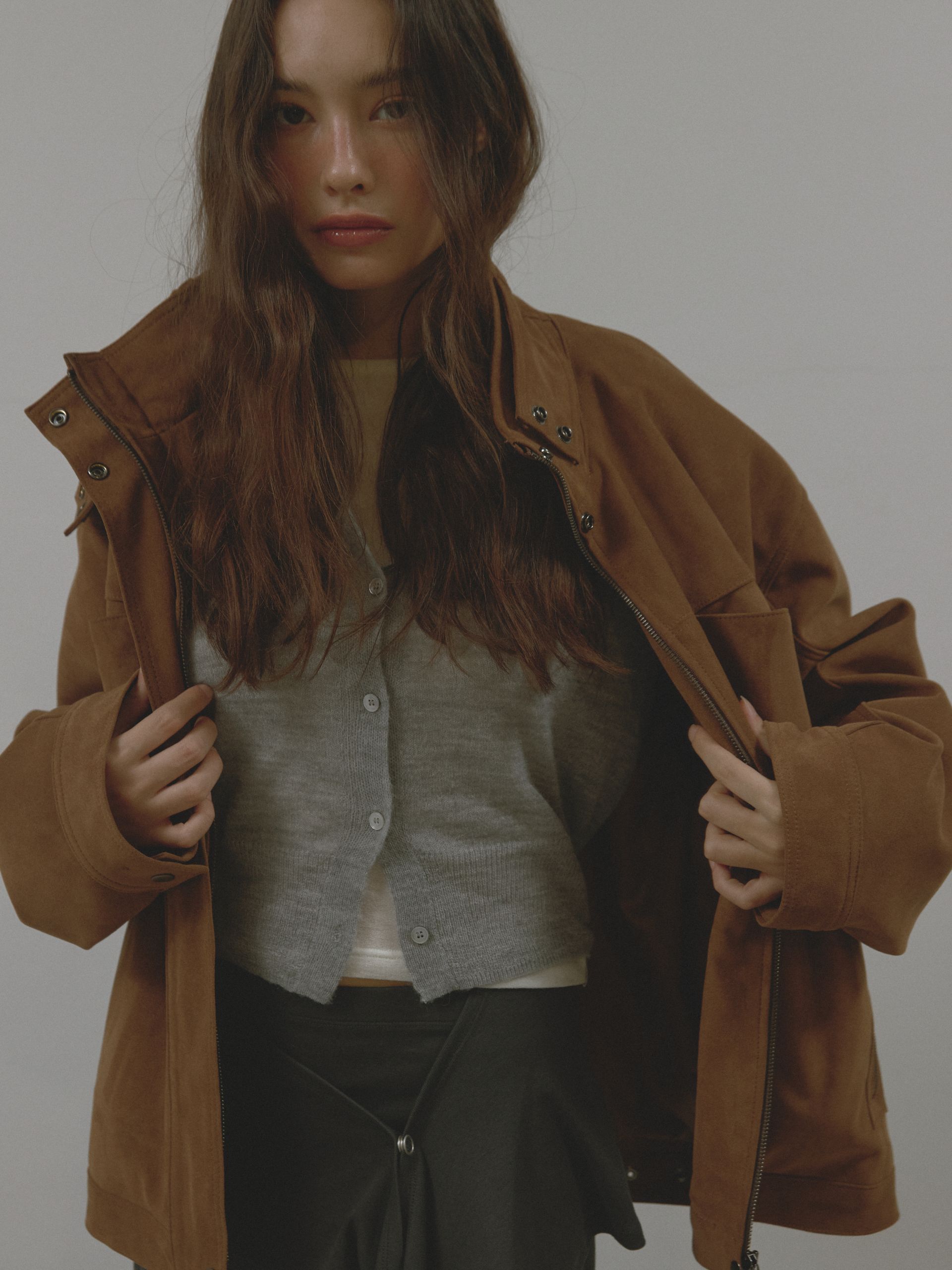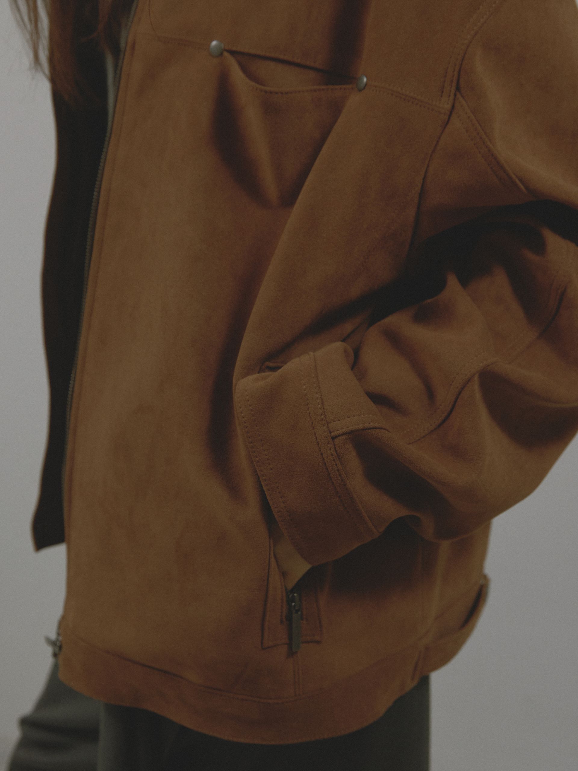 레더와 스웨이드의 배색이 돋보이는 점퍼.