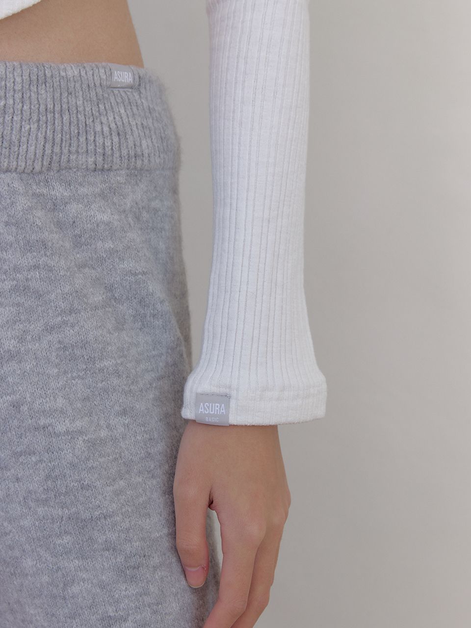 가장 큰 특징인 밑단 언밸런스 햄 라인이 골반 라인을 따라 자연스럽게 곡선으로 떨어지며 트렌디한 포인트를 더했습니다.