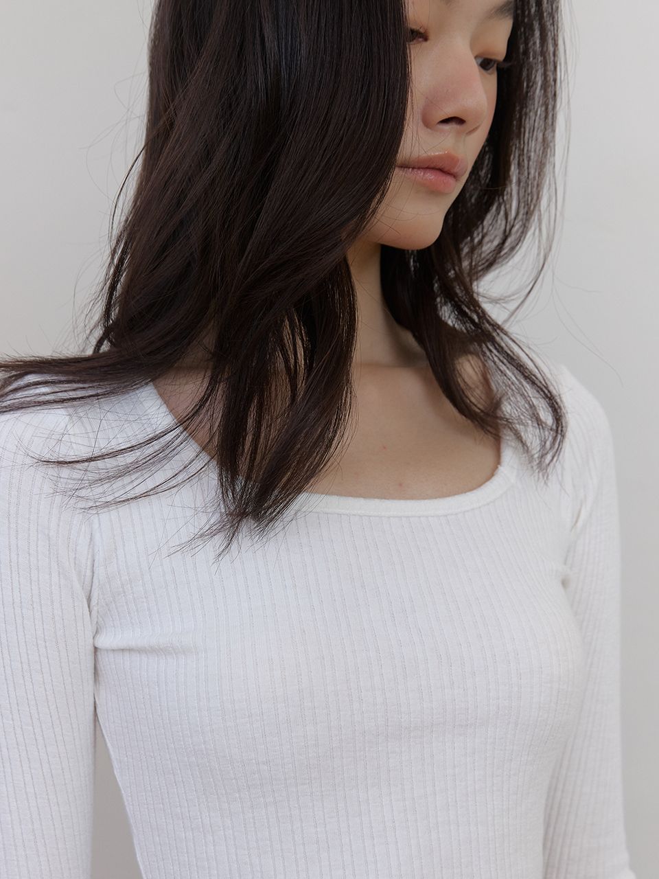 라운드와 스퀘어의 중간 형태인 넥 라인이 여성스러운 쇄골 라인을 강조해 줍니다.