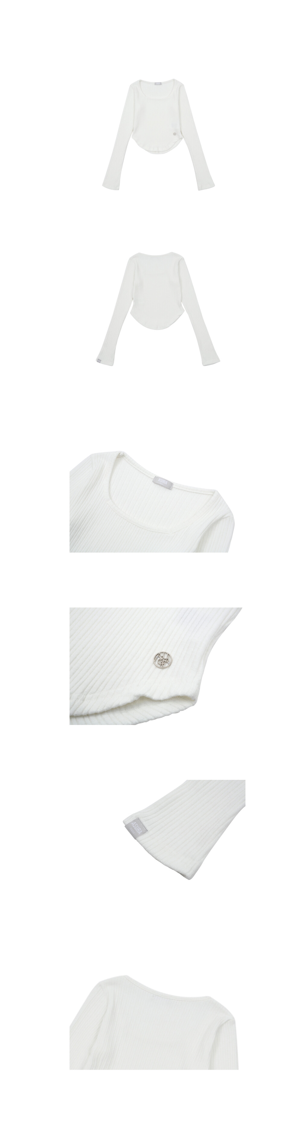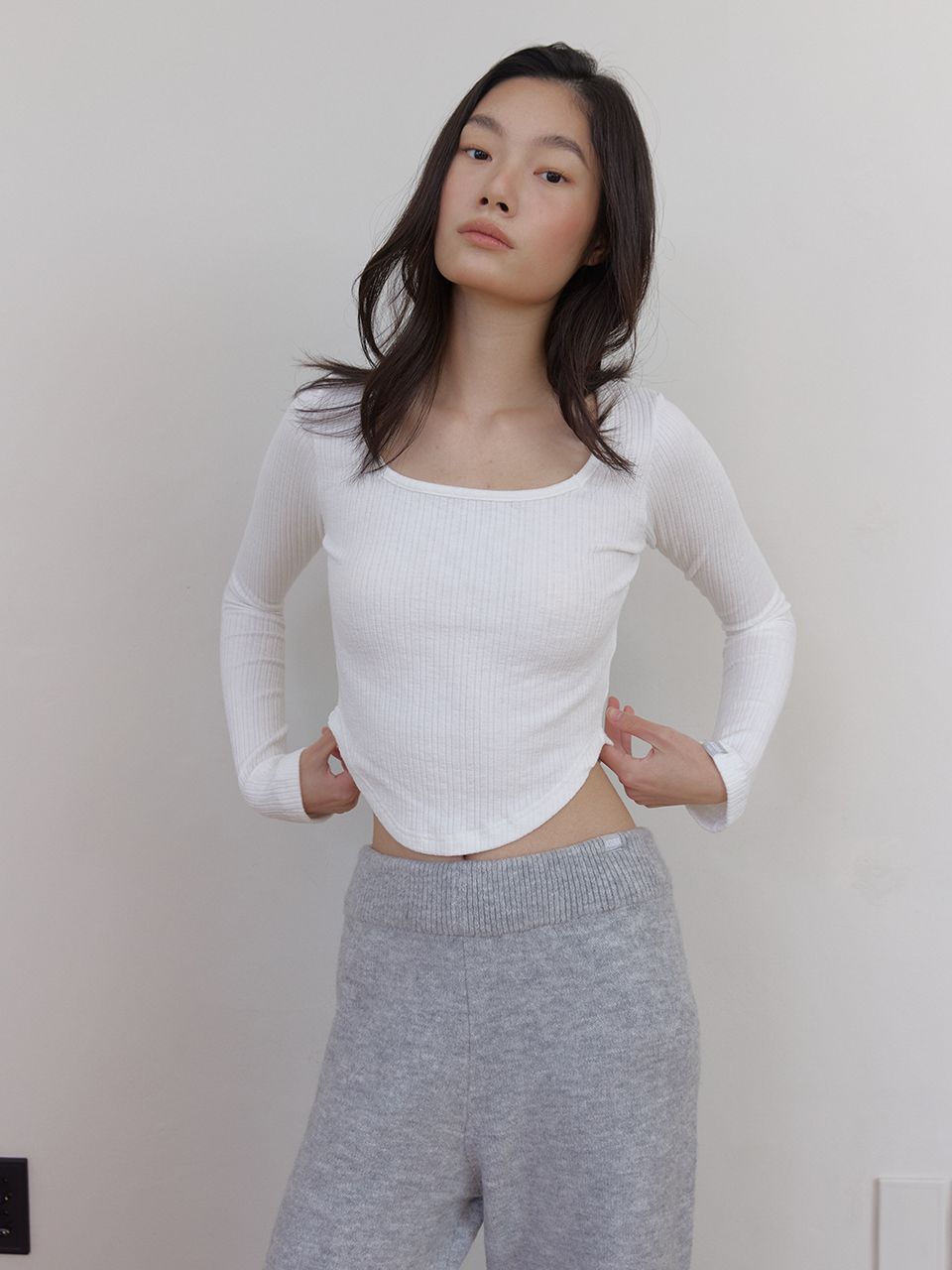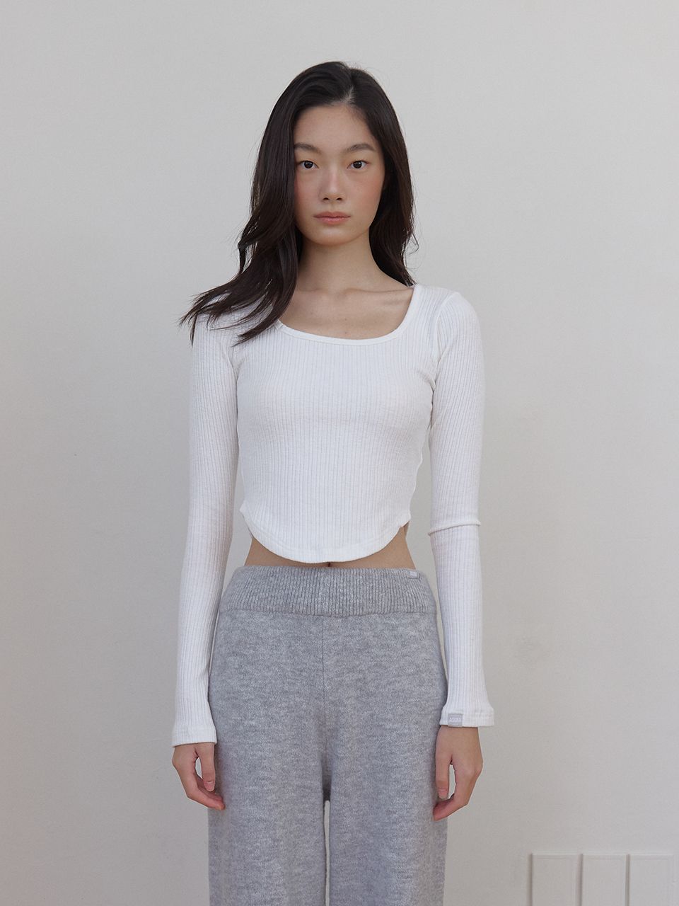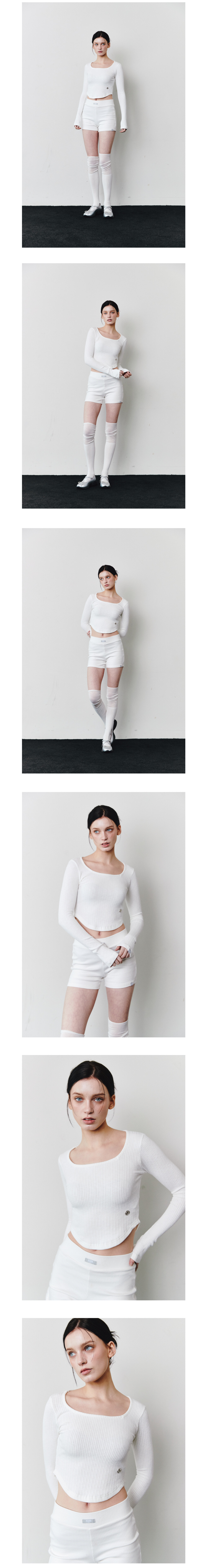 신축성이 좋은 립 조직으로 제작되어 슬림하고 편안하게 몸을 감싸주는 크롭 긴팔 탑입니다.