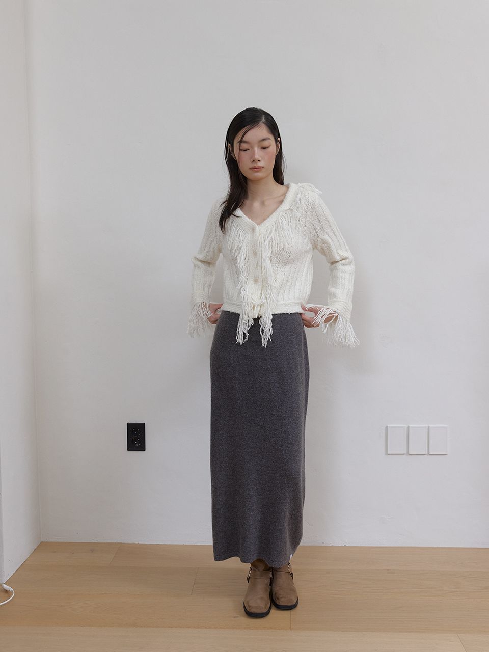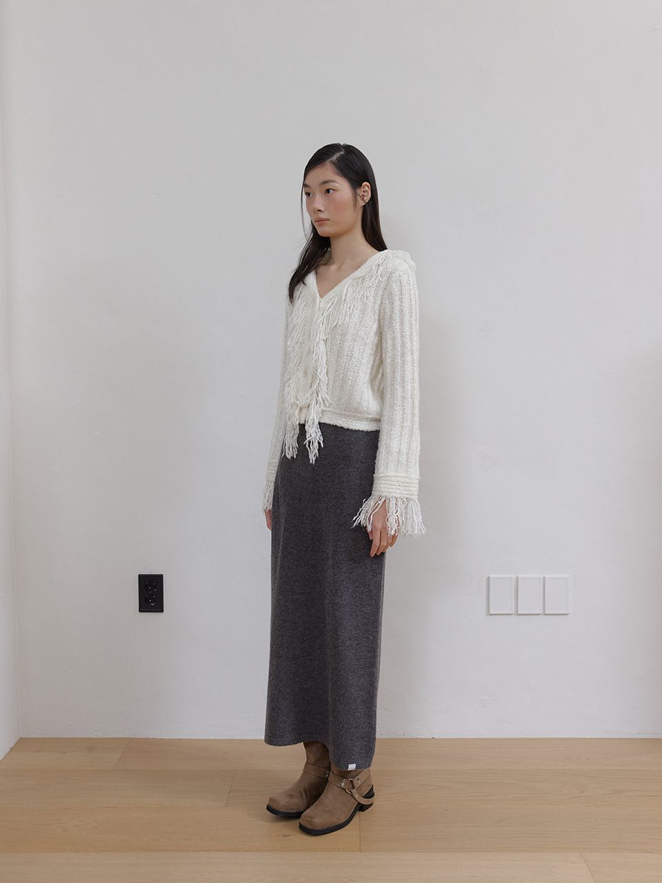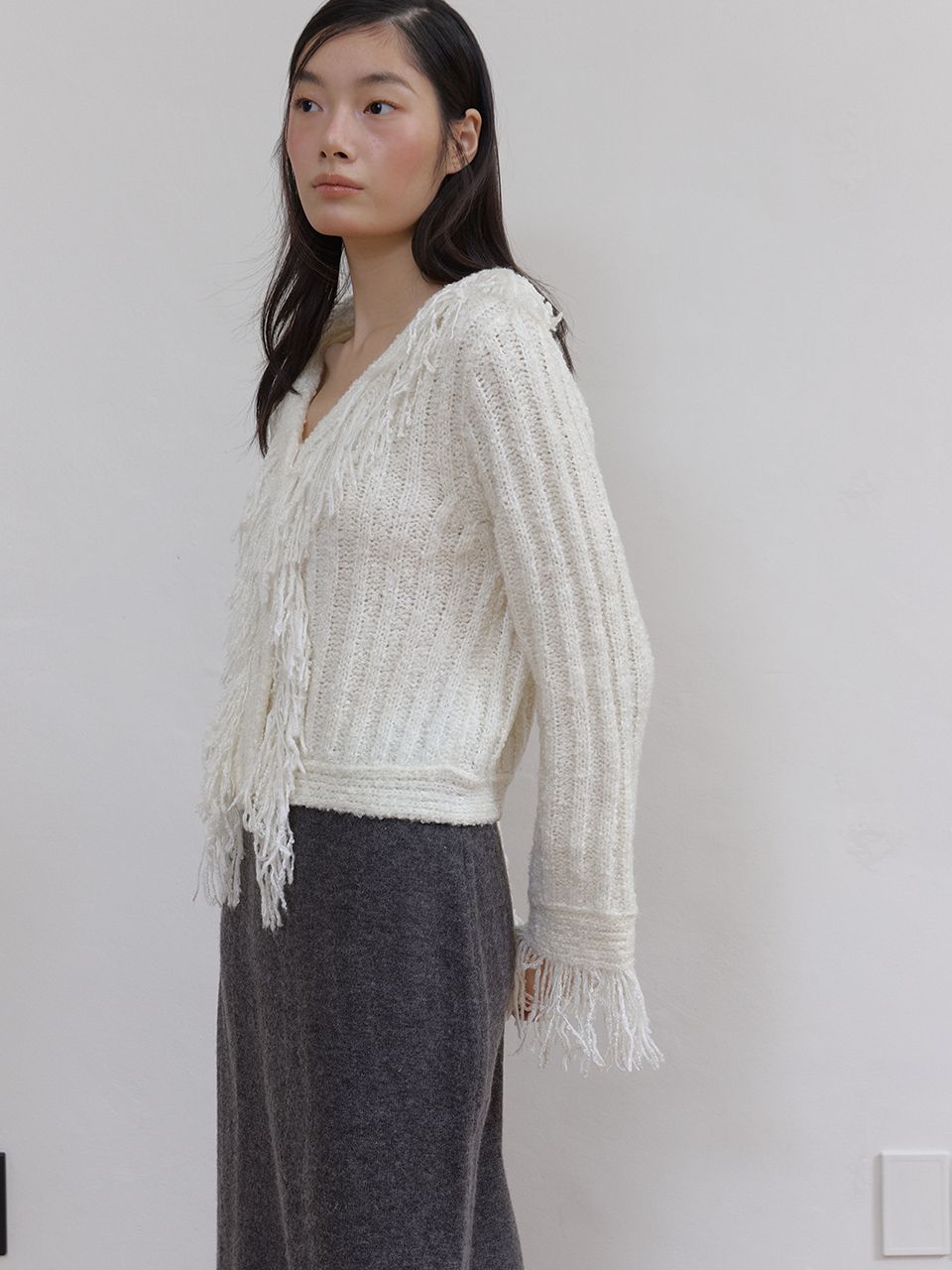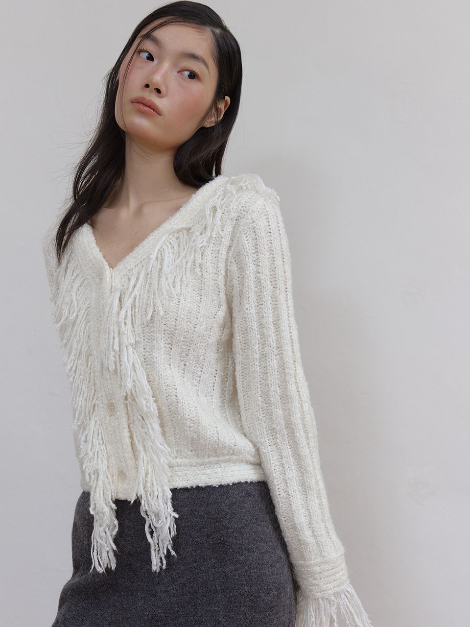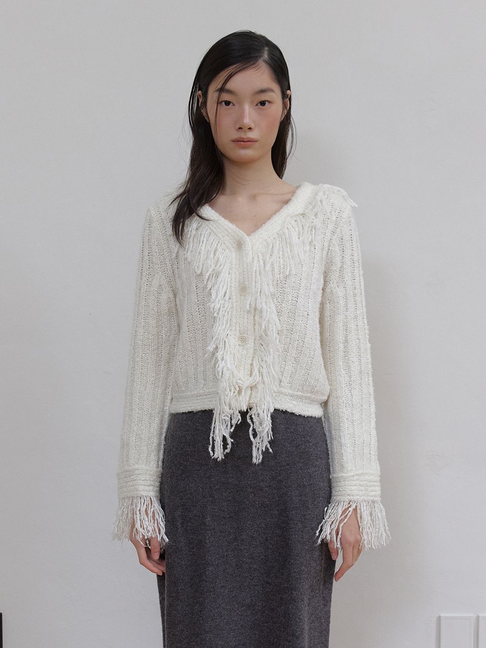 헤어리한 원사와 수술이 포인트인 니트 가디건입니다.