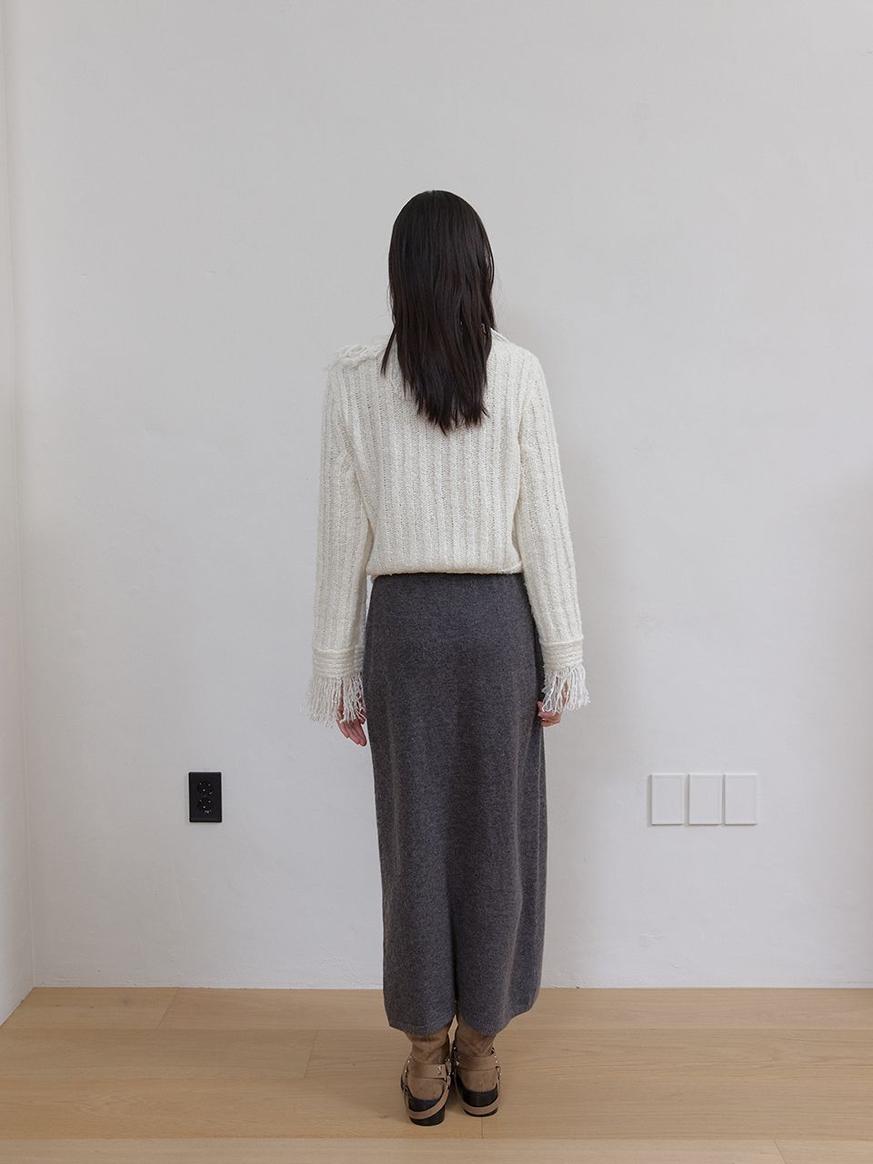 소매 끝 부분과 밑단에 수술 디테일이 있어, 독특한 텍스처와 스타일을 연출합니다.