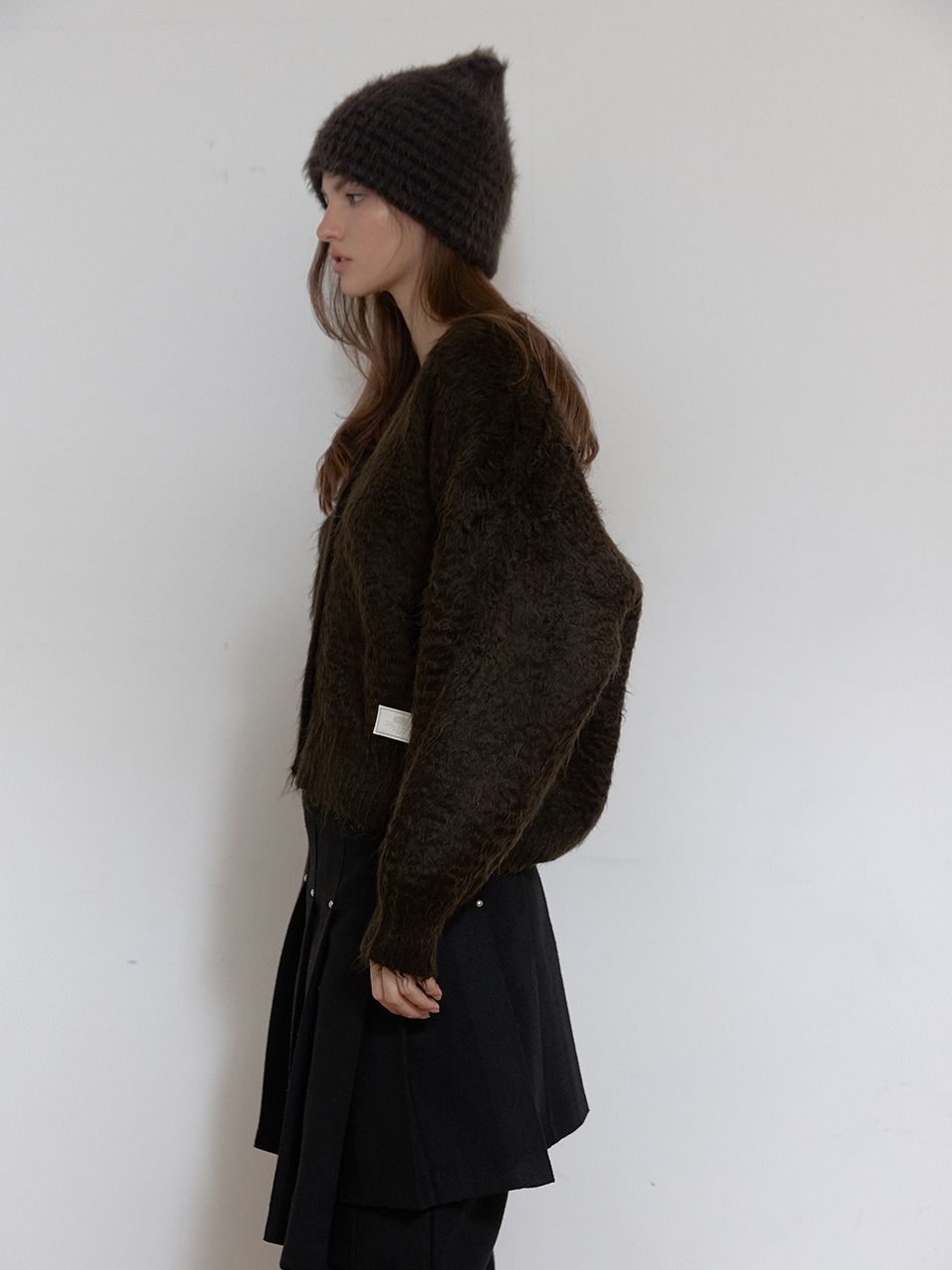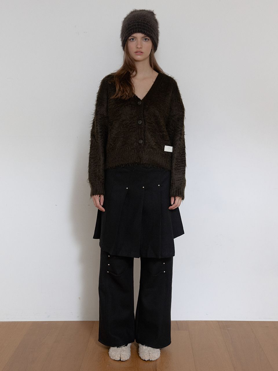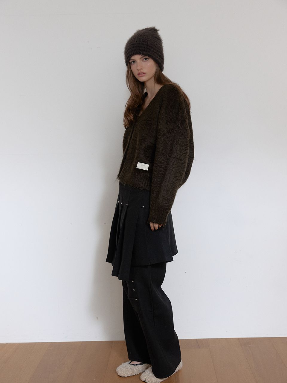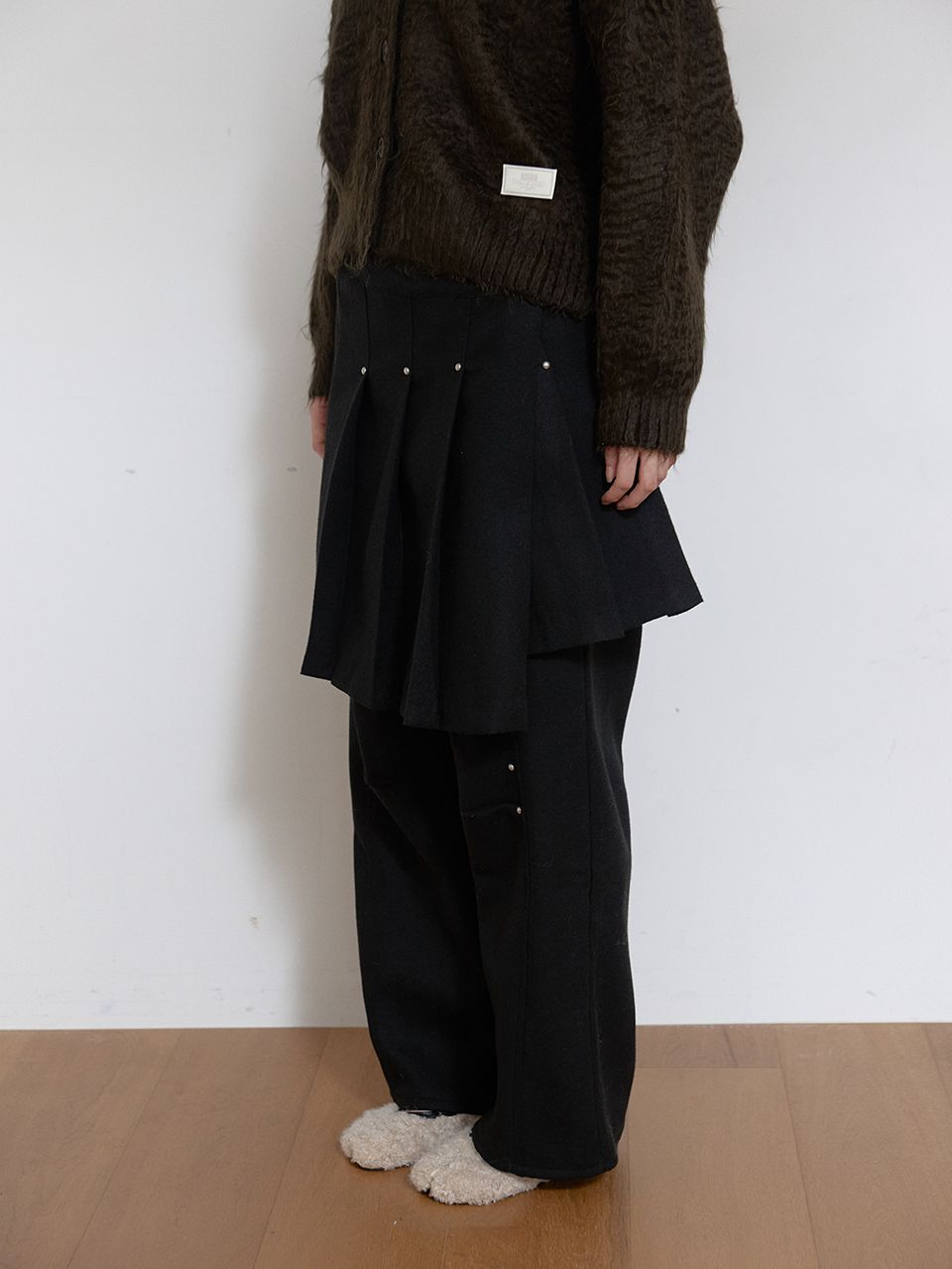 탄탄한 울 소재로 각잡힌 플리츠 단으로 모던한 느낌을 주며, 리벳 디테일과 언발란스하게 겹쳐지는 플리츠가 고급스러운 분위기를 연출합니다.