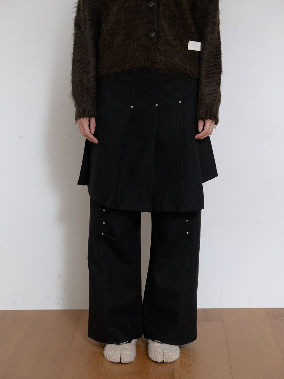 WOOL RIVET PLEATS LAP SKIRT (BLACK)