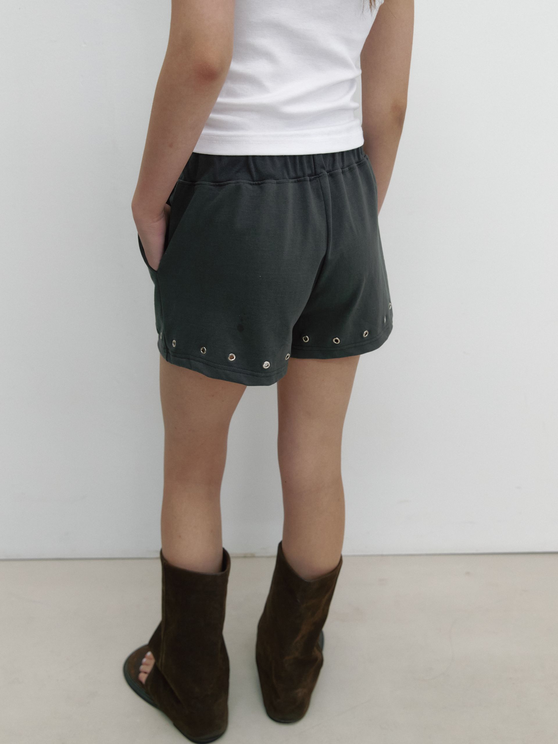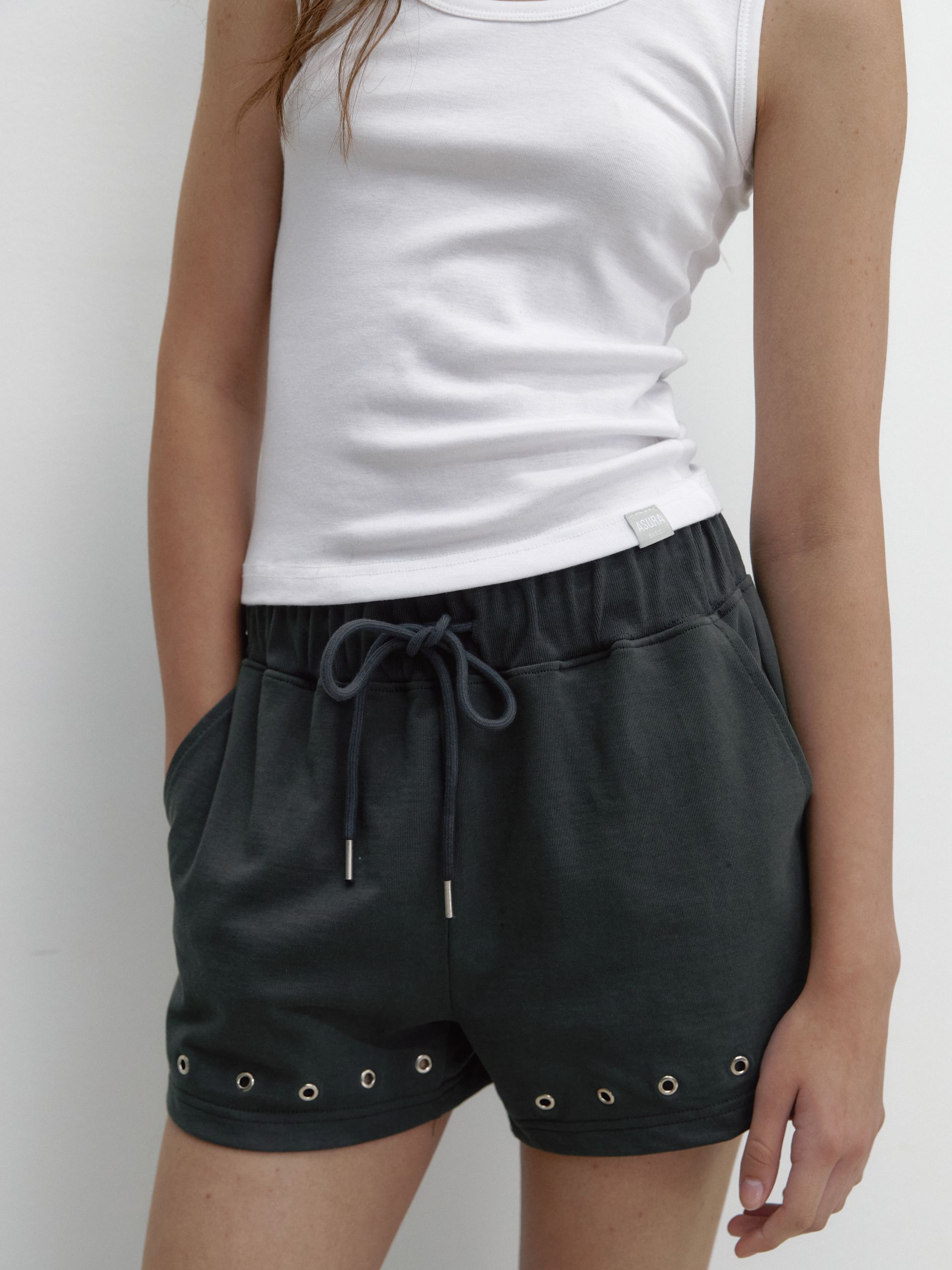 밑단 라인을 따라 들어간 아일렛이 포인트인 져지 숏팬츠 입니다.