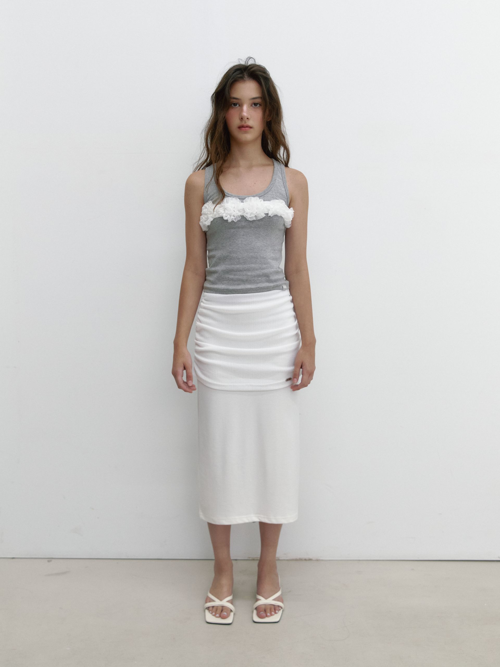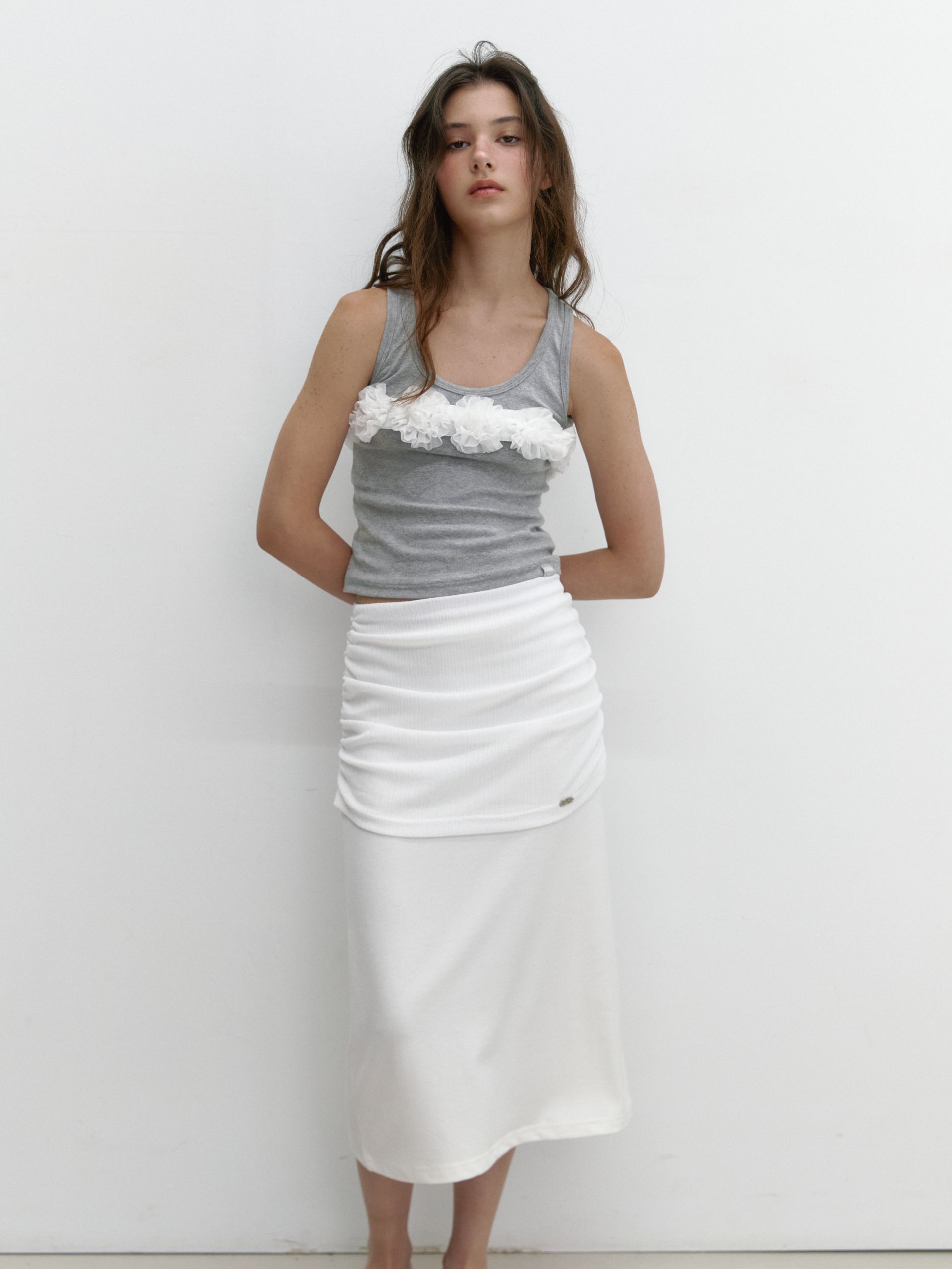 시어한 짜임의 골지 니트와 부드러운 면 소재가 믹스된 디자인으로 고급스럽고 유니크한 무드의 롱 스커트 입니다.