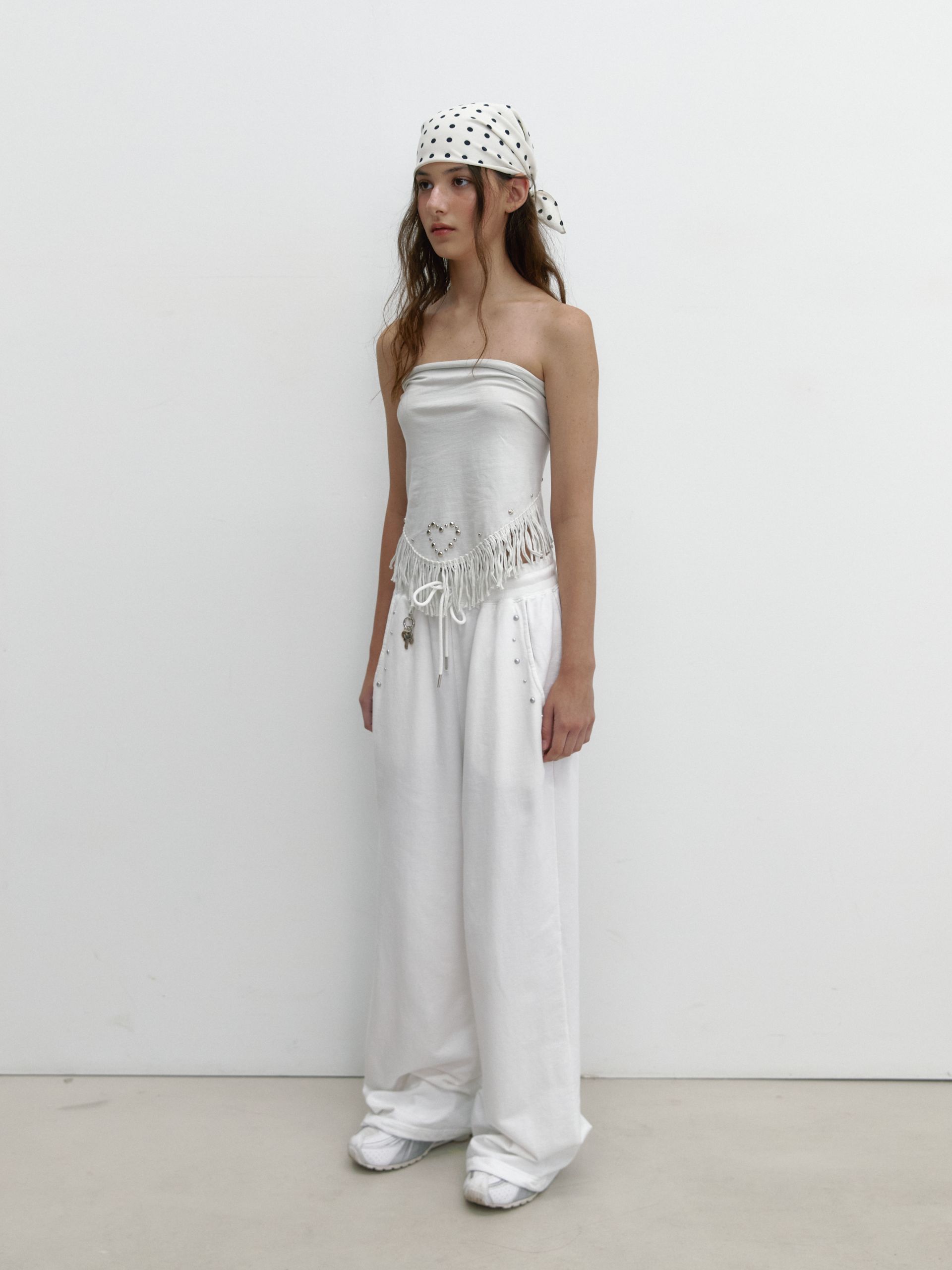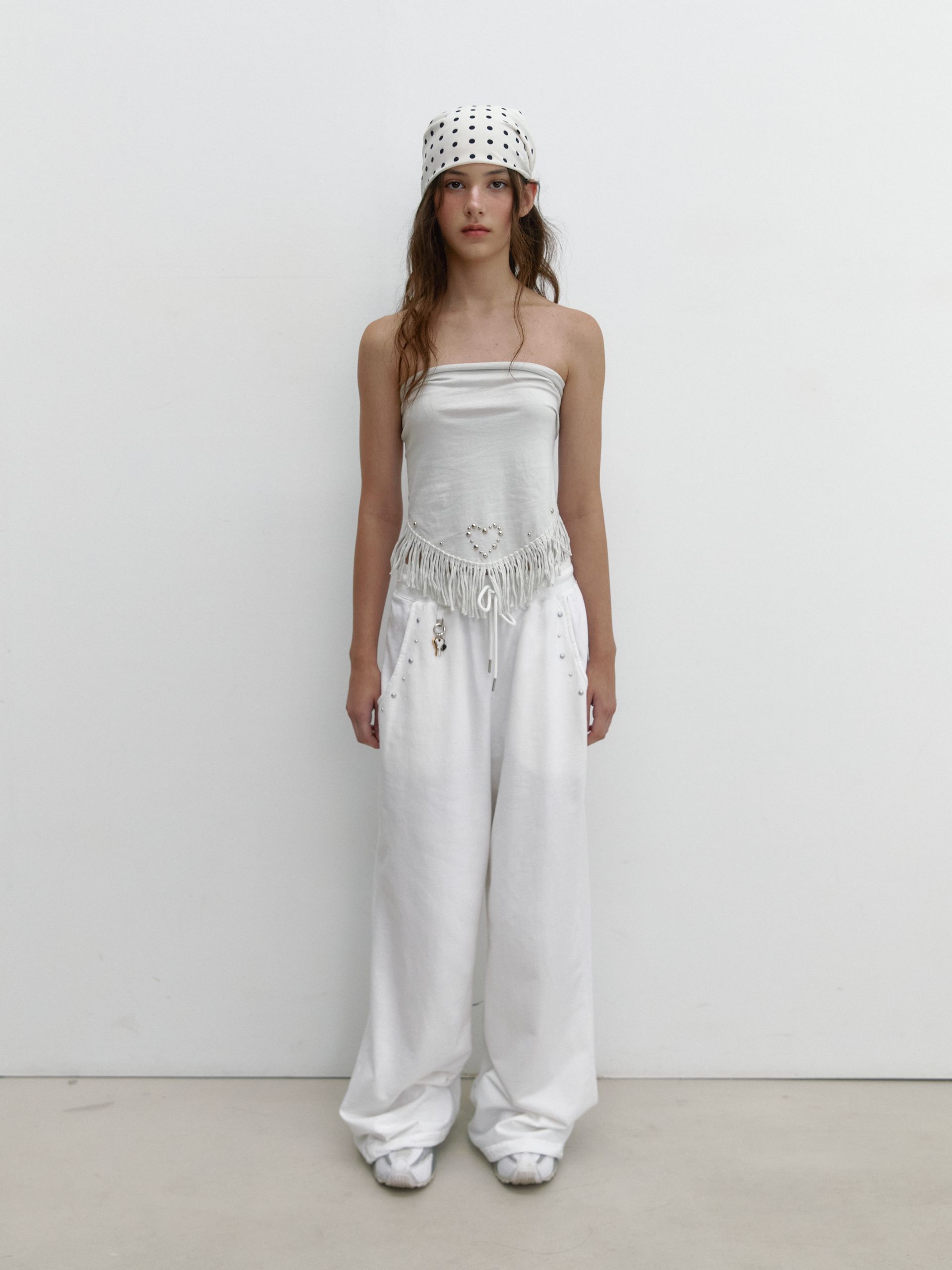코튼 소재로 핏을 탄탄하게 잡아주어 깔끔한 실루엣로 떨어지며, 밑단 스터드와 태슬 디테일로 보헤미안 무드에 중심쪽 하트 쉐입 스터드로 러블리한 무드를 더한 포인트 아이템 입니다.