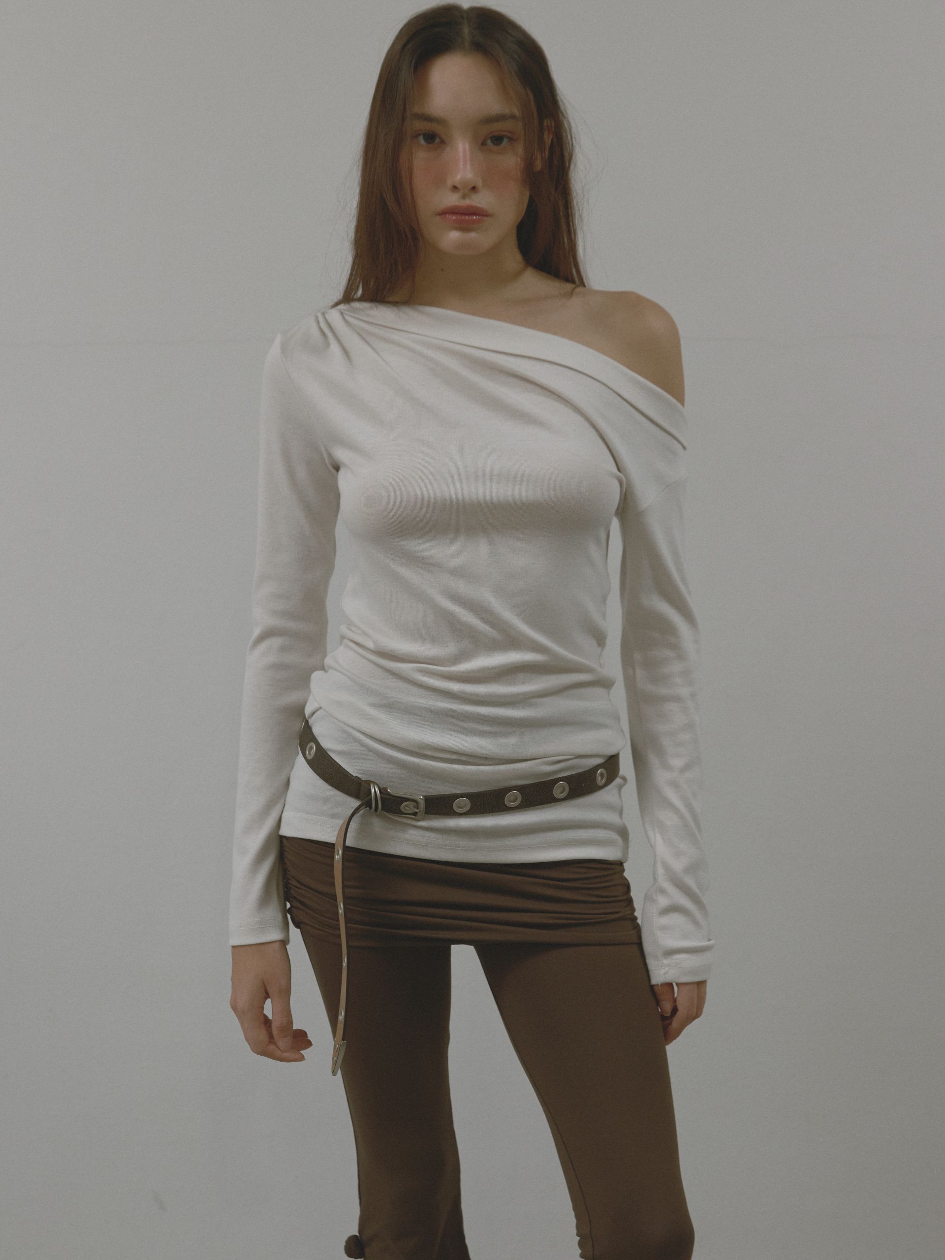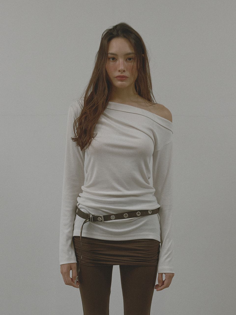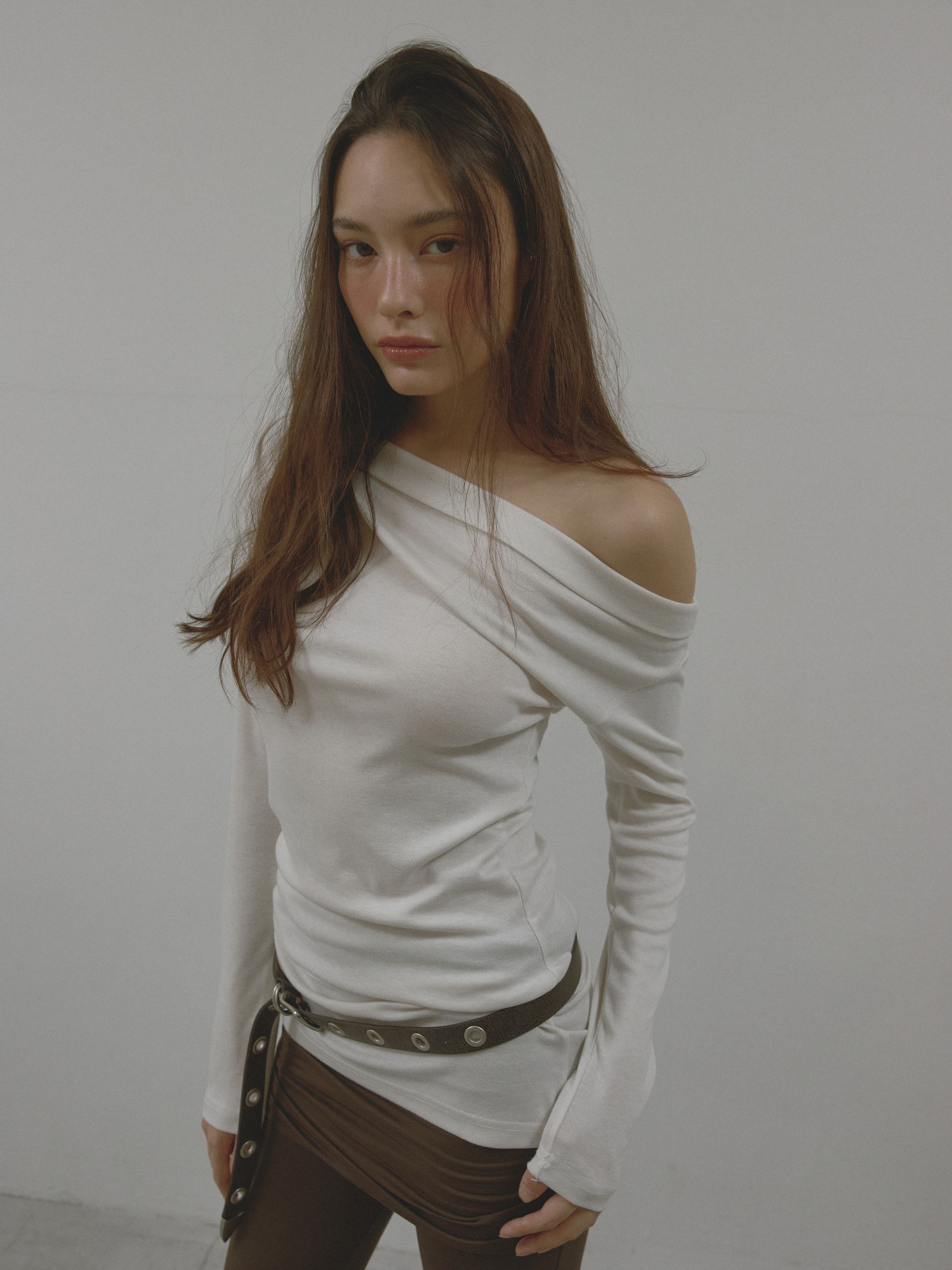 자연스럽게 흐르는 드레이프 라인과 얇은 원단감으로 페미닌한 무드를 연출해주는 원숄더 티셔츠.