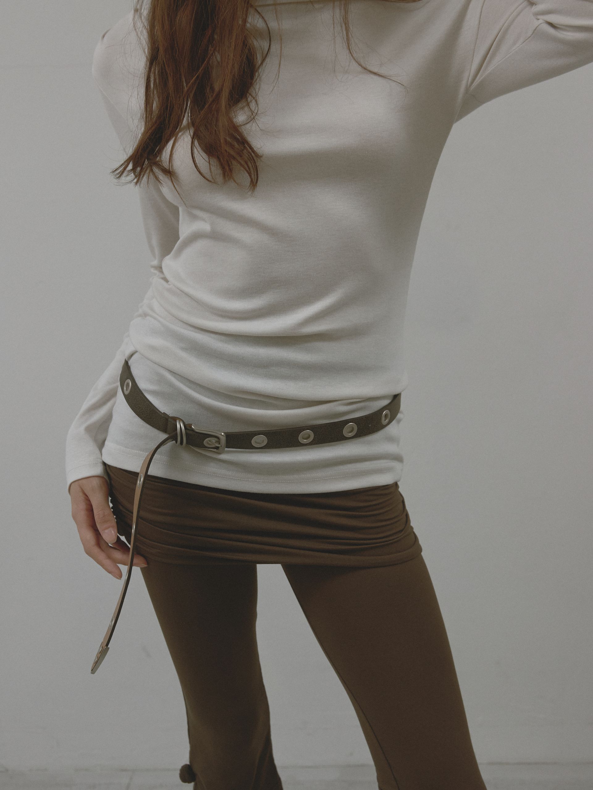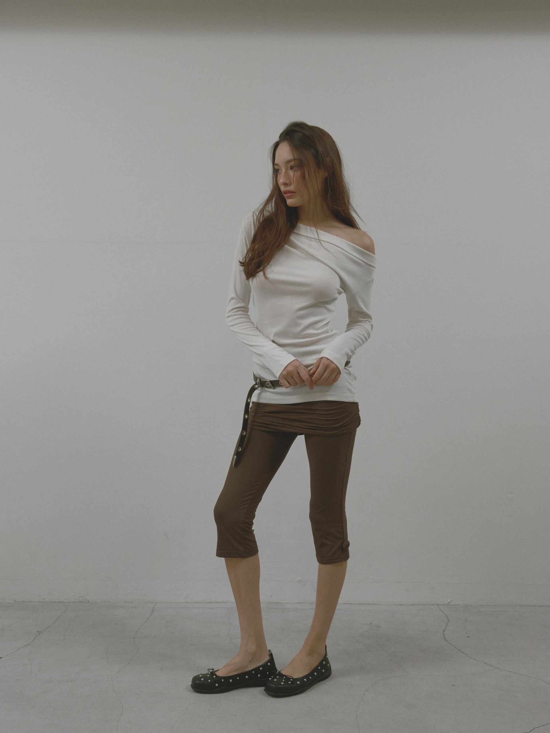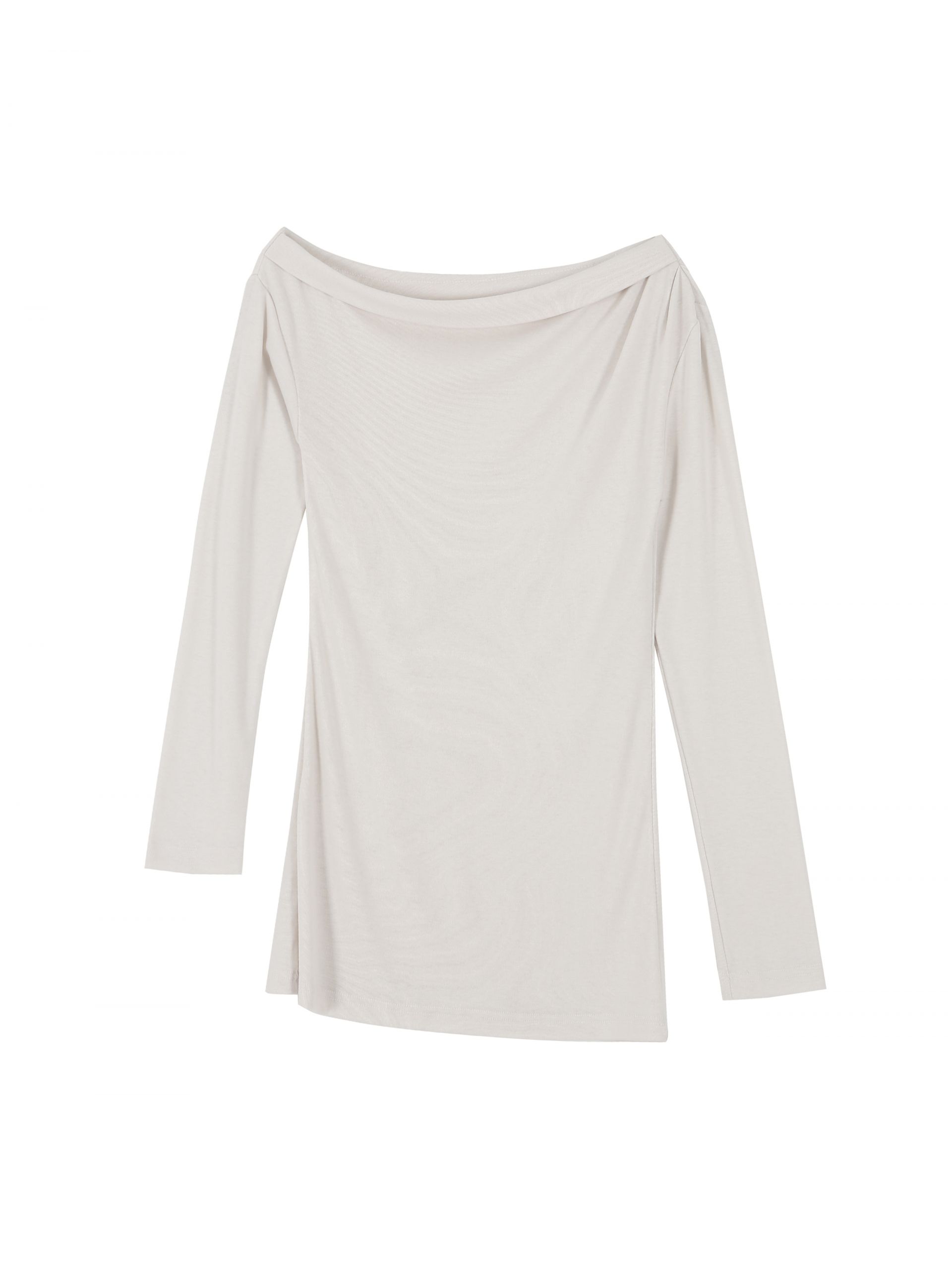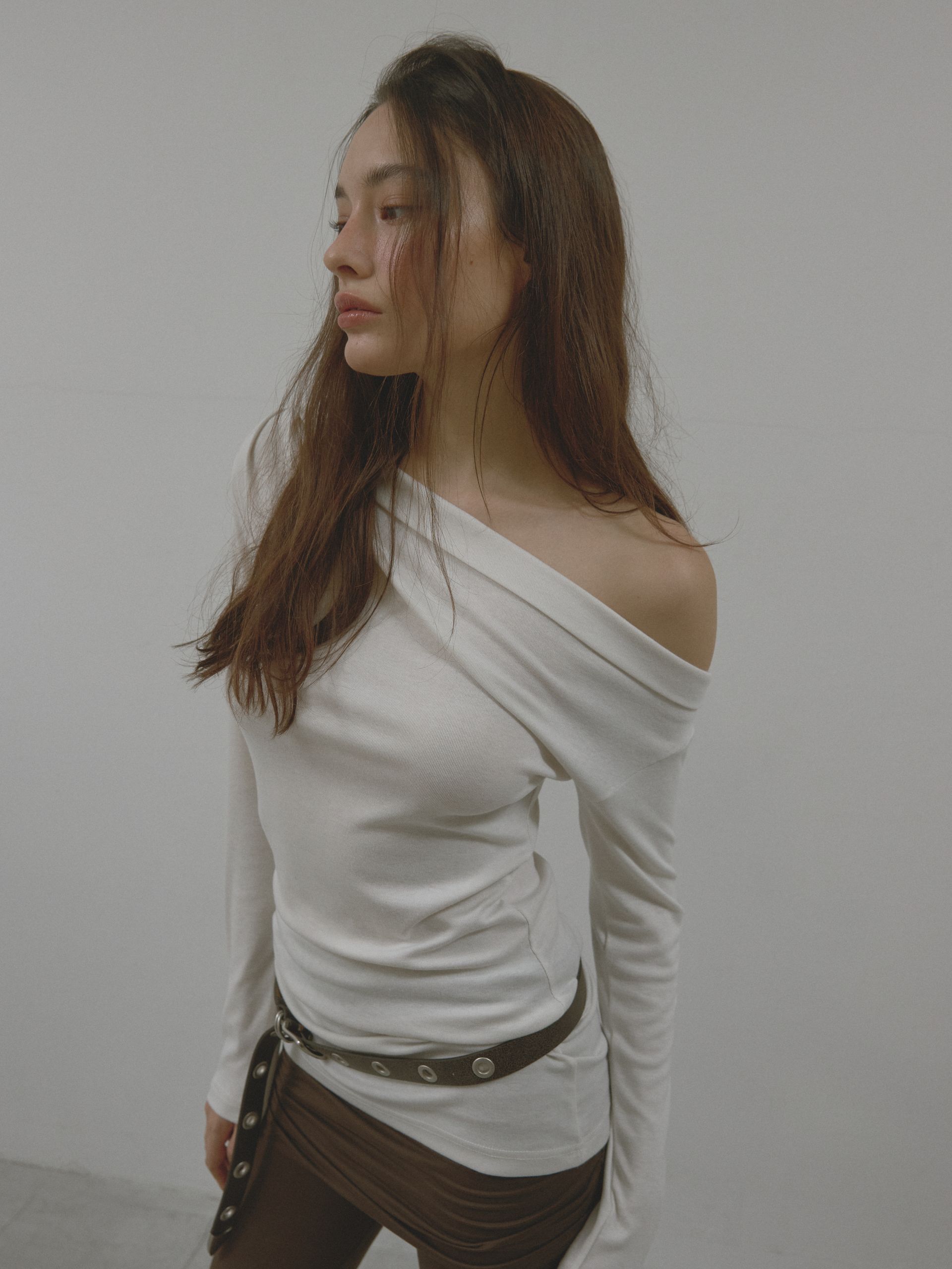 자연스럽게 흐르는 드레이프 라인과 얇은 원단감으로 페미닌한 무드를 연출해주는 원숄더 티셔츠.