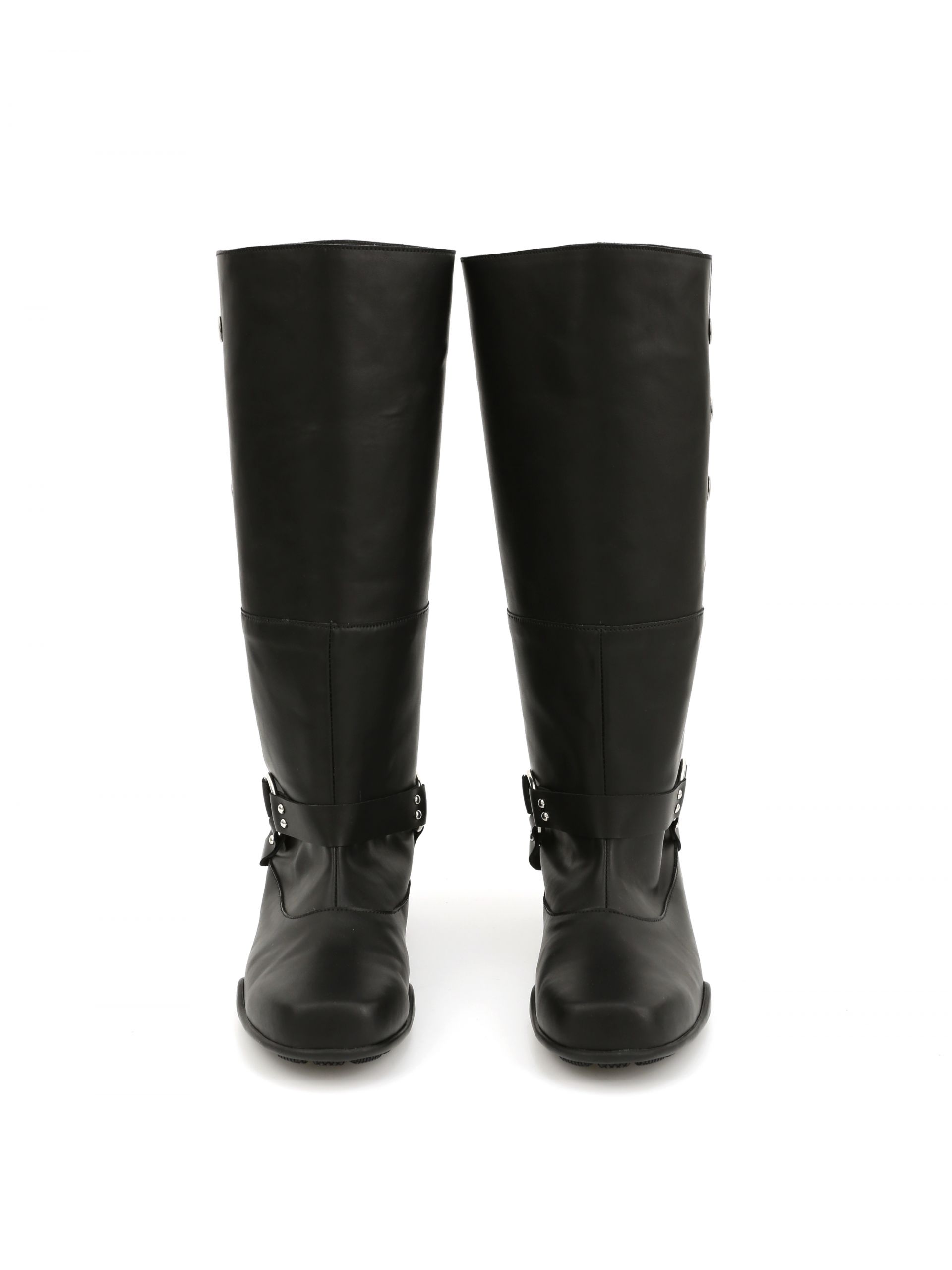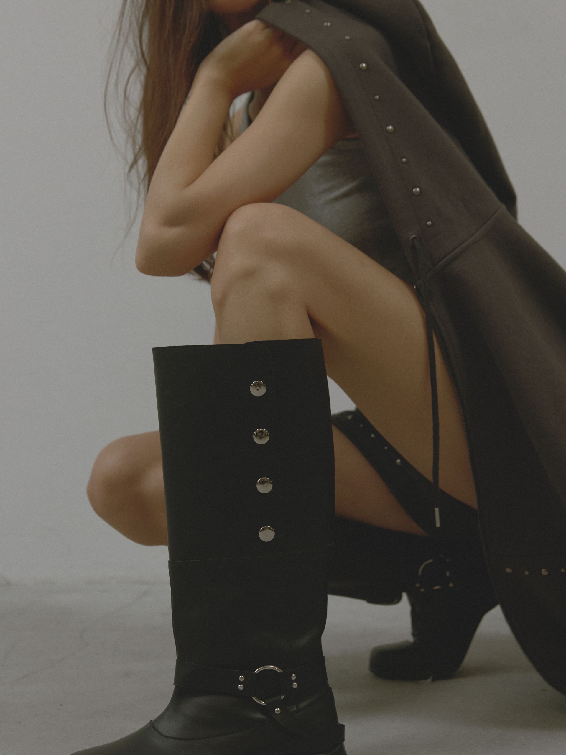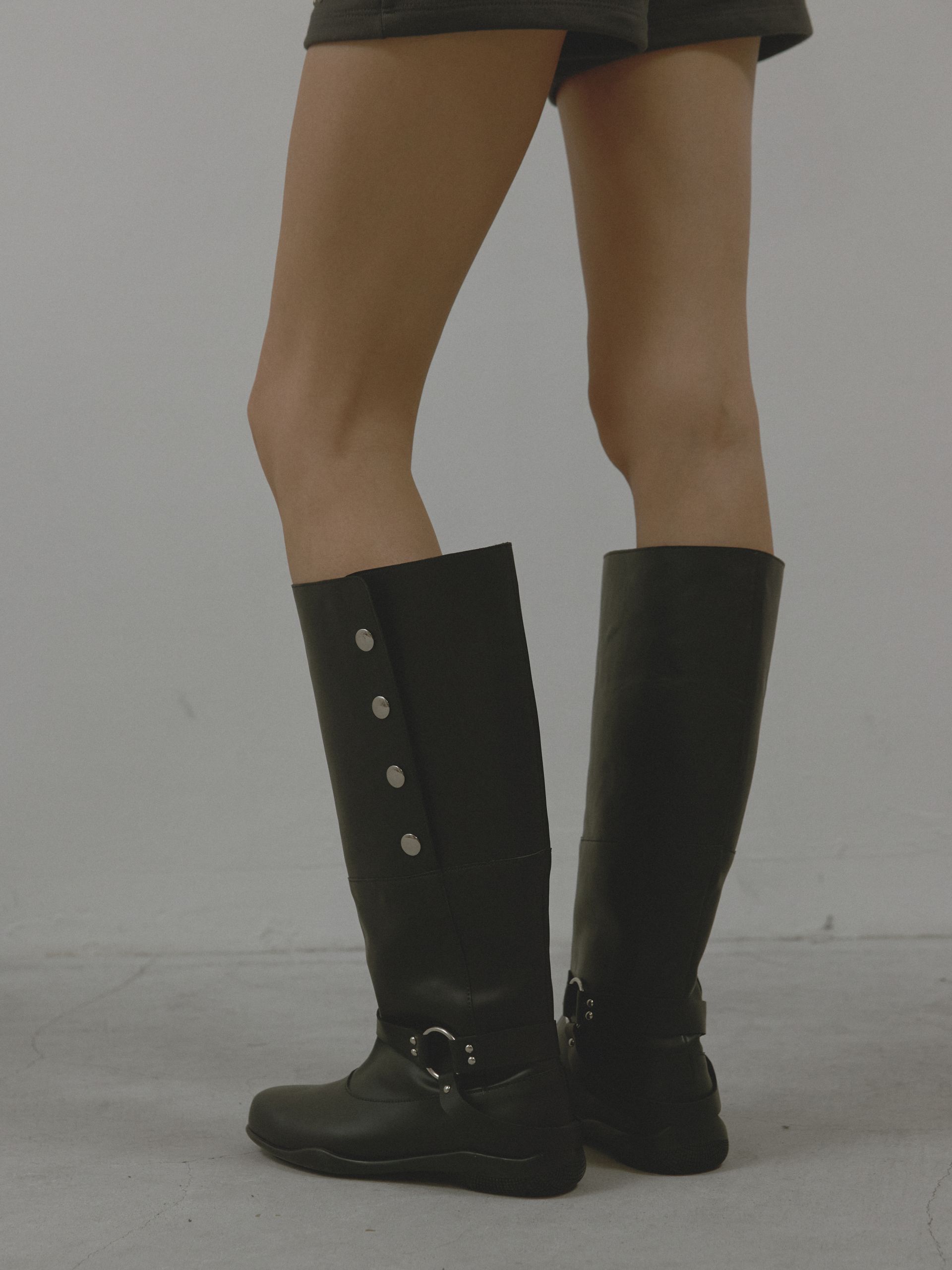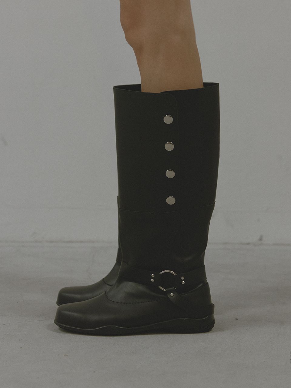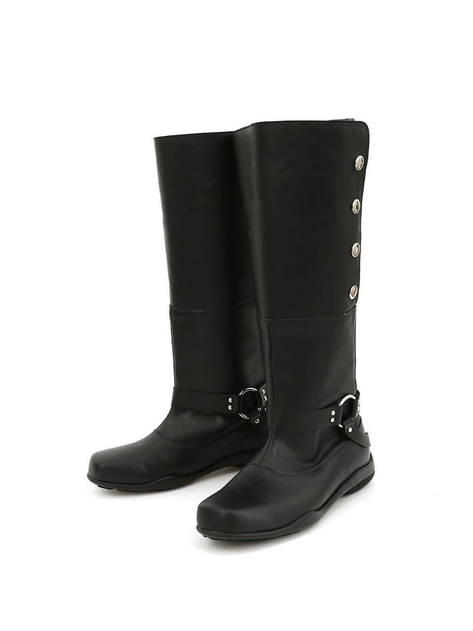 사이드 버튼 디테일과 발등의 스트랩 장식 디테일로 포인트를 더한 레더 롱부츠.