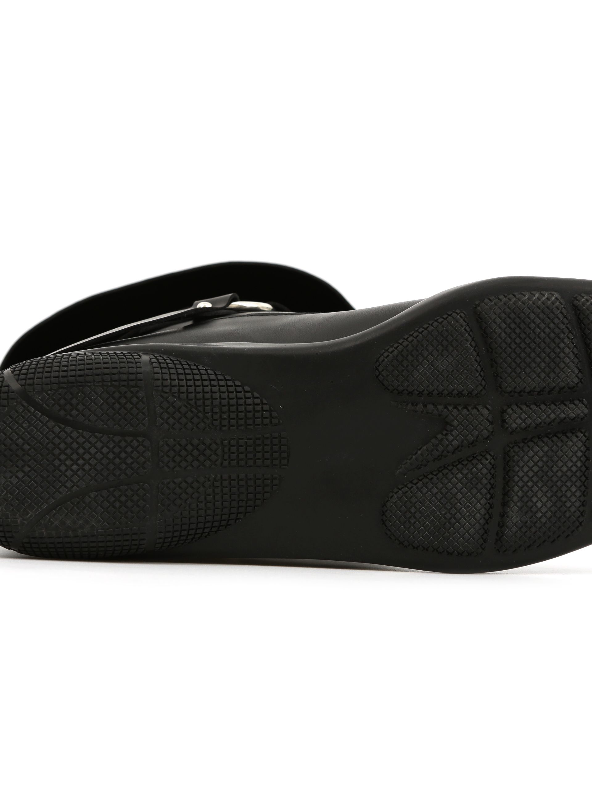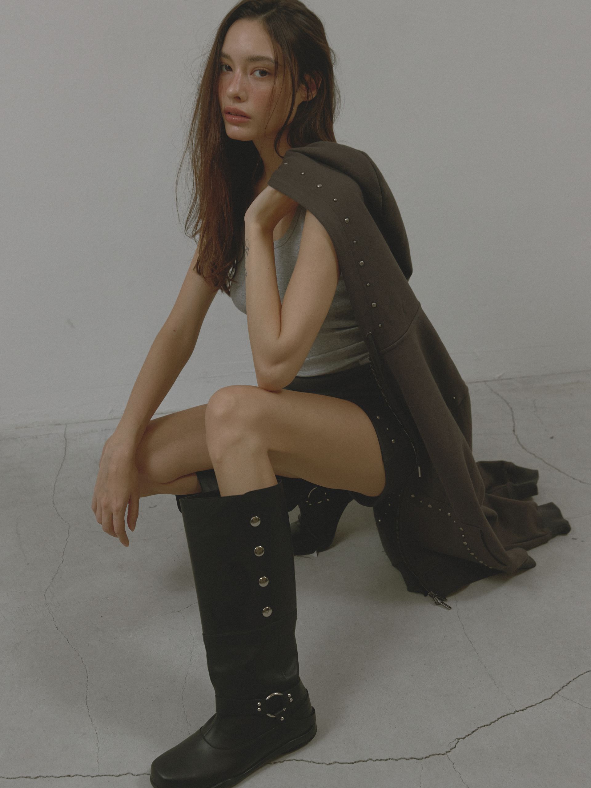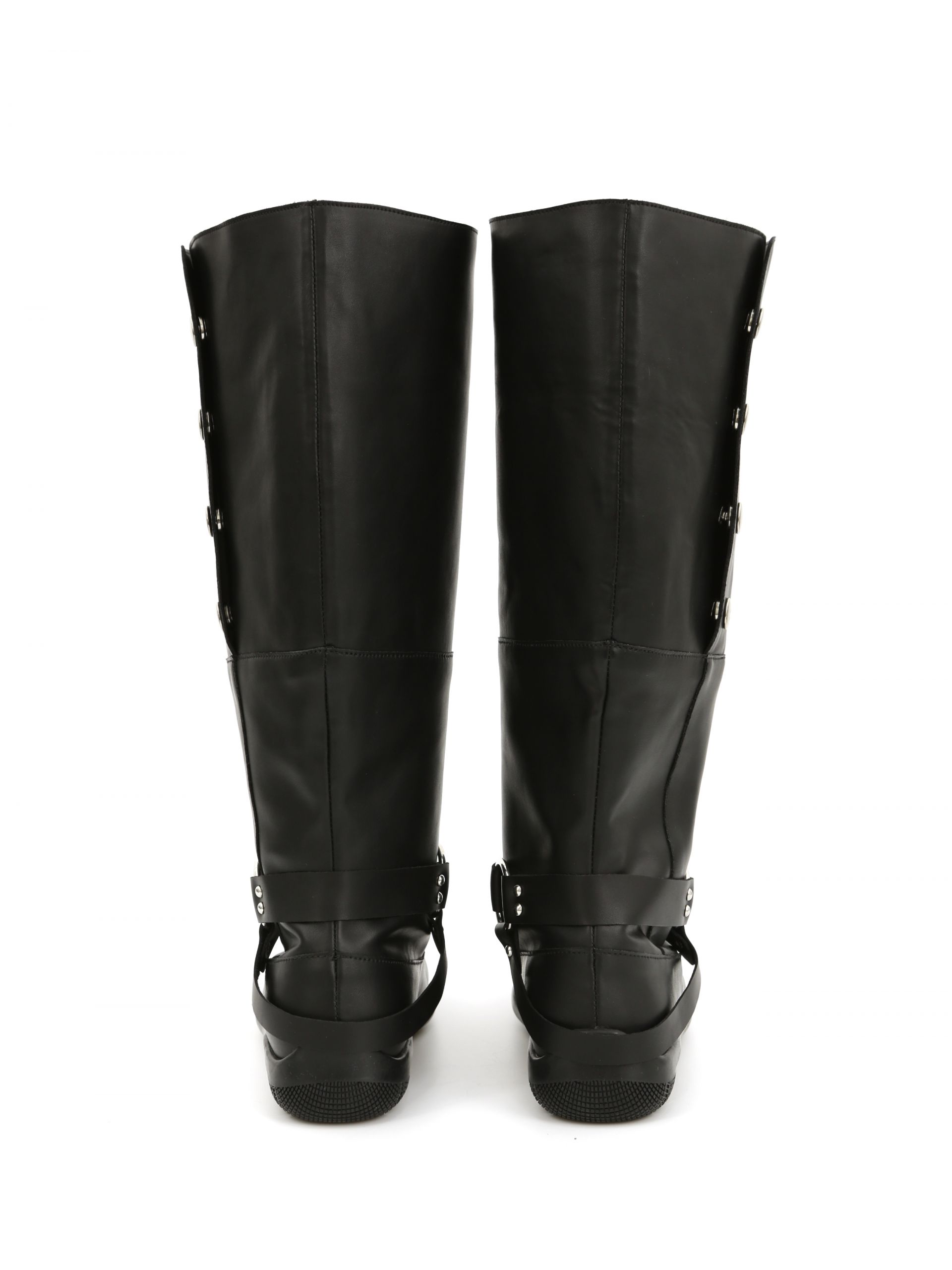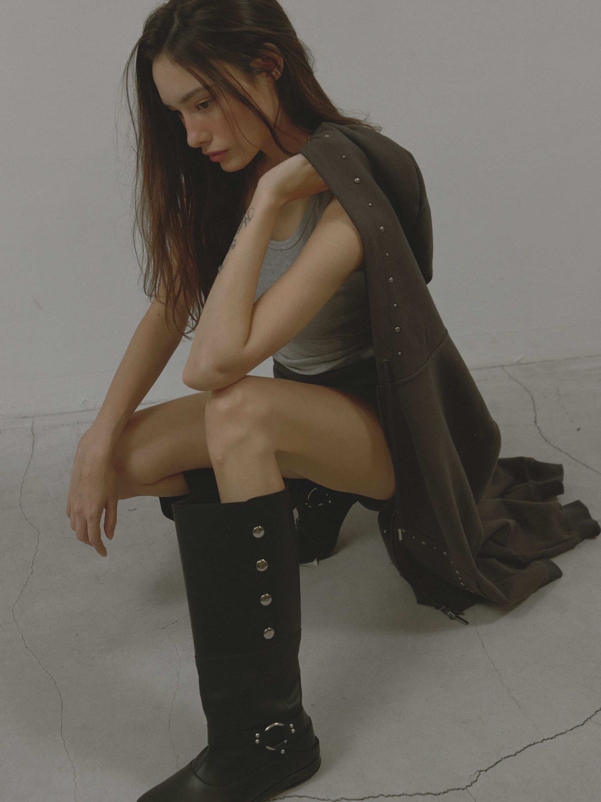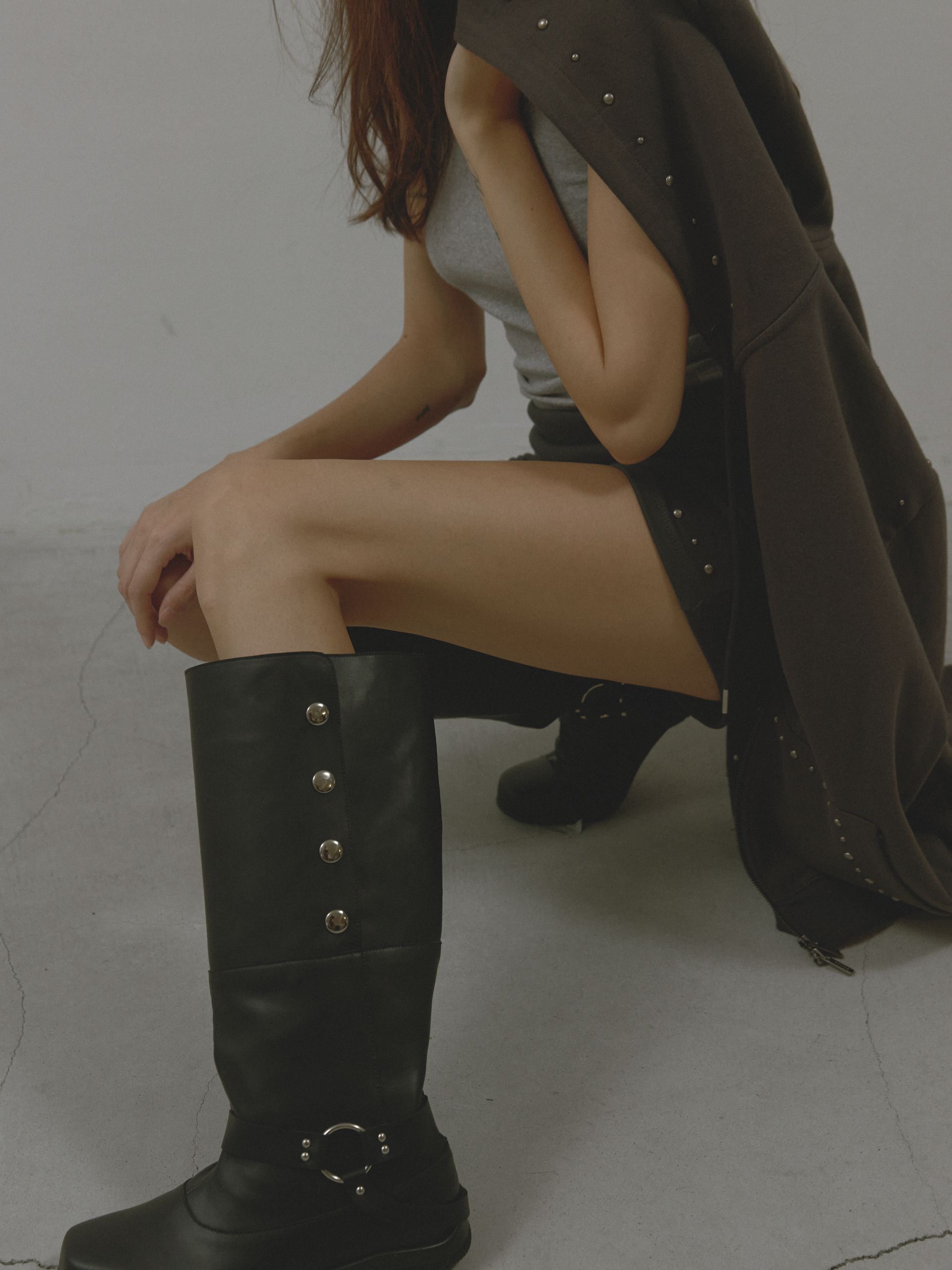 사이드 버튼 디테일과 발등의 스트랩 장식 디테일로 포인트를 더한 레더 롱부츠.