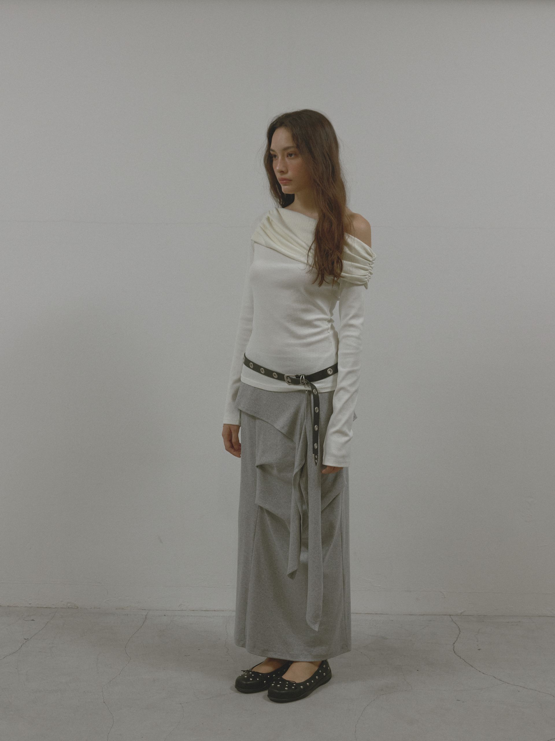 넓게 드러나는 쇄골 라인과 풍성한 셔링이 고급스러운 분위기를 줍니다.