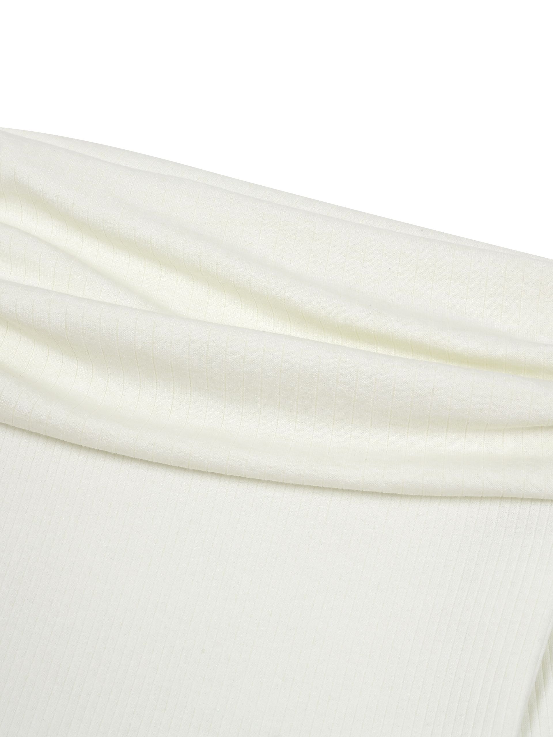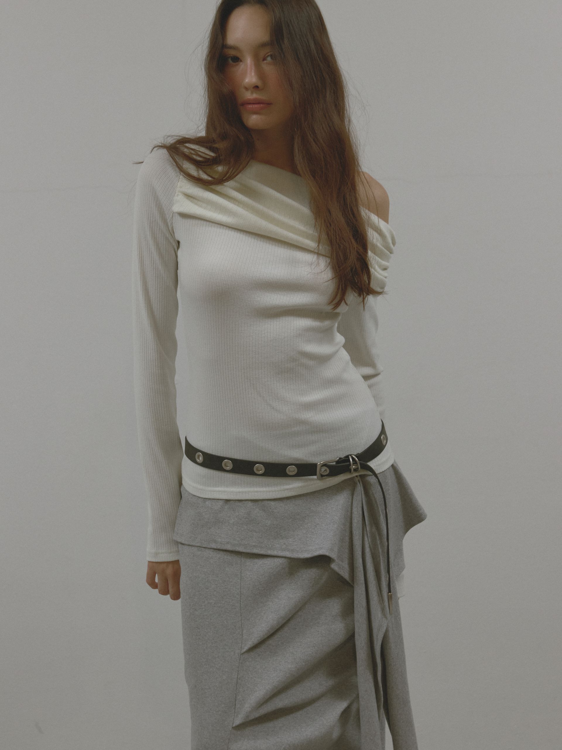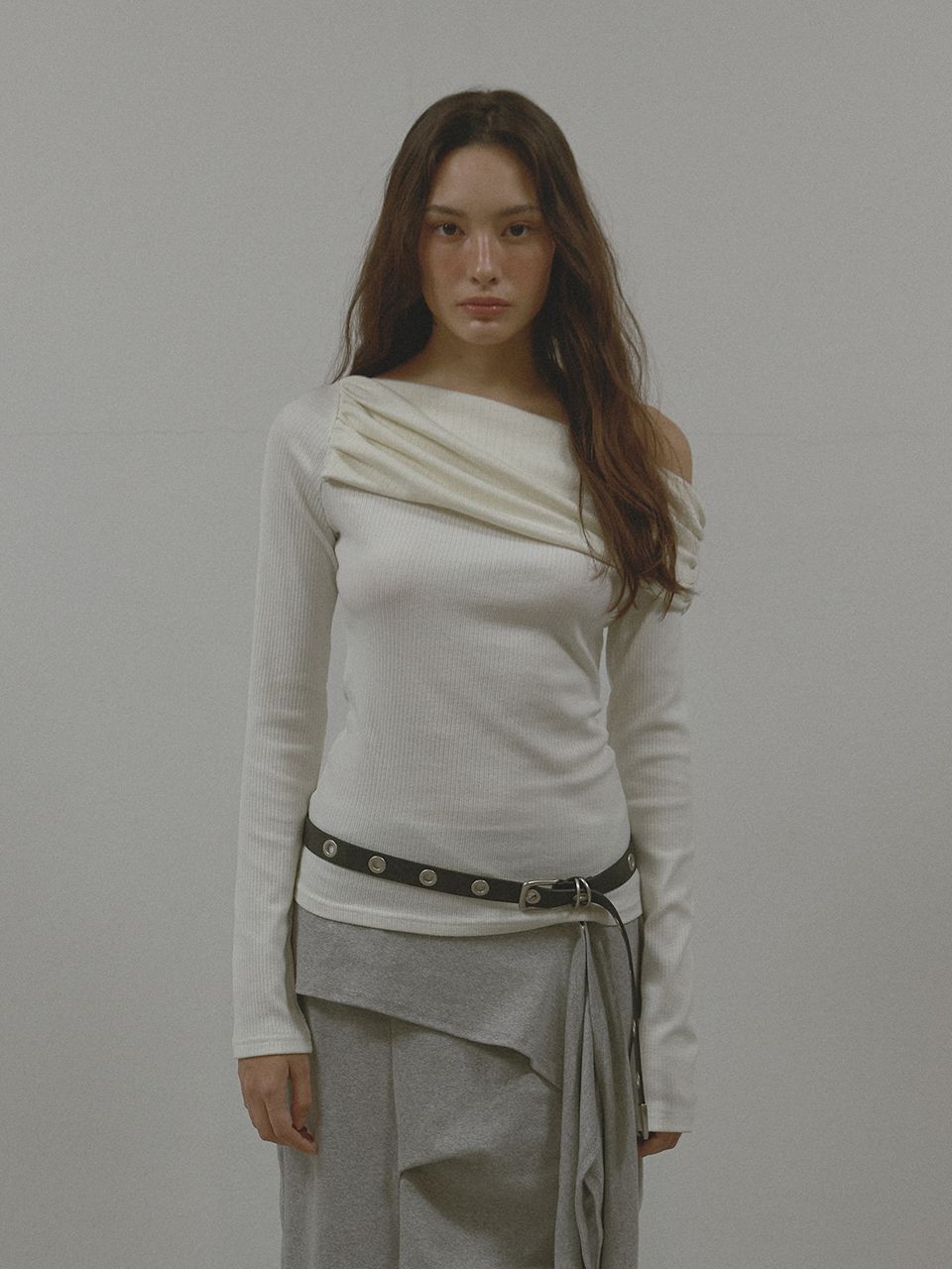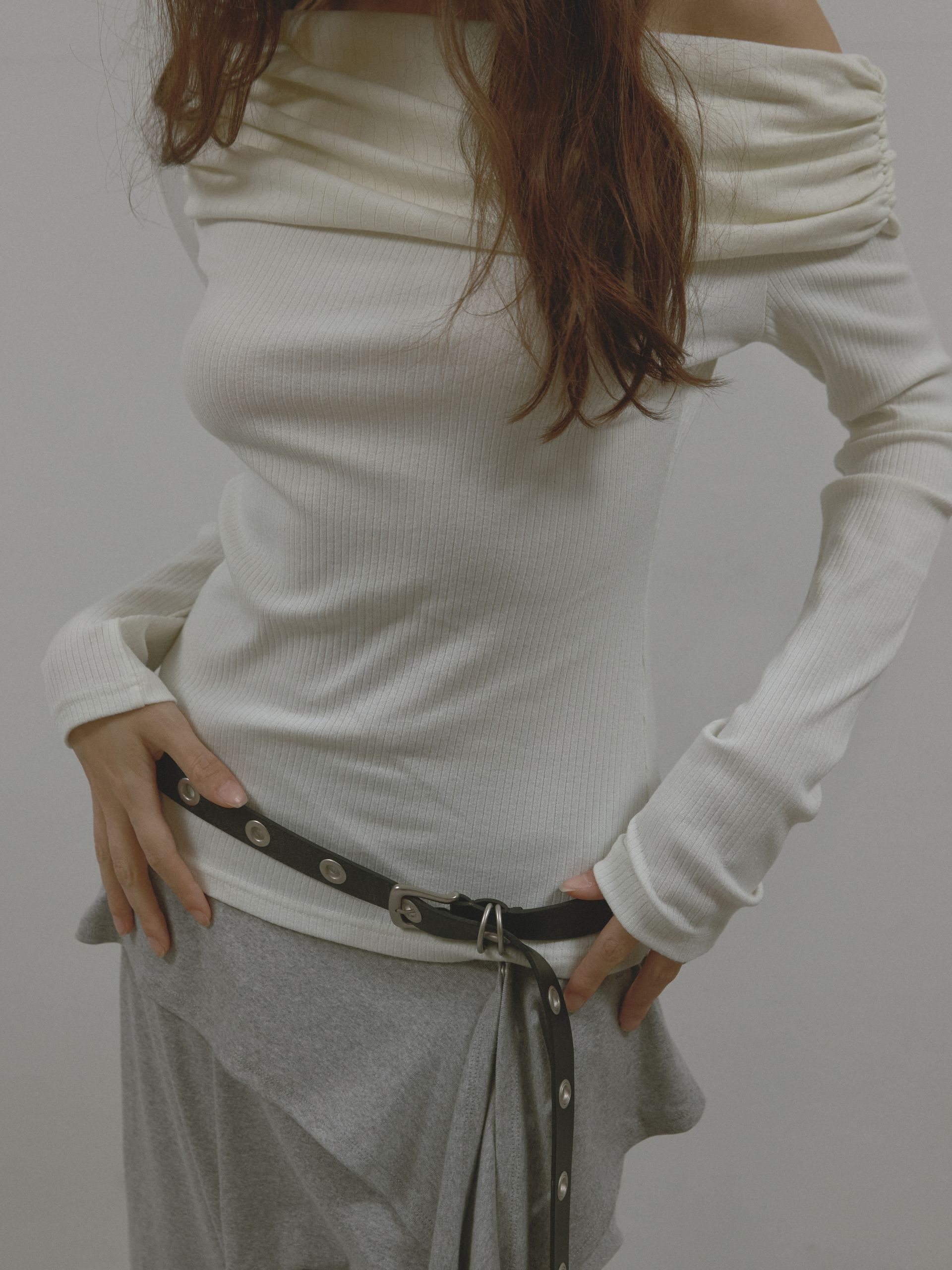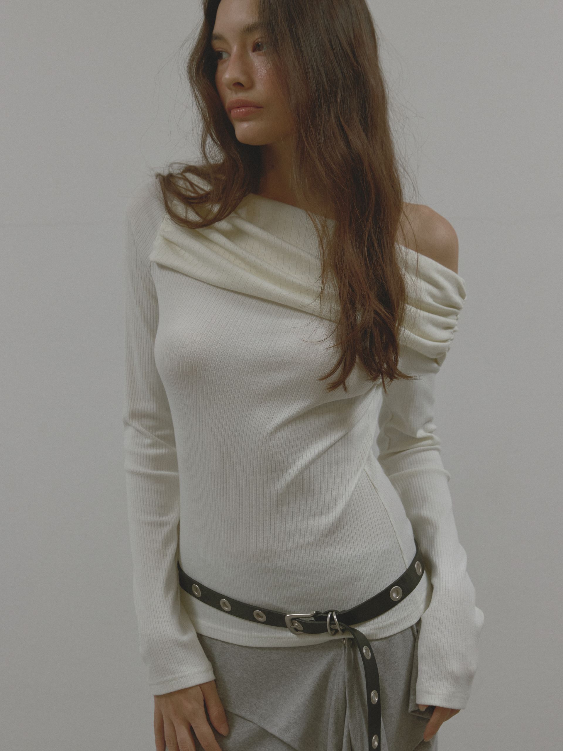 넥 라인을 따라 잡힌 셔링 디테일이 특징인 오프숄더 티셔츠.