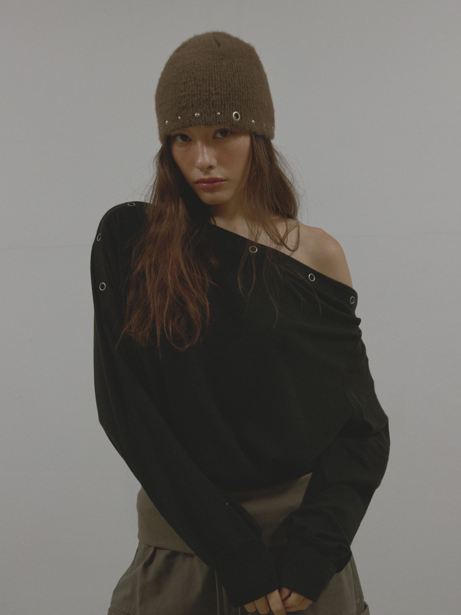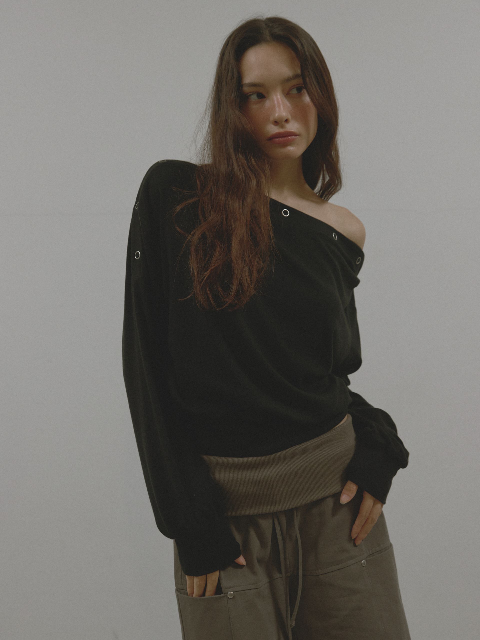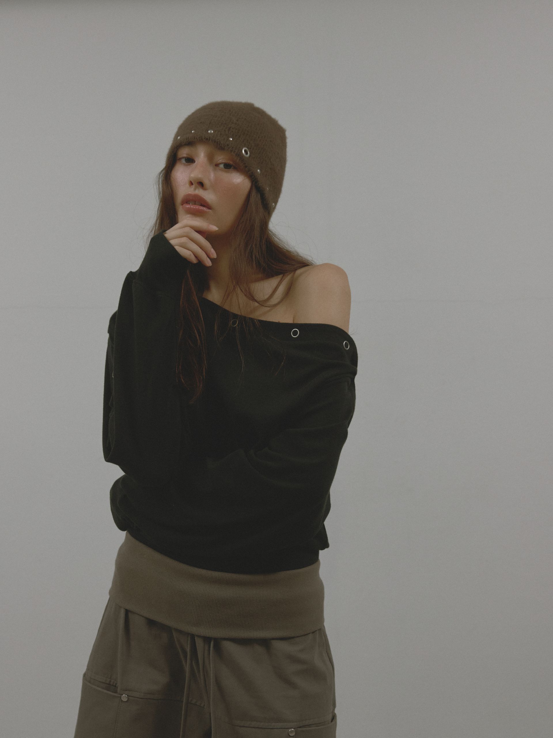 넥 라인 스냅 디테일로 오프숄더 실루엣까지 연출 가능하며, 다양한 스타일링에 활용됩니다.