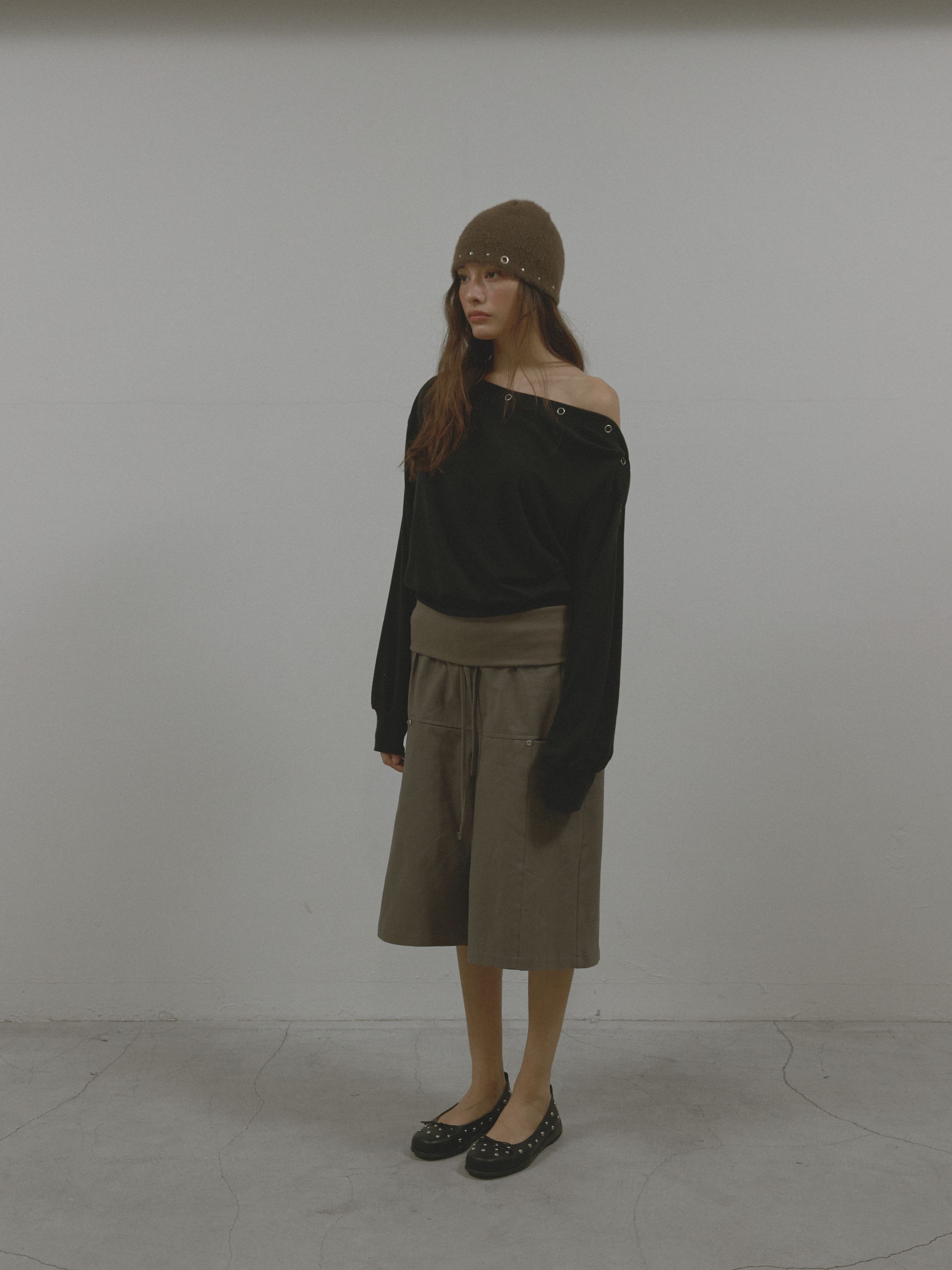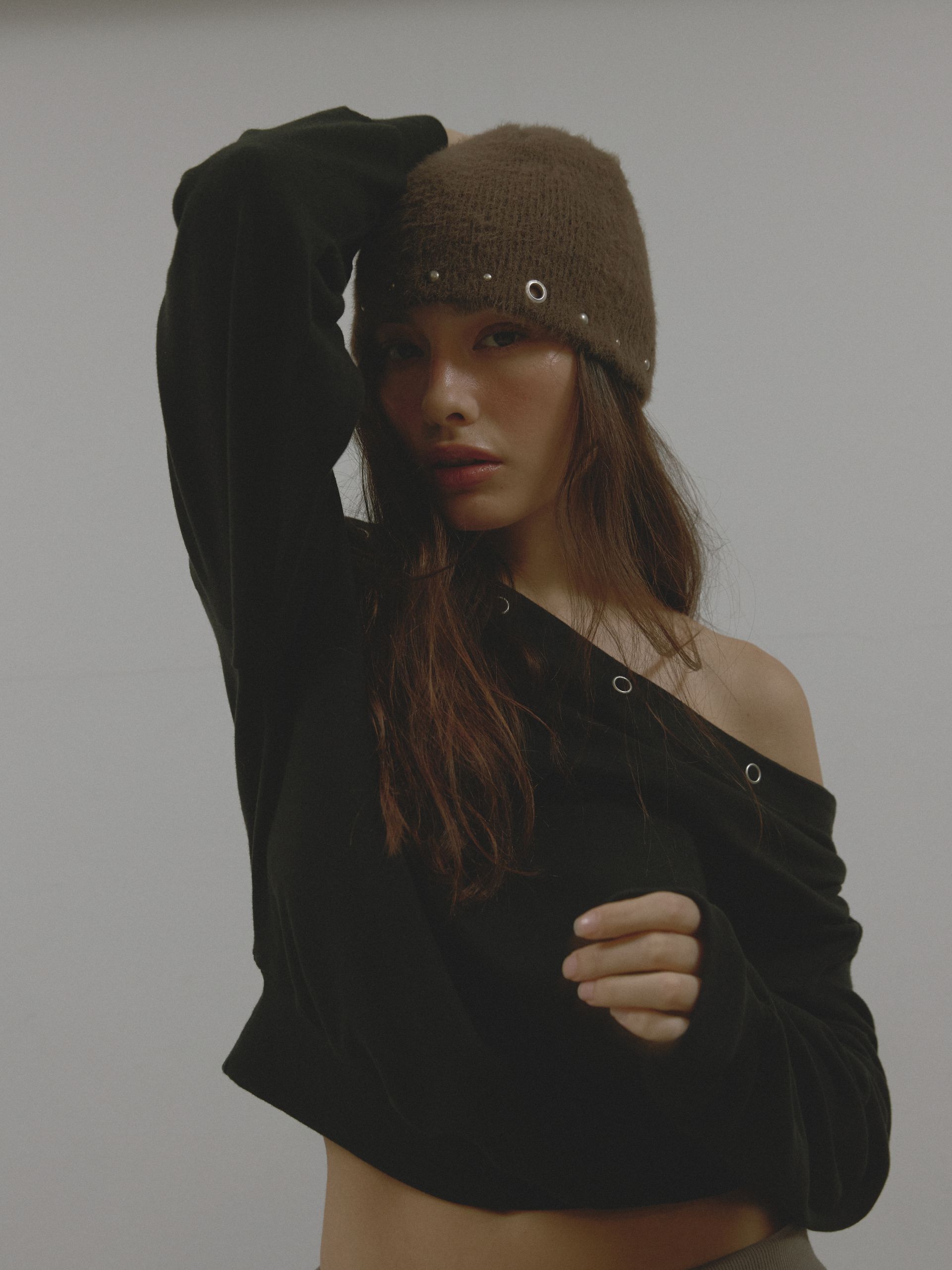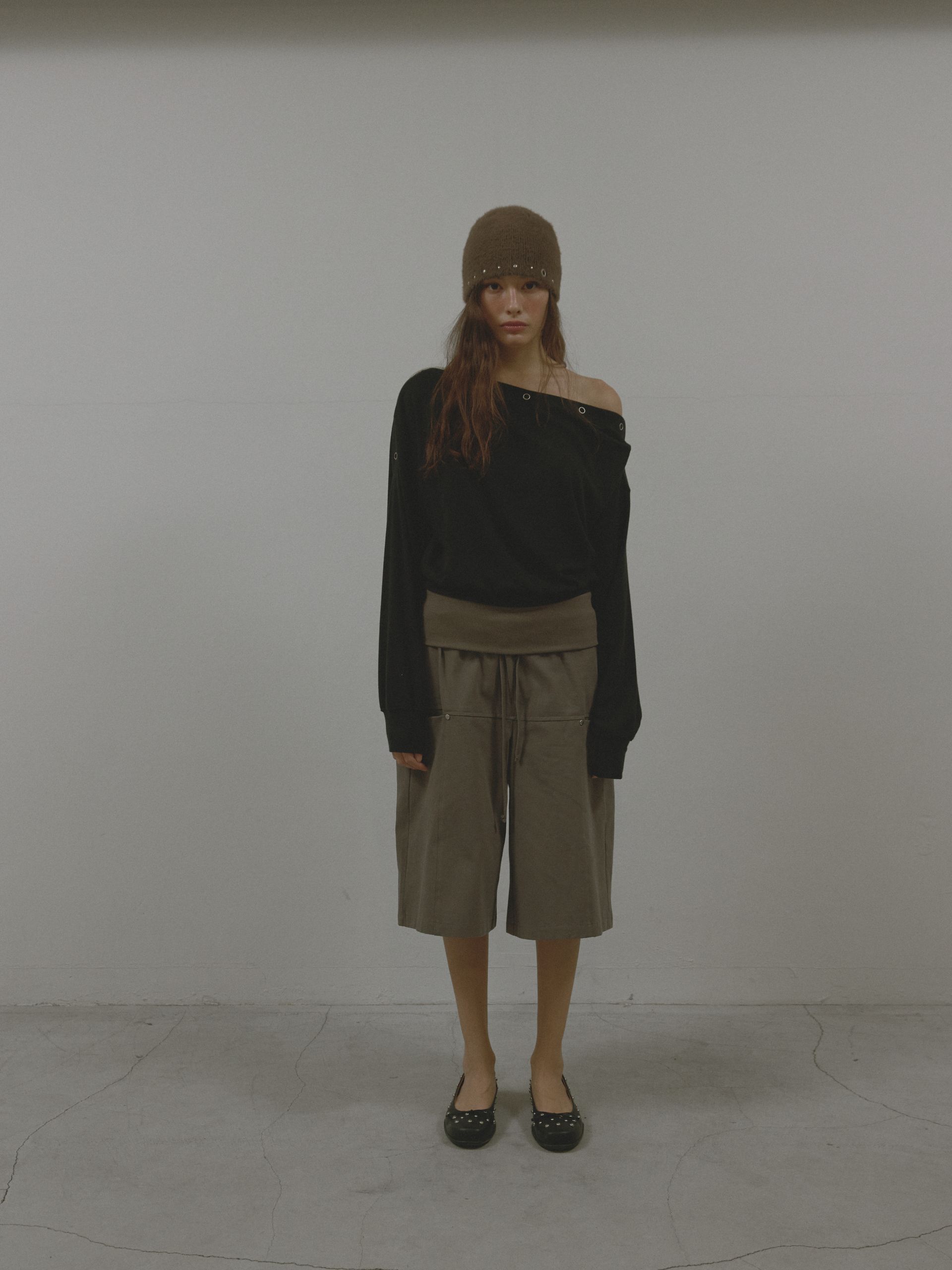 넥 라인 스냅 디테일로 오프숄더 실루엣까지 연출 가능하며, 다양한 스타일링에 활용됩니다.