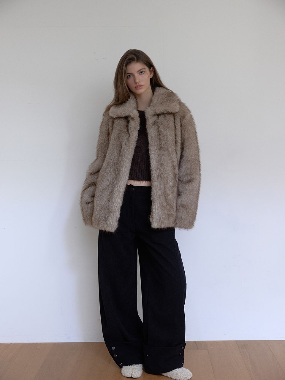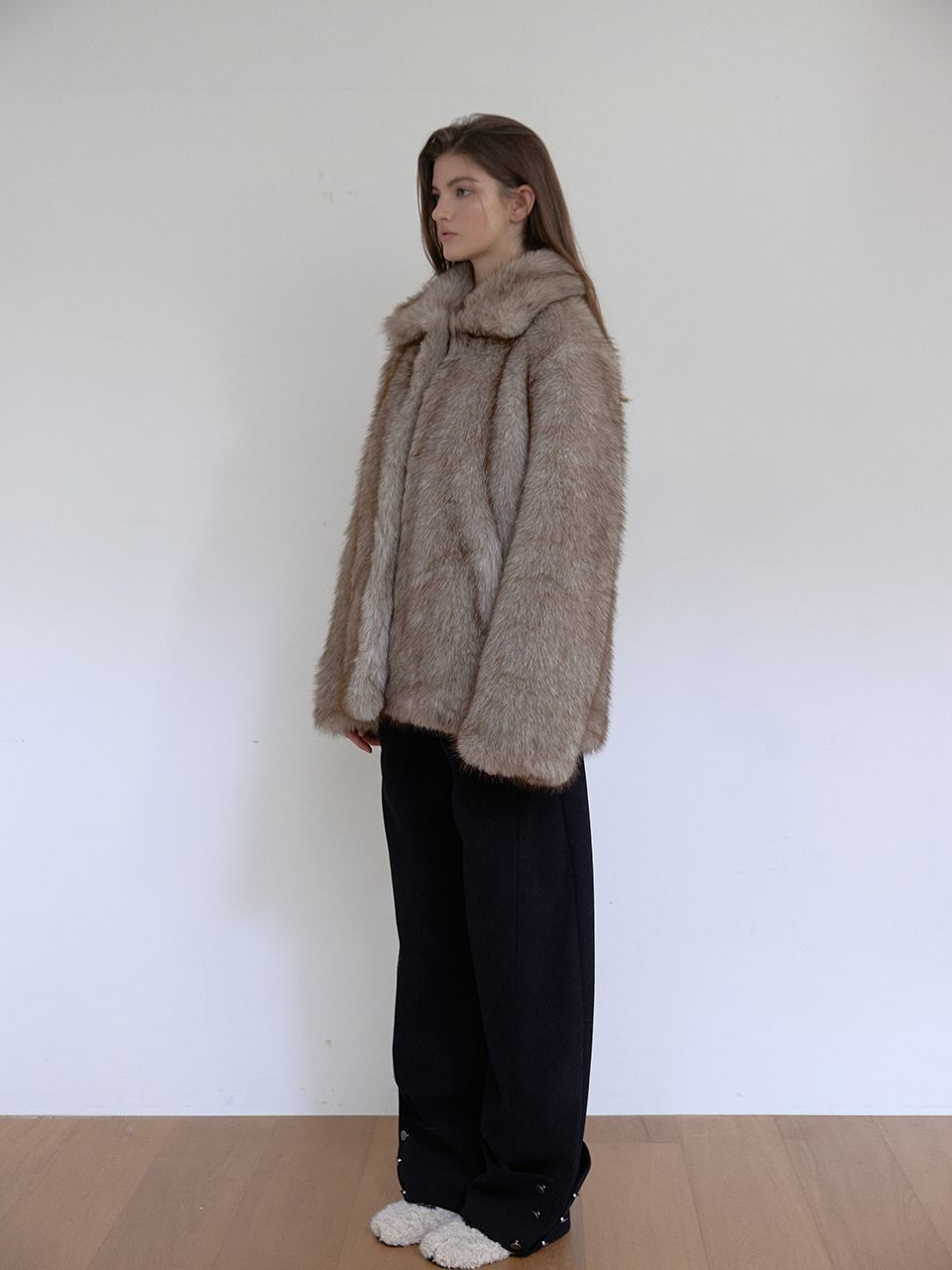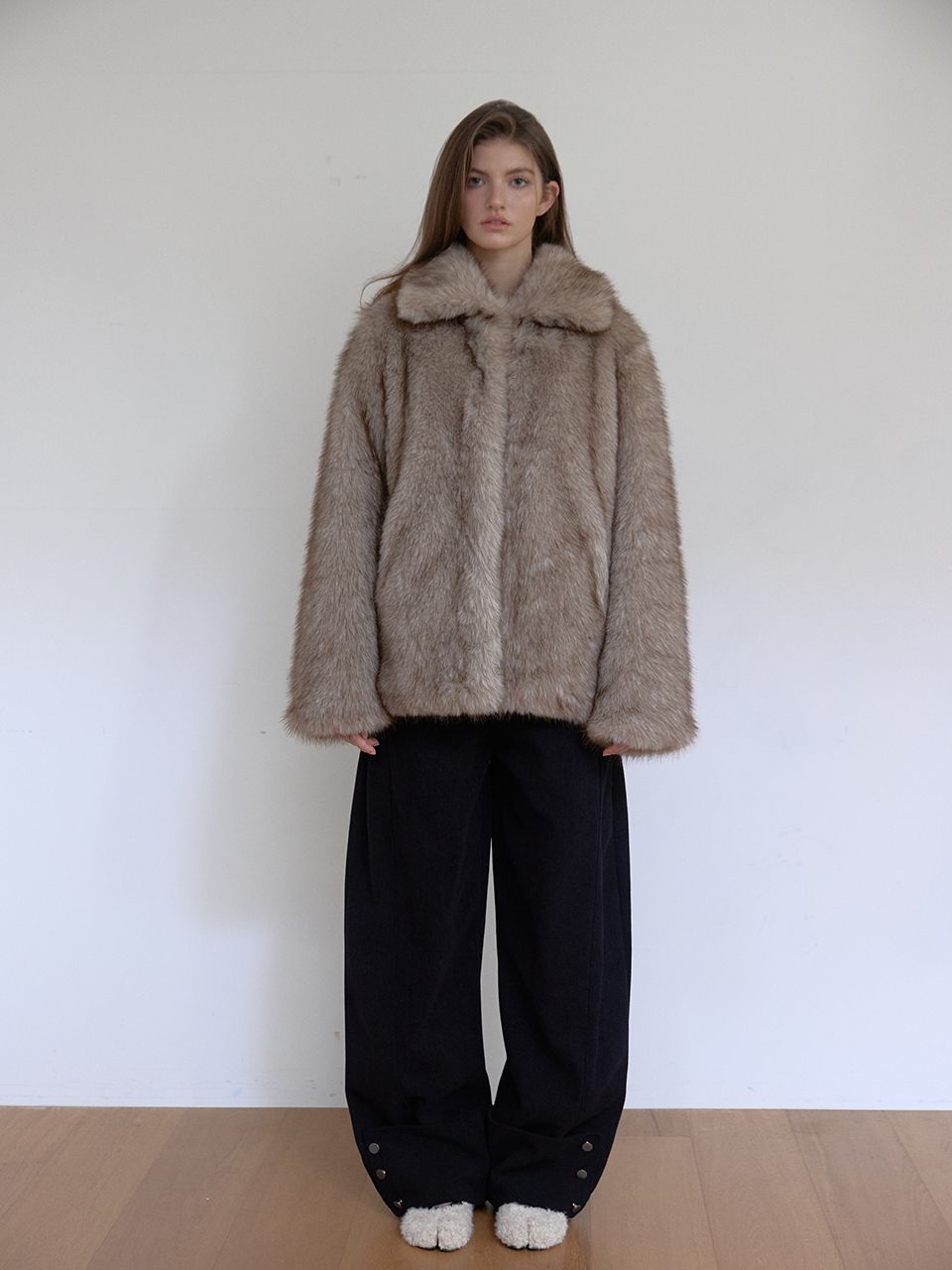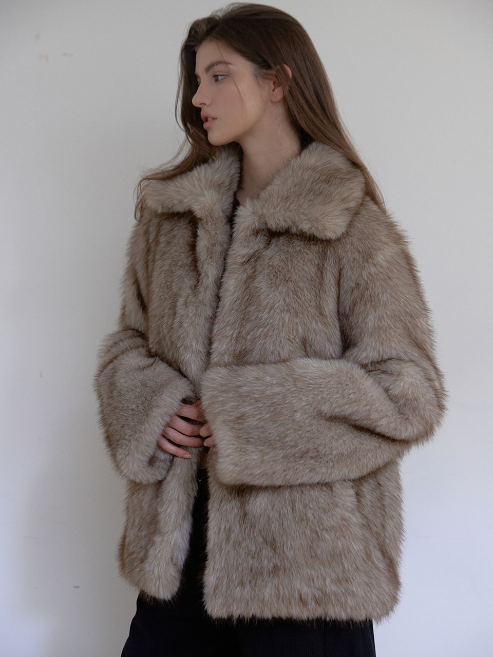 짧은 기장감으로 부담 없이 즐길 수 있는 미니 퍼 자켓입니다.