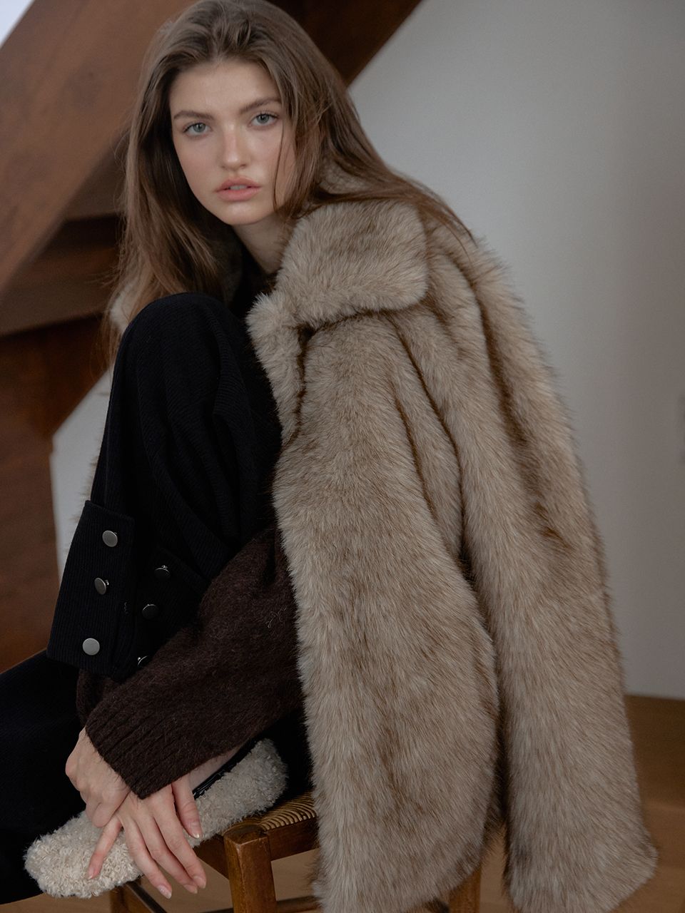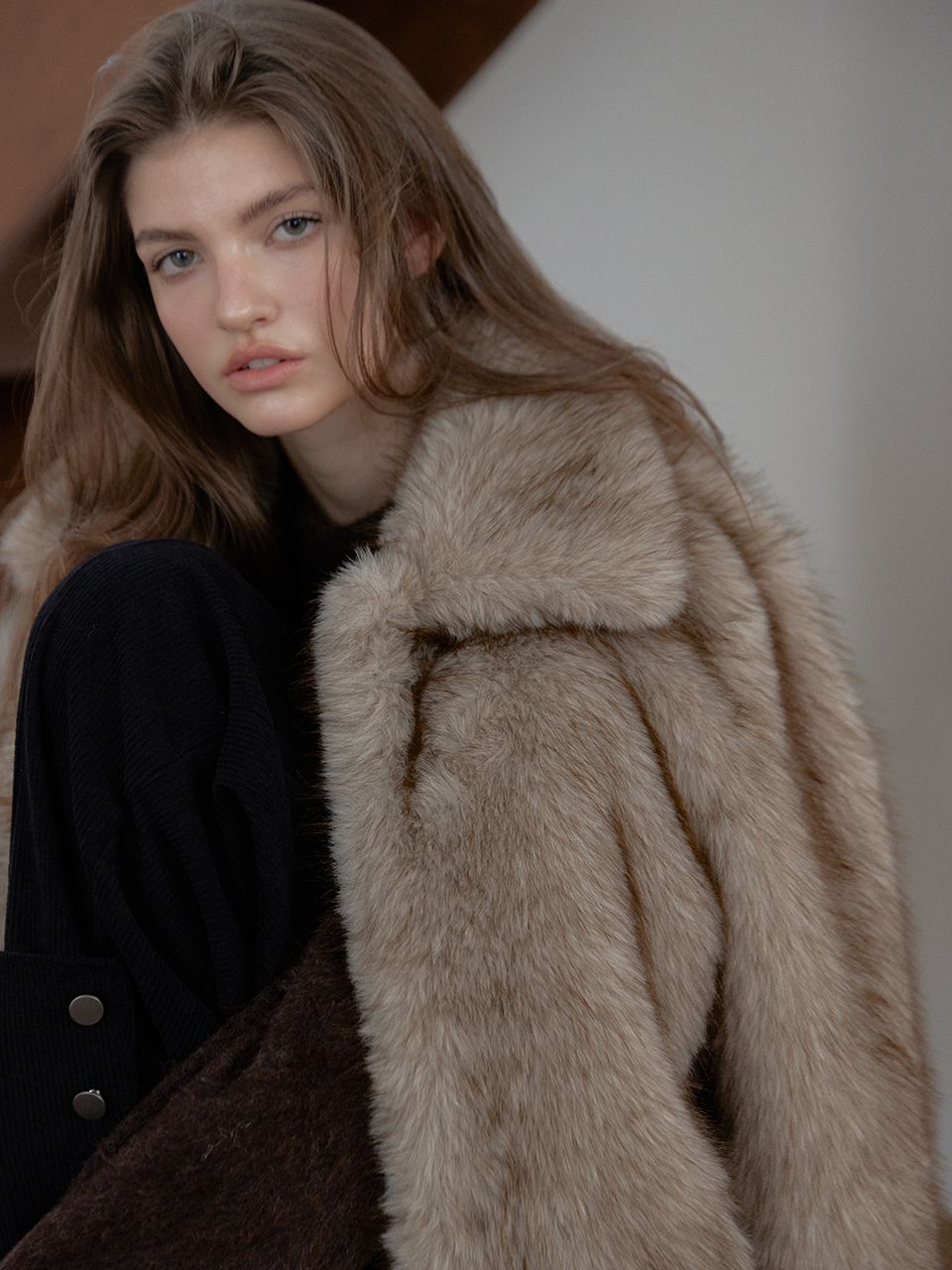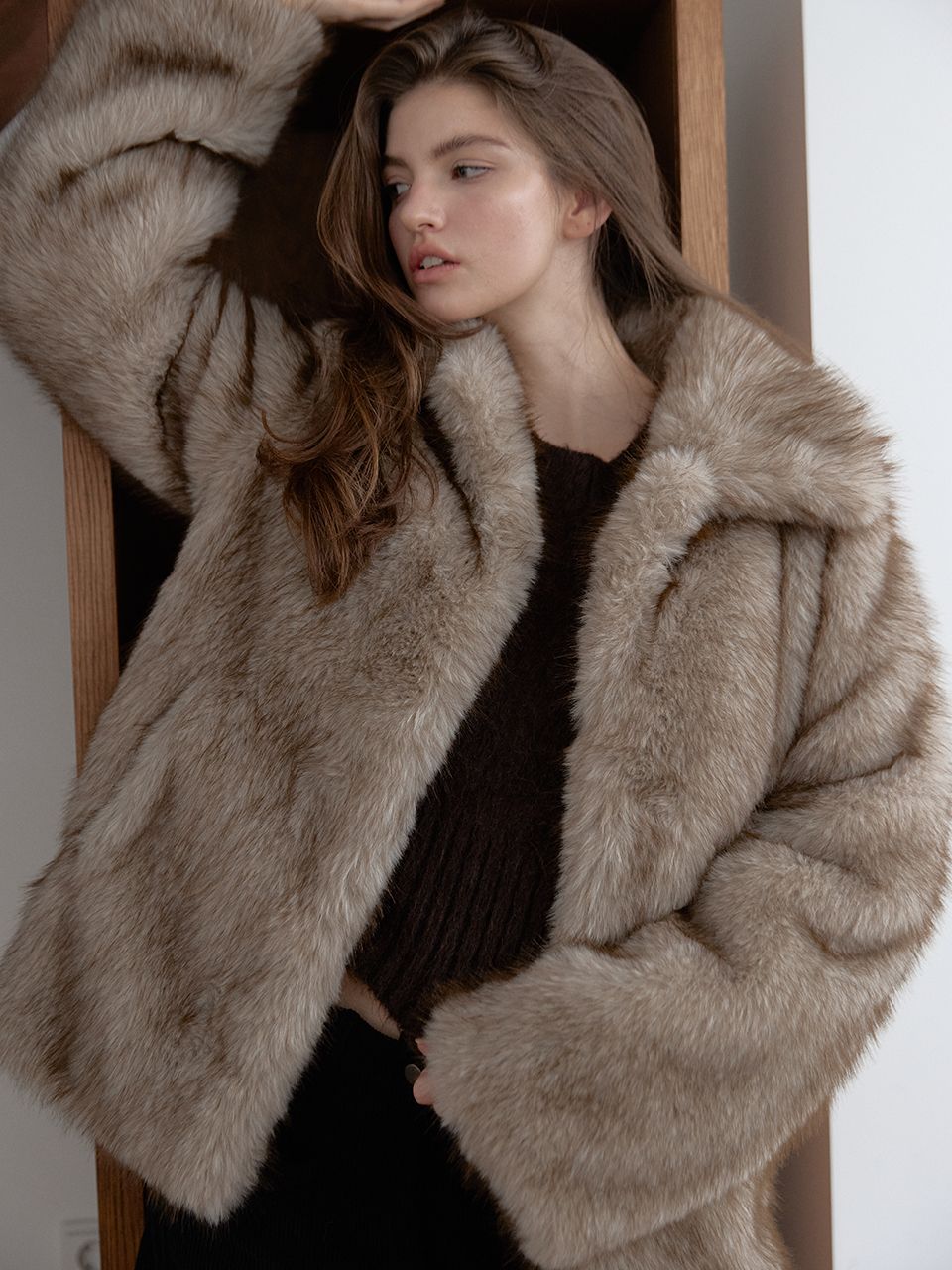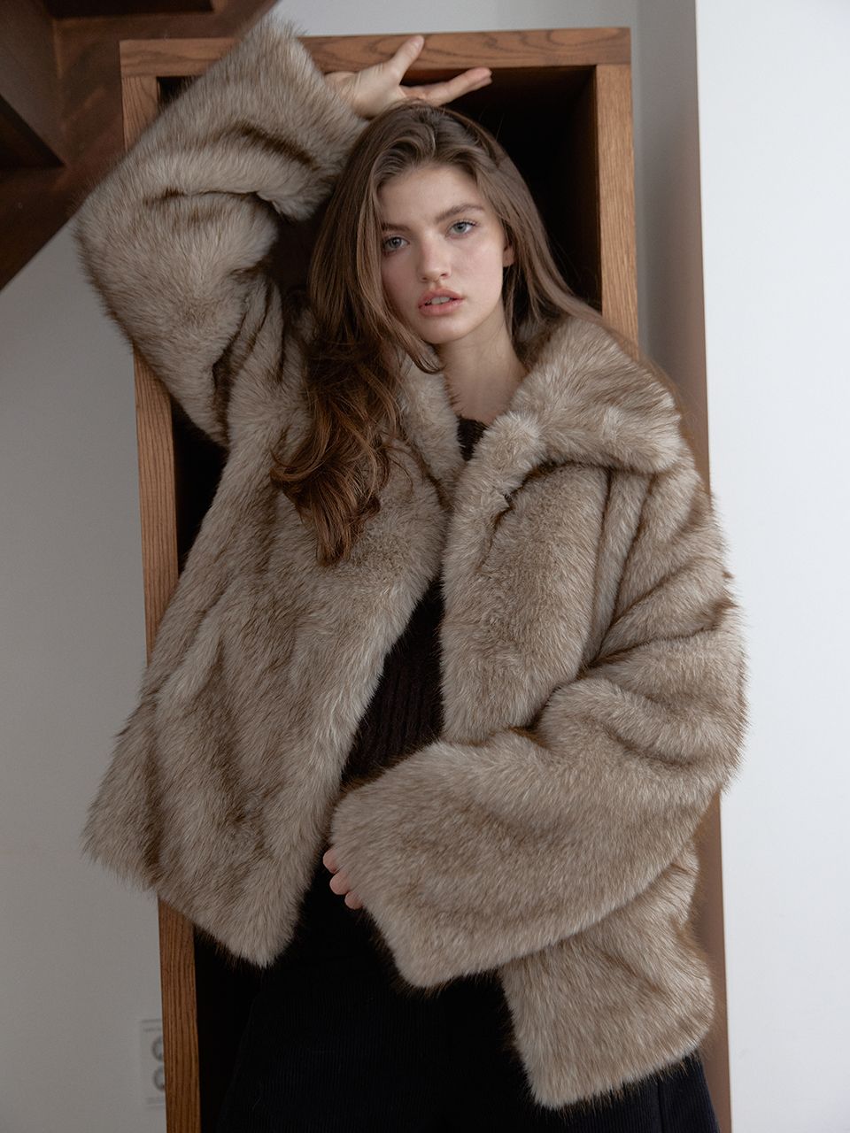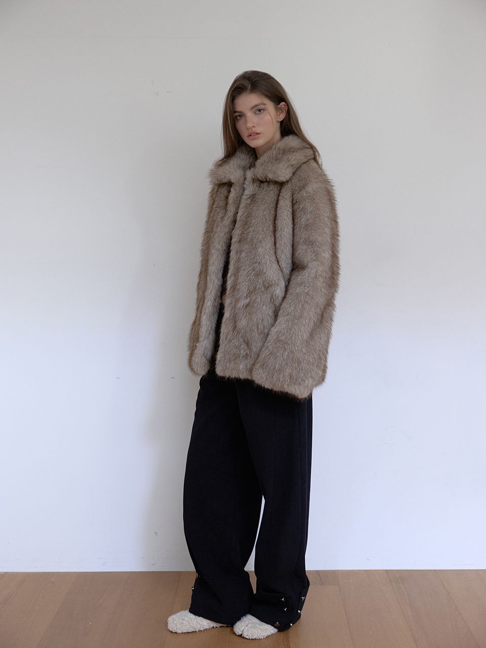 짧은 기장감으로 부담 없이 즐길 수 있는 미니 퍼 자켓입니다.