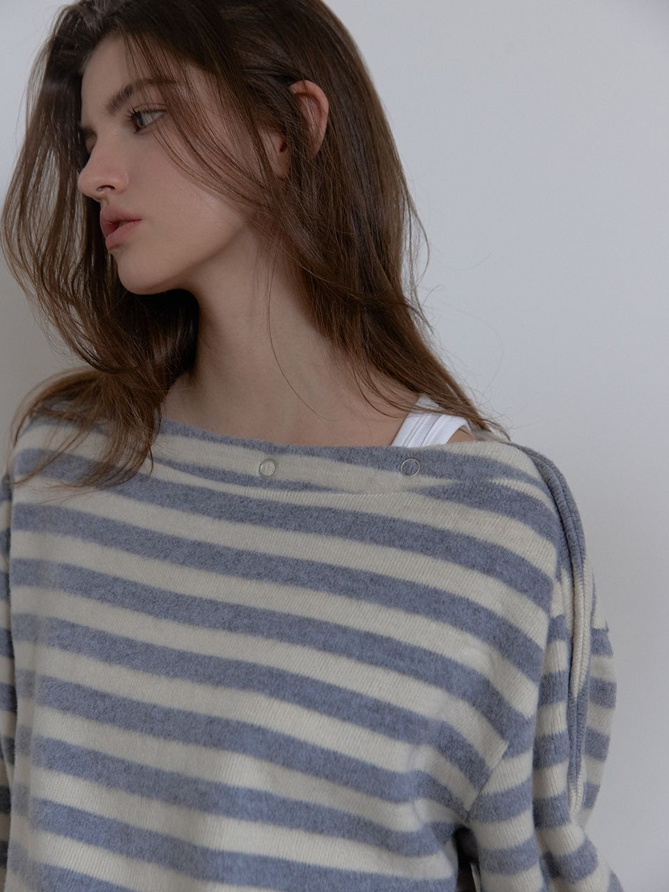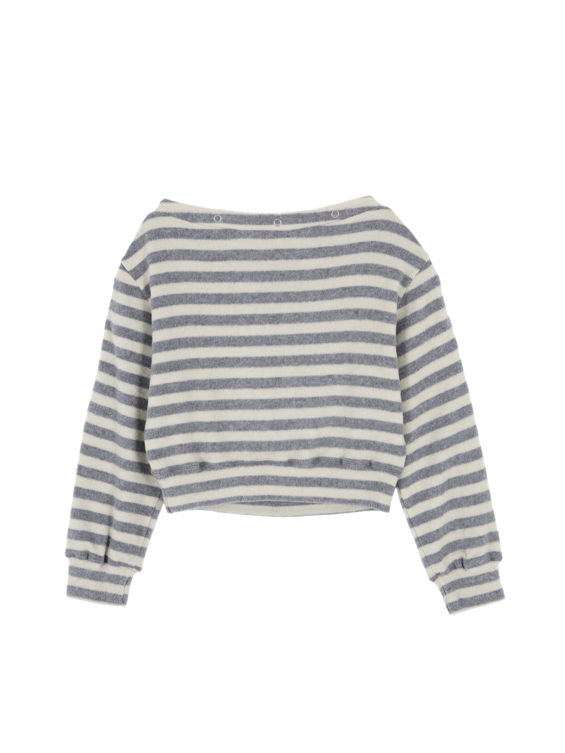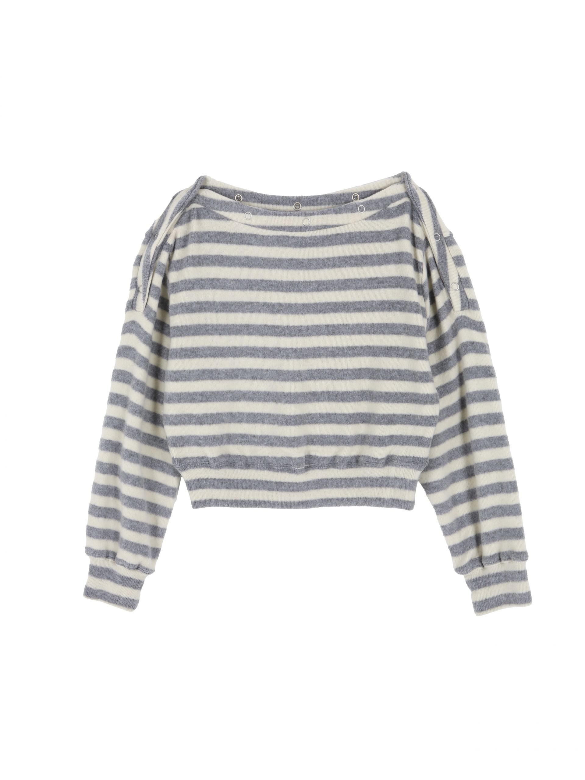 보트넥 라인에 스냅 버튼 디테일이 더해진 티셔츠입니다.