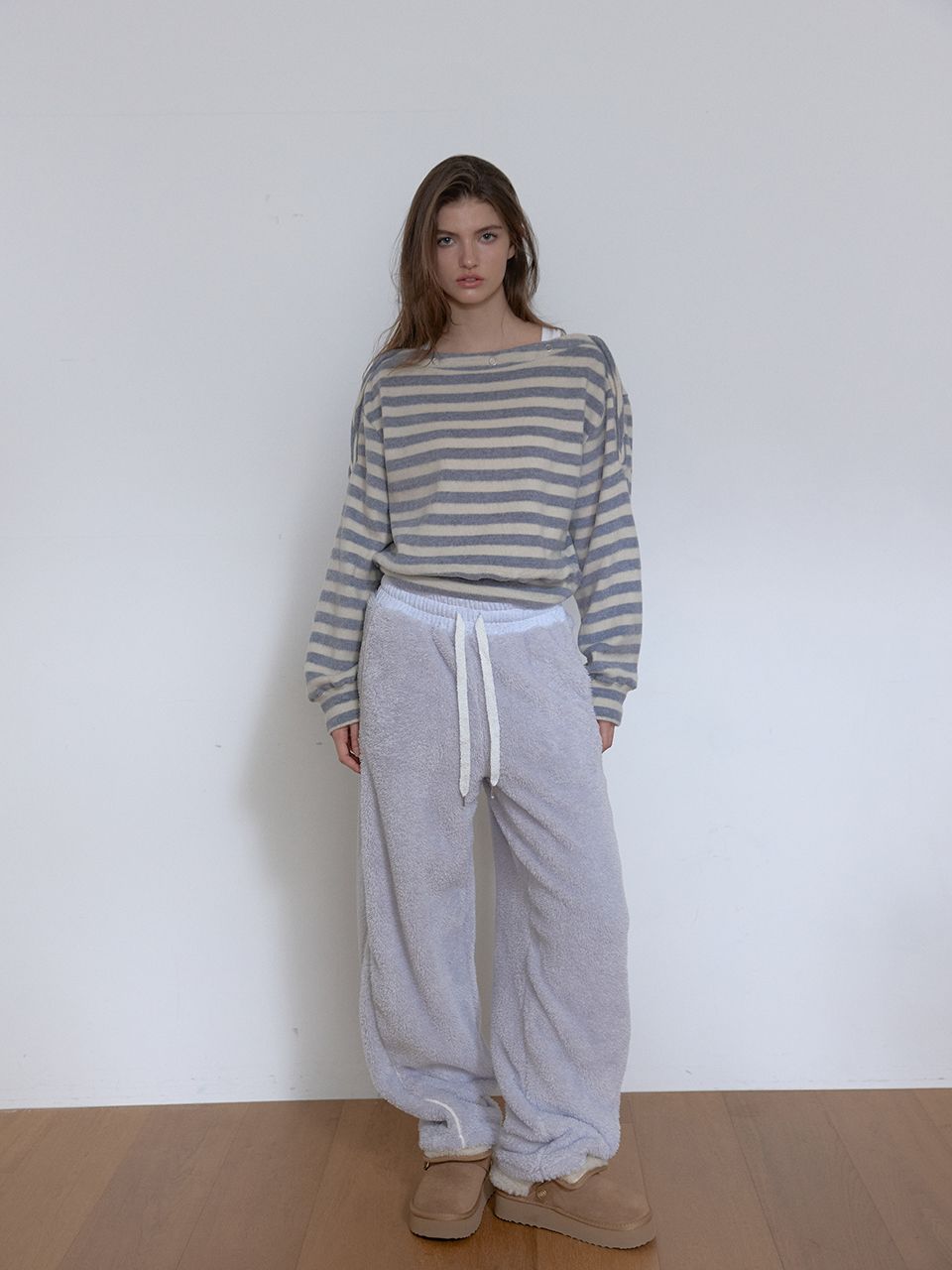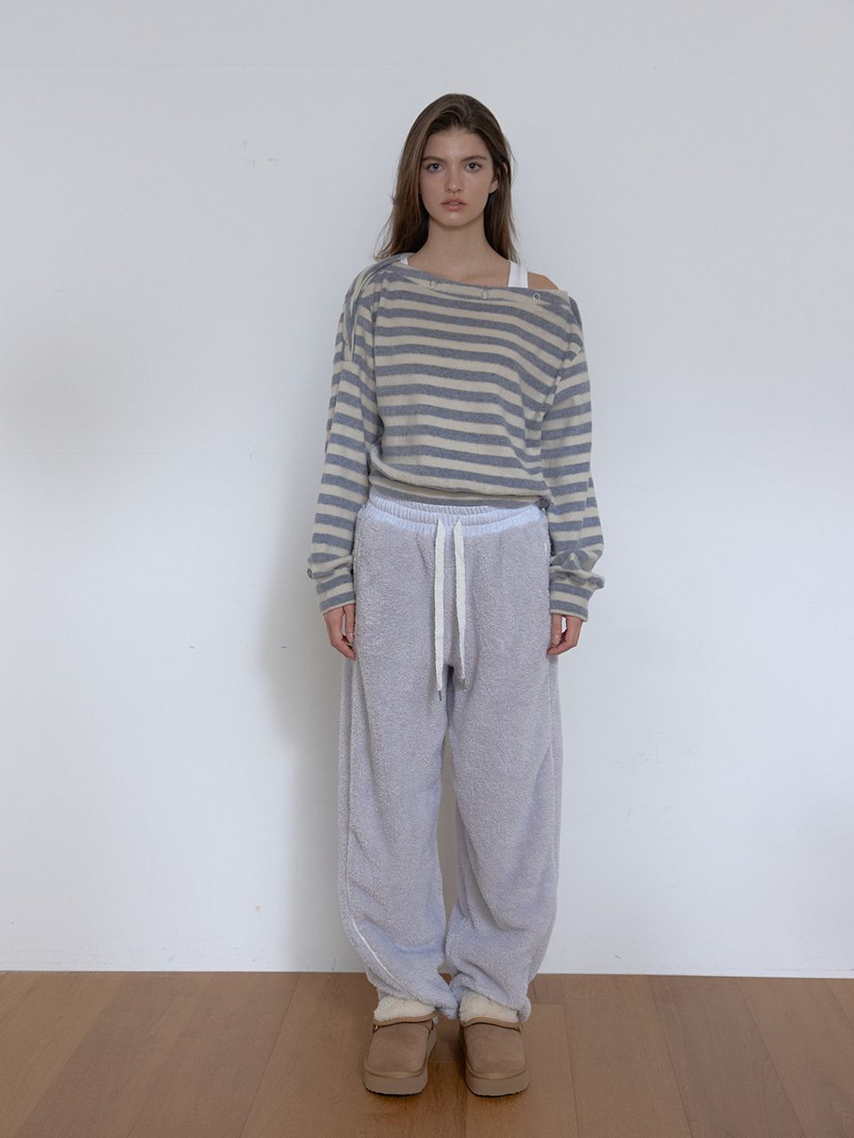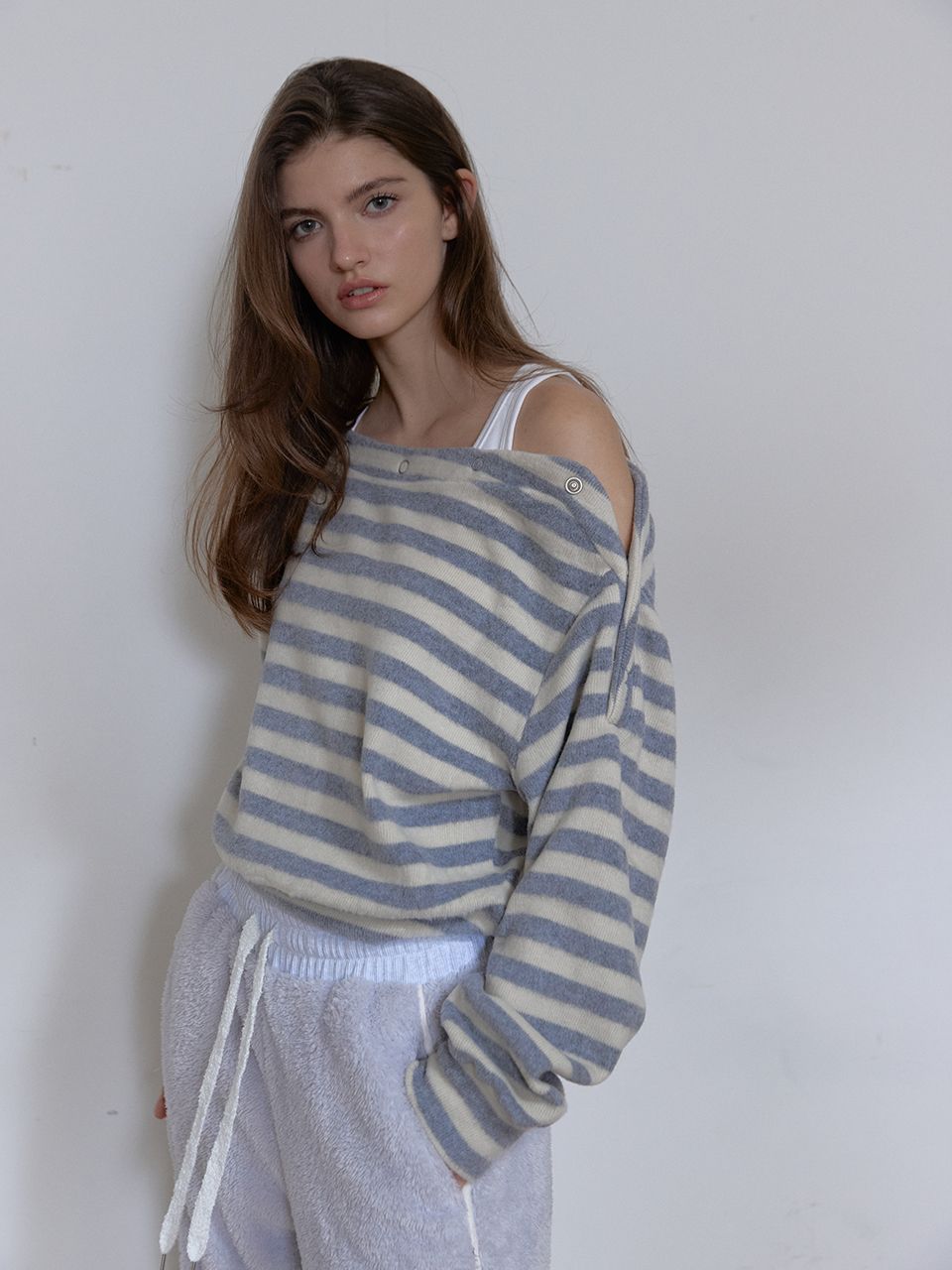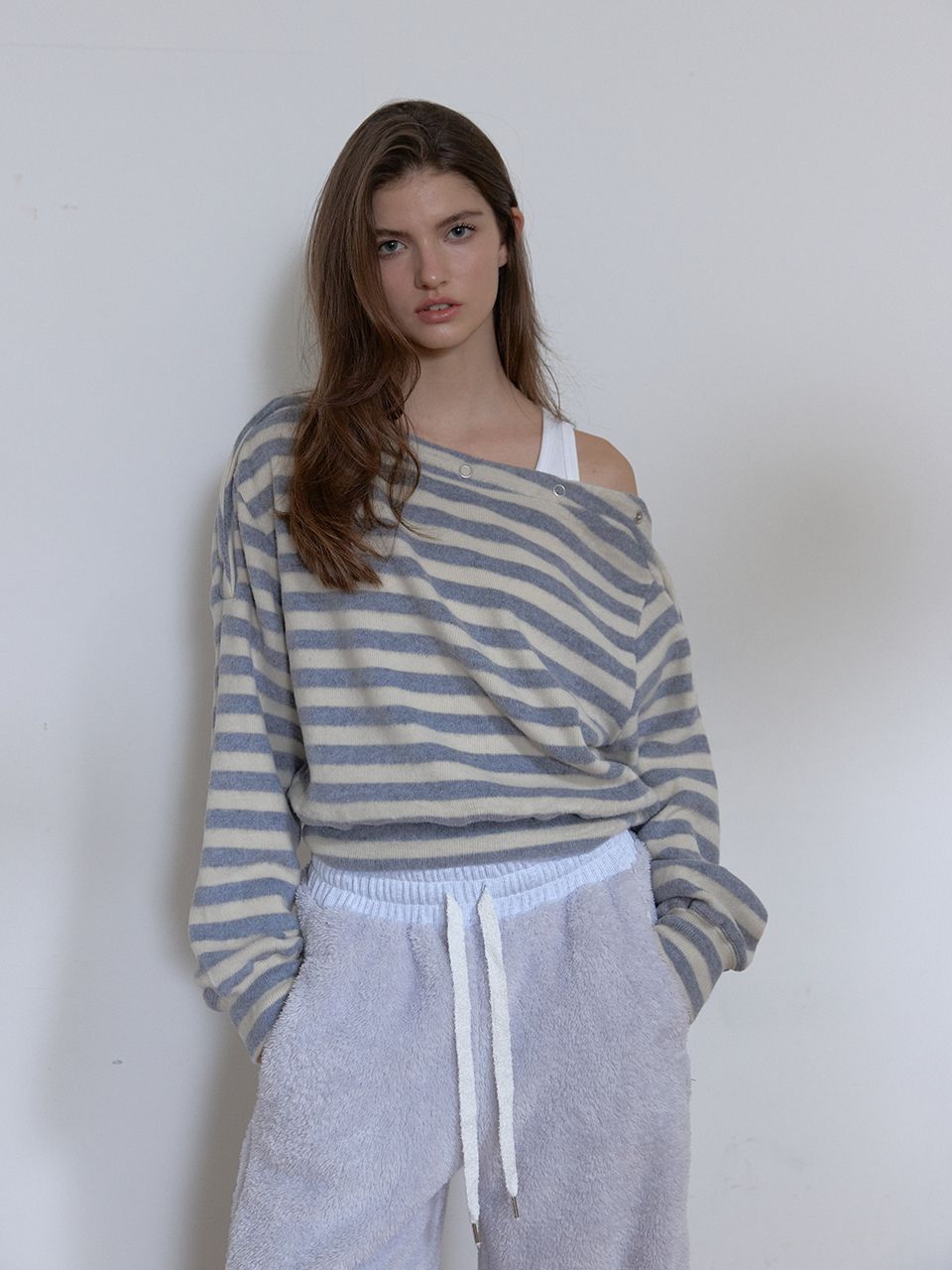 보트넥 라인에 스냅 버튼 디테일이 더해진 티셔츠입니다.