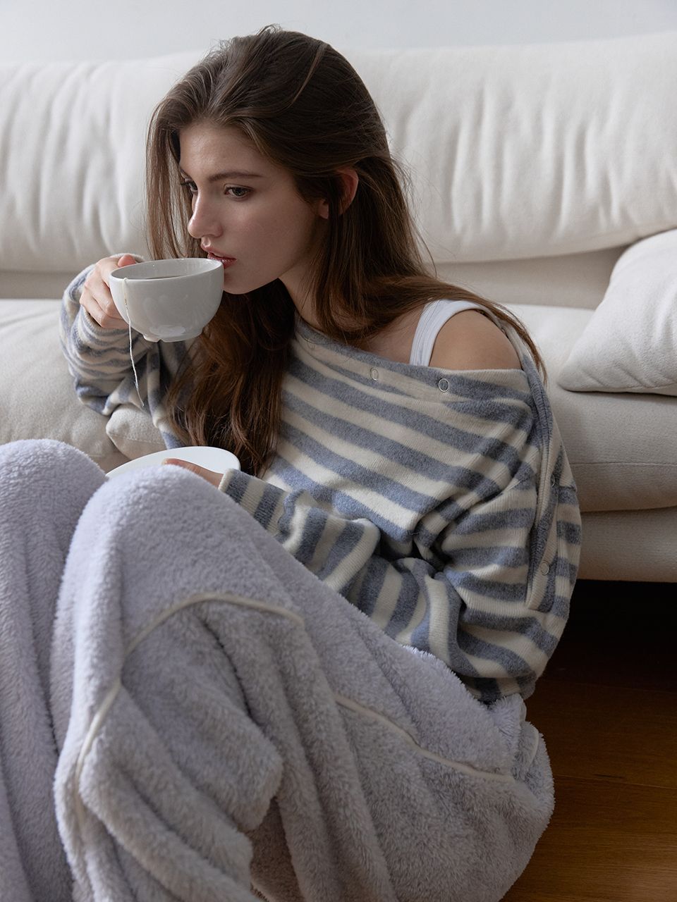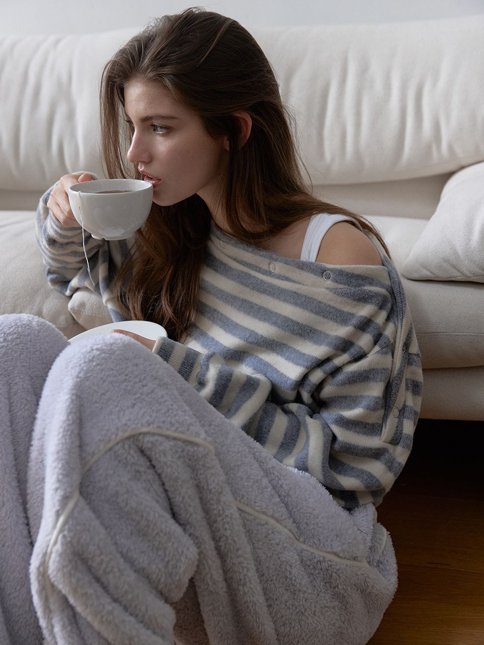 넥라인 연출에 따라 원숄더 연출이 가능하여 다양한 무드로 연출하기 좋습니다.