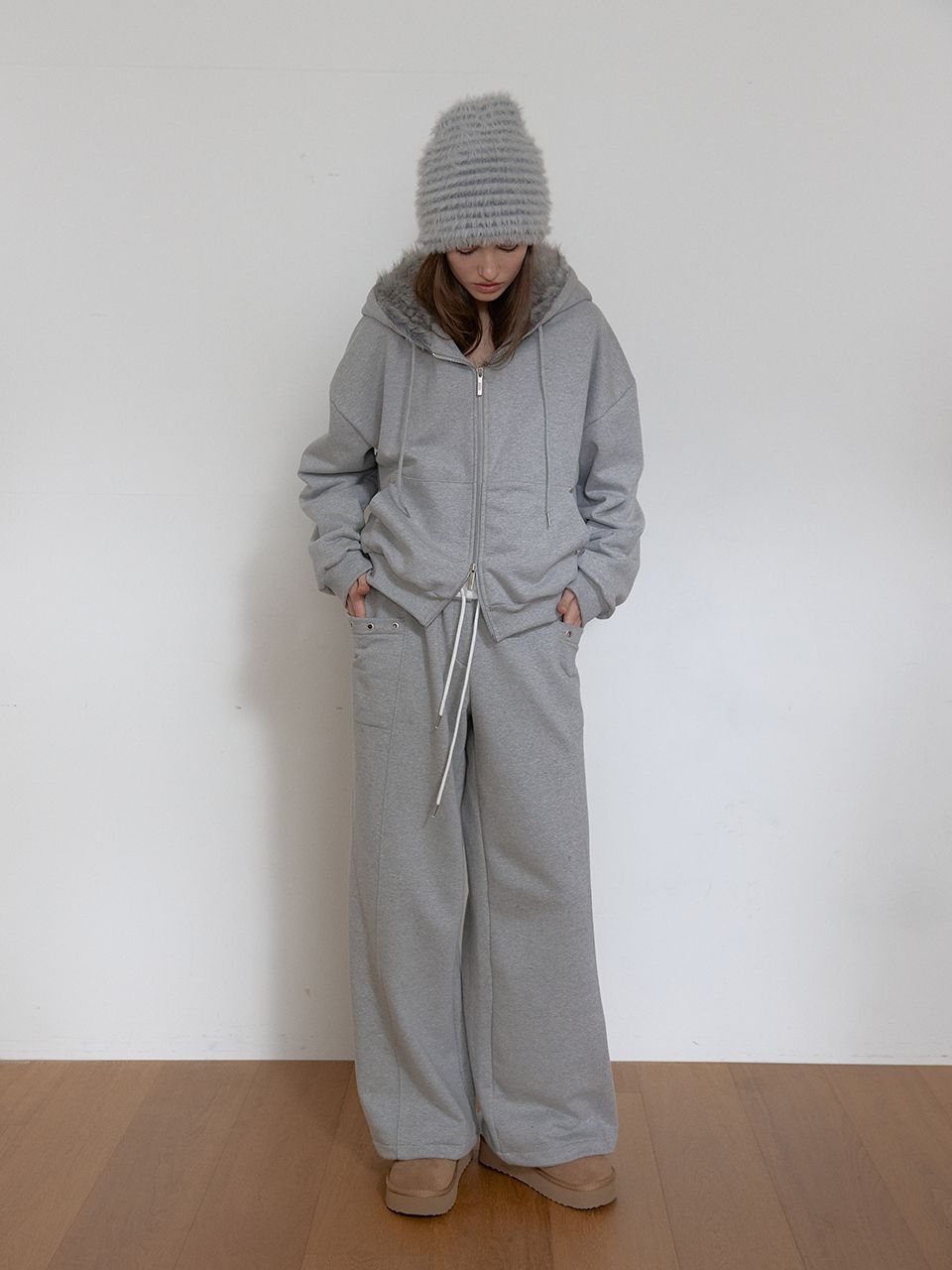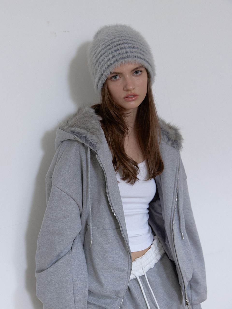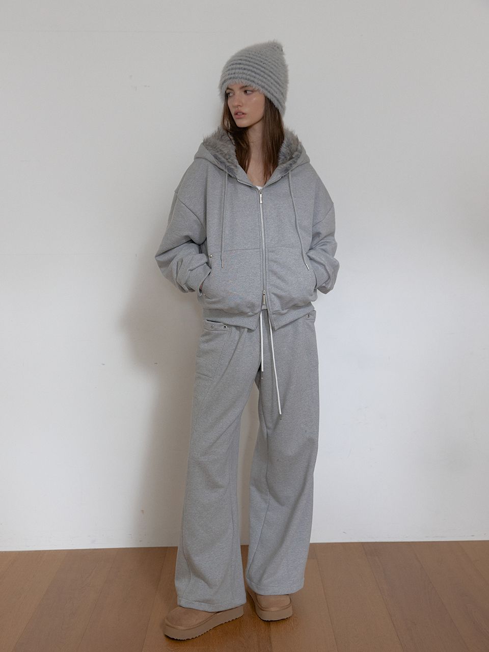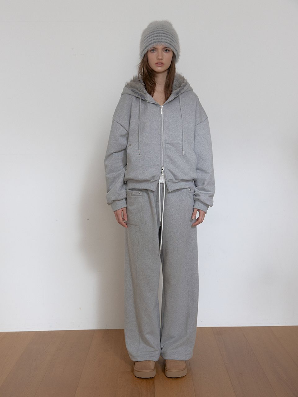 TEDDY FUR HOOD ZIP UP (MELANGE GREY)