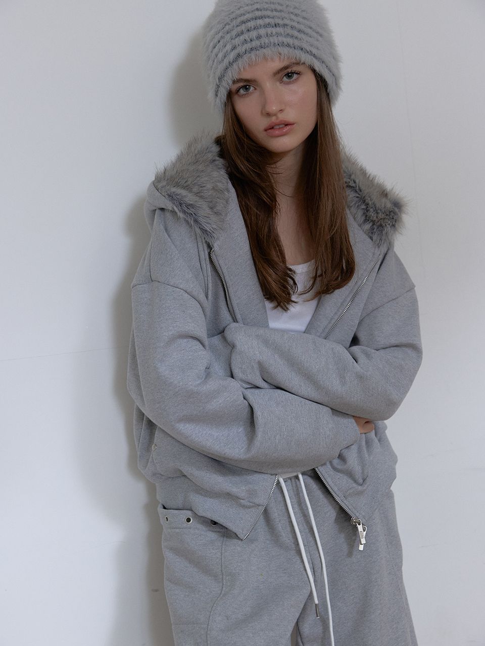 몸판, 소매 전체 퍼 안감으로 보온성이 뛰어난 퍼 후드 집업입니다.