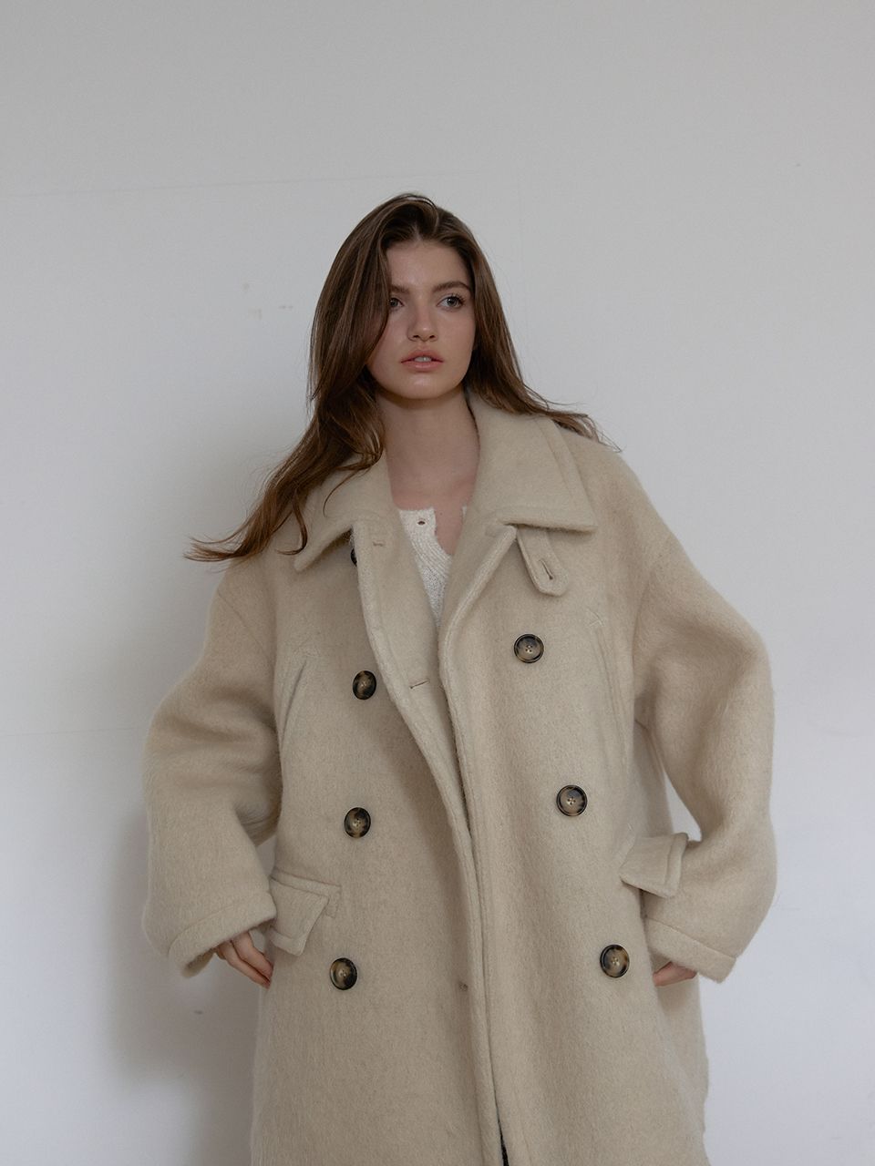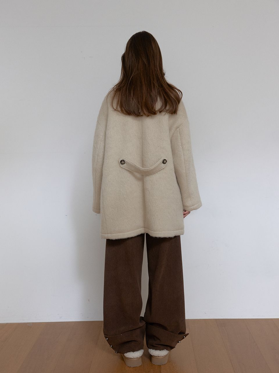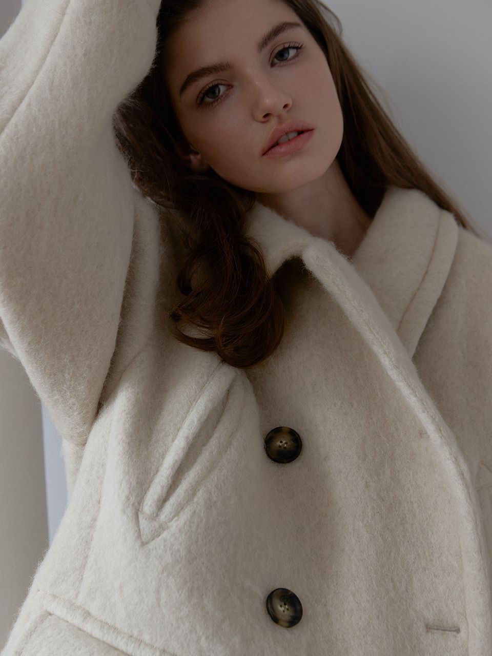 넥라인 단추 디테일이 포인트인 미니멀 무드의 울 블렌드 코트입니다.