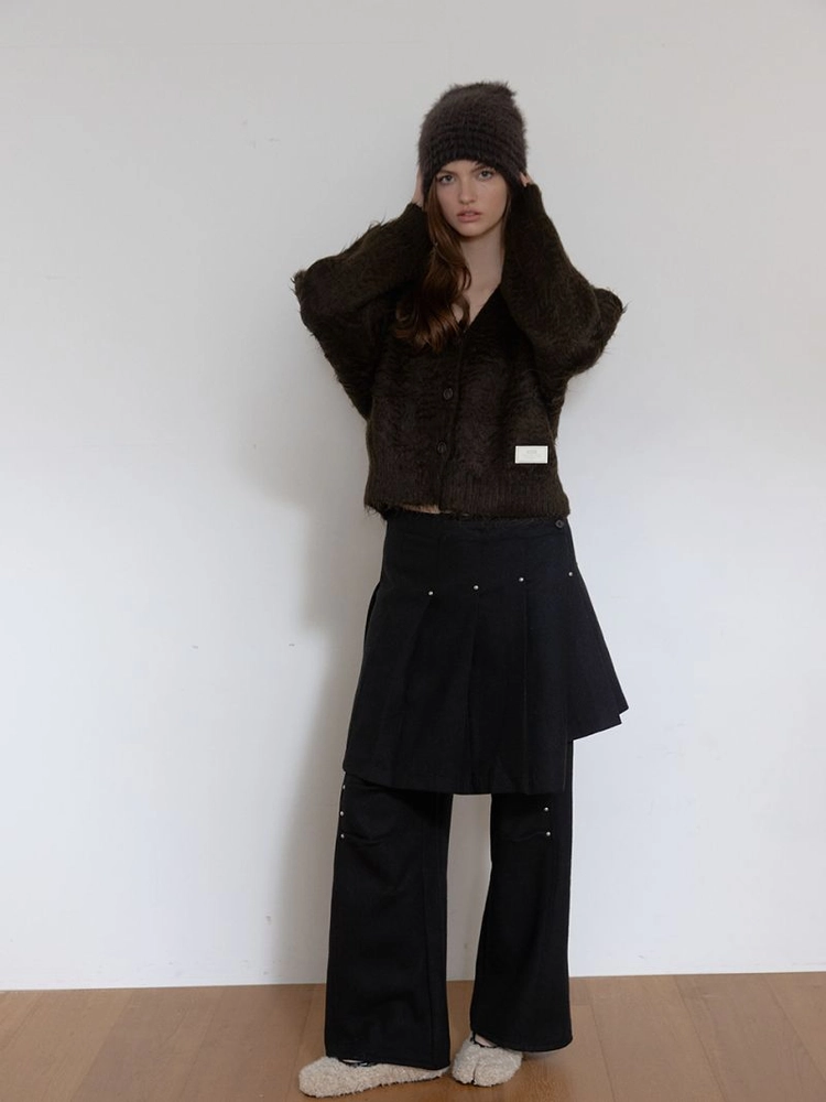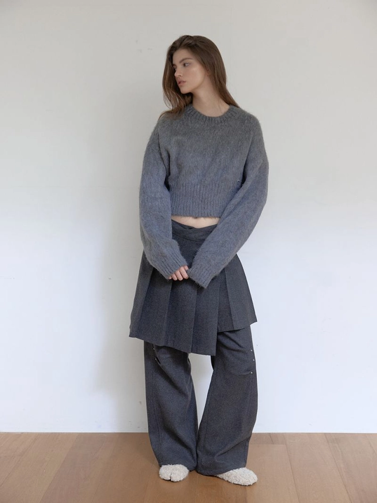 탄탄한 울 소재로 각잡힌 플리츠 단으로 모던한 느낌을 주며, 리벳 디테일과 언발란스하게 겹쳐지는 플리츠가 고급스러운 분위기를 연출합니다.
