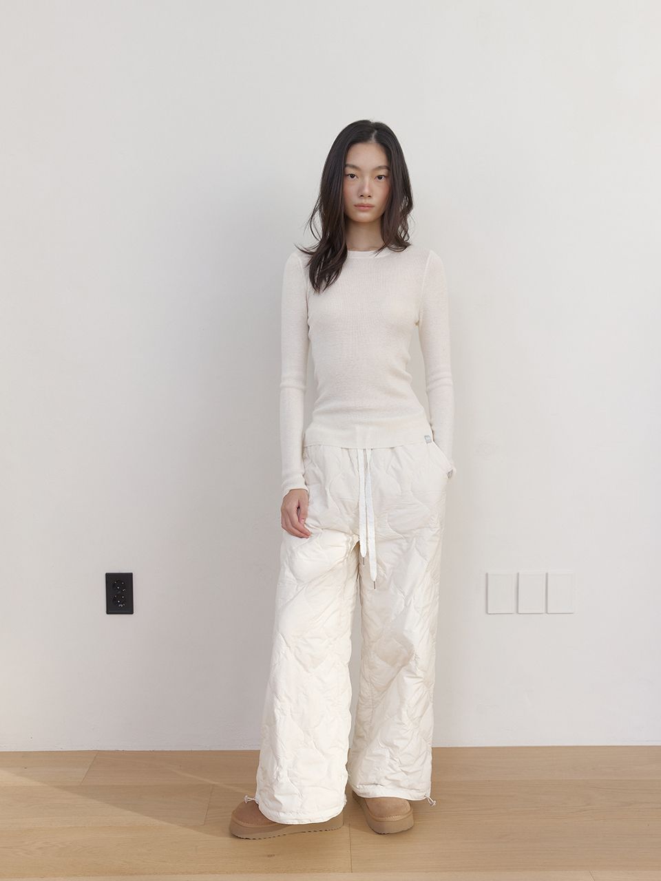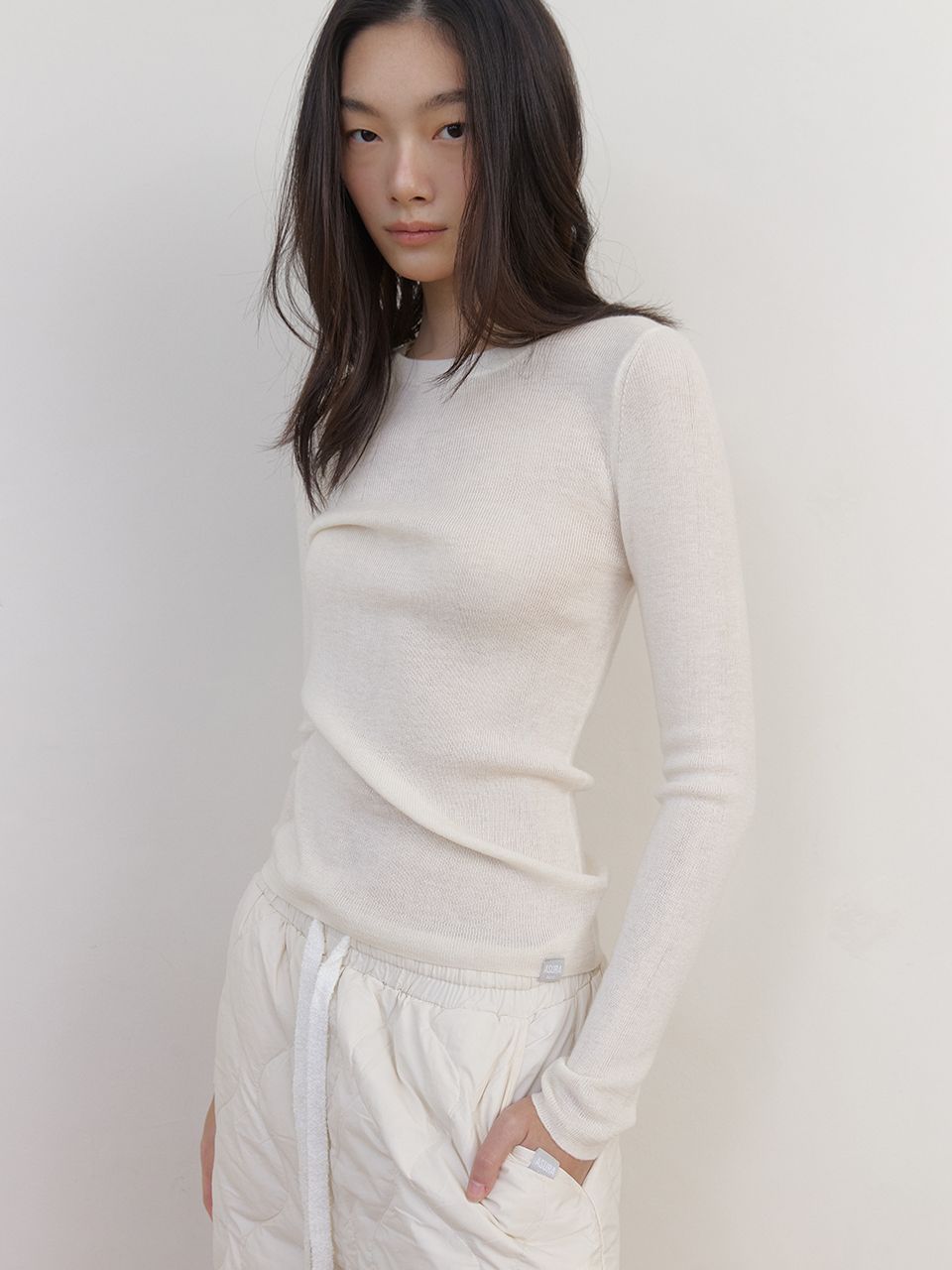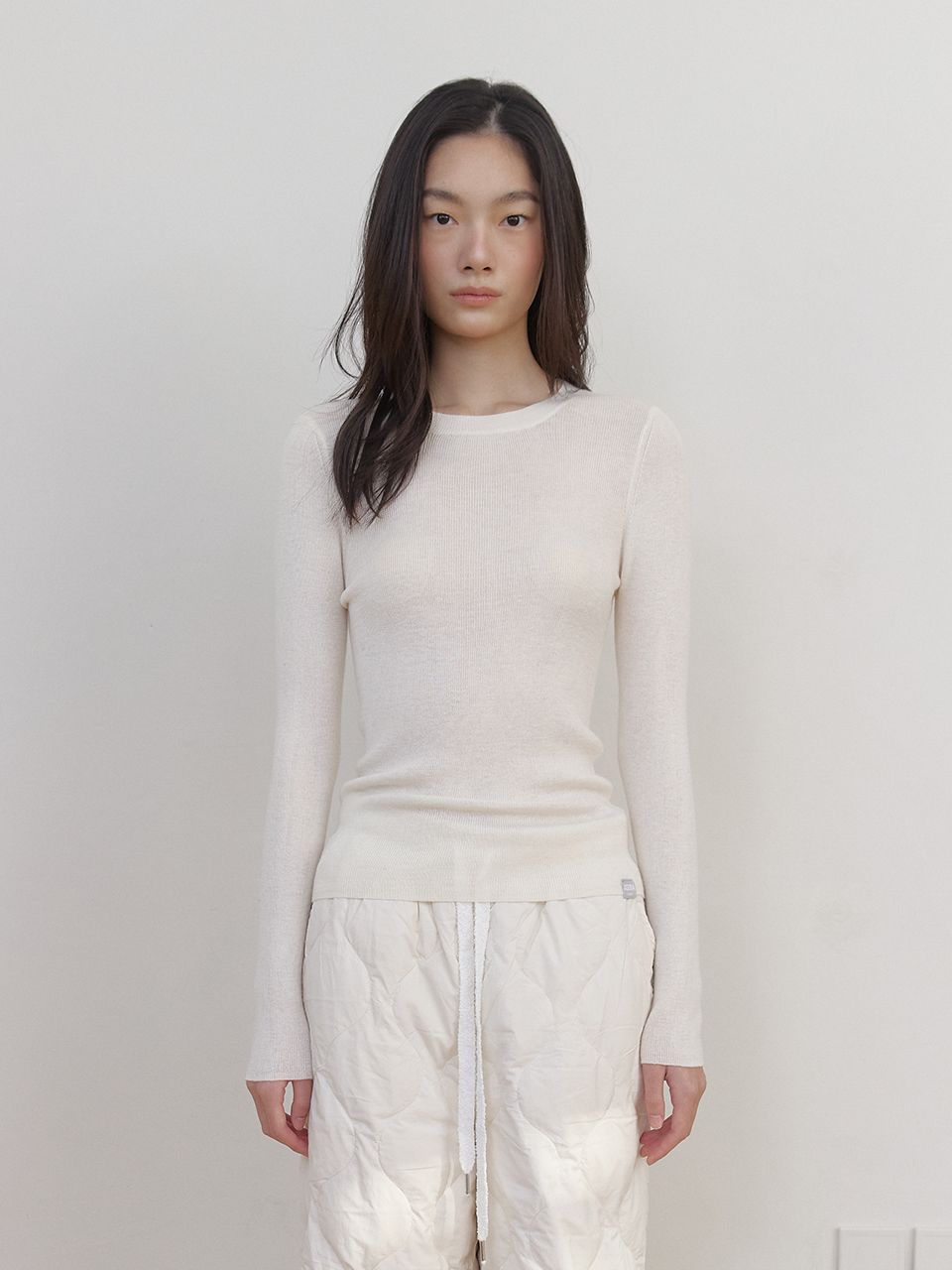 군더더기 없는 베이직한 디자인은 다양한 하의와 아우터에 이너로 활용하기 좋으며, 소매 끝의 작은 스퀘어 라벨이 미니멀한 포인트를 더합니다.