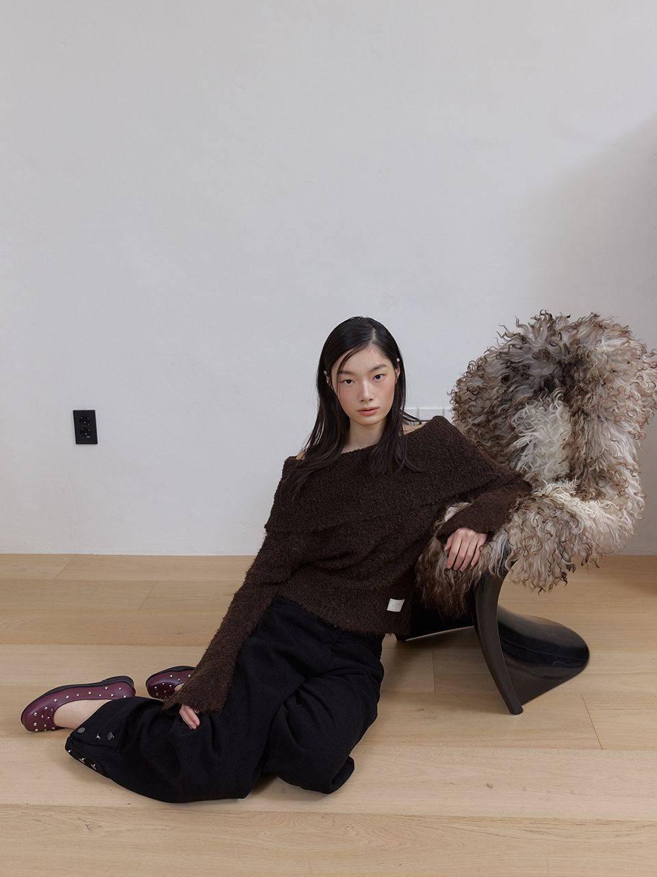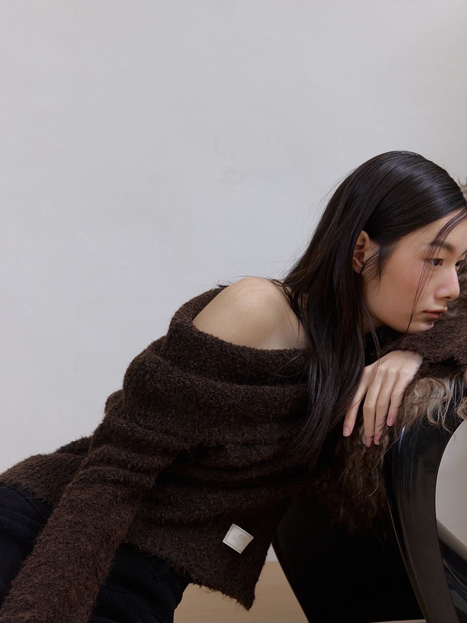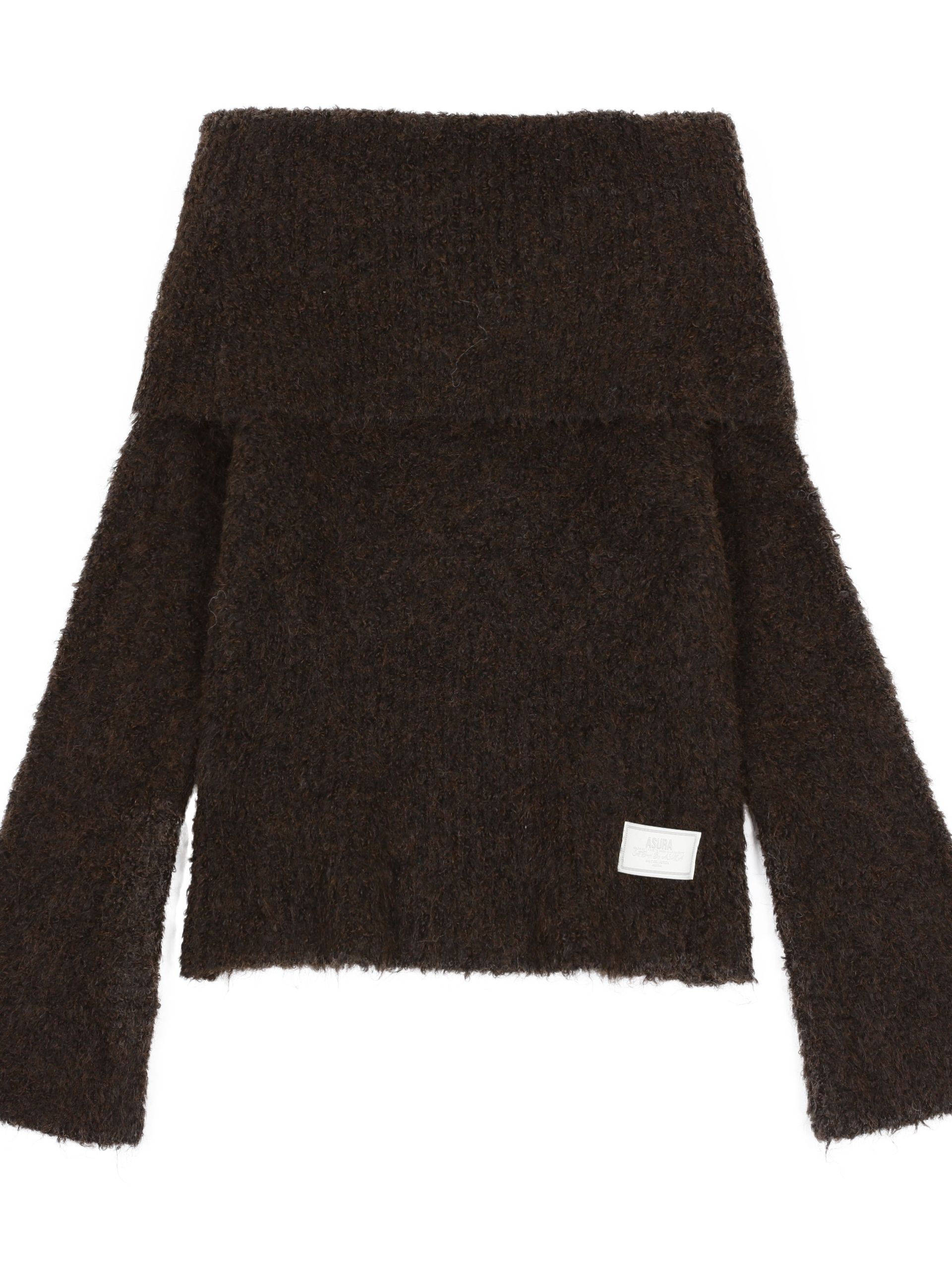 따뜻하고 풍성한 헤어리 텍스처가 매력적인 오프숄더 니트입니다.