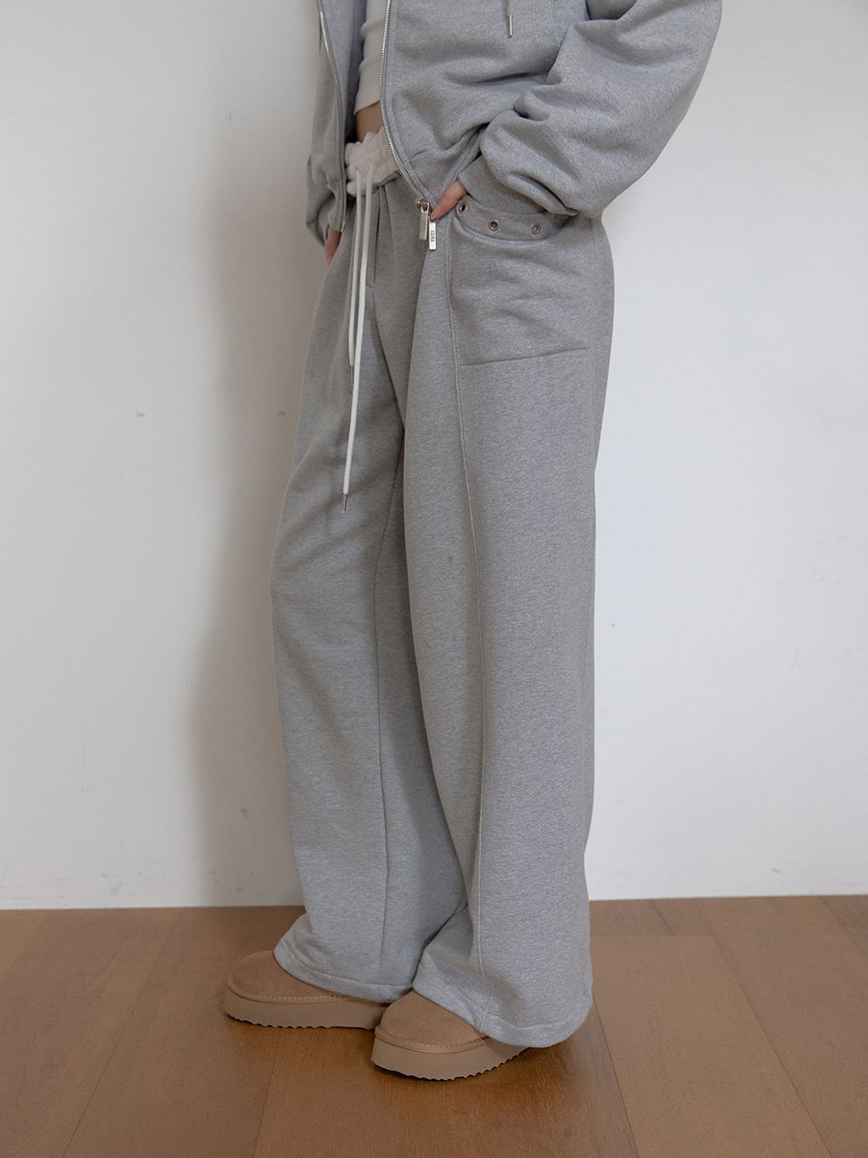 와이드한 핏감에 밑단 스트링 디테일을 더해 자유롭게 실루엣 조절이 가능하며,