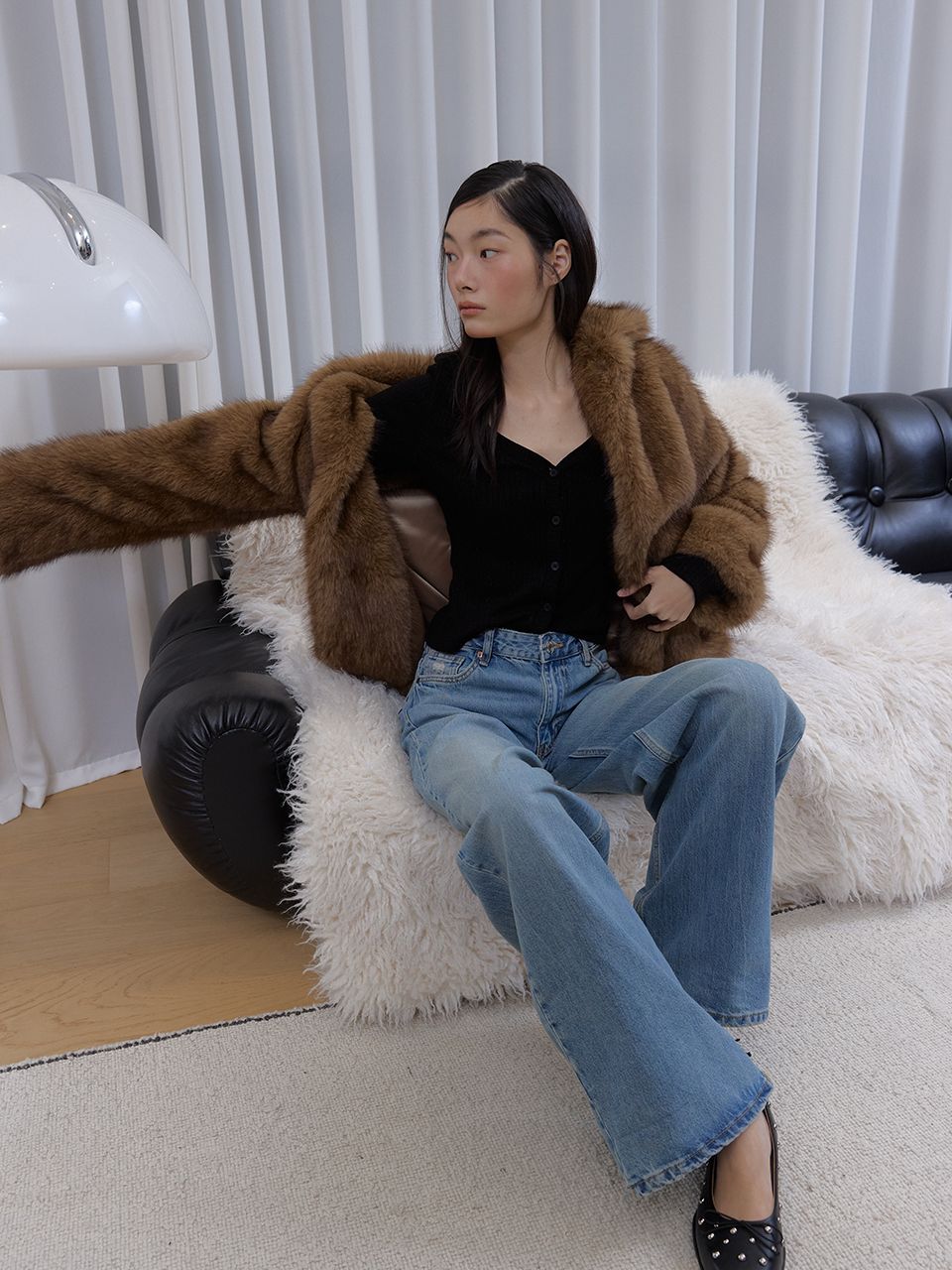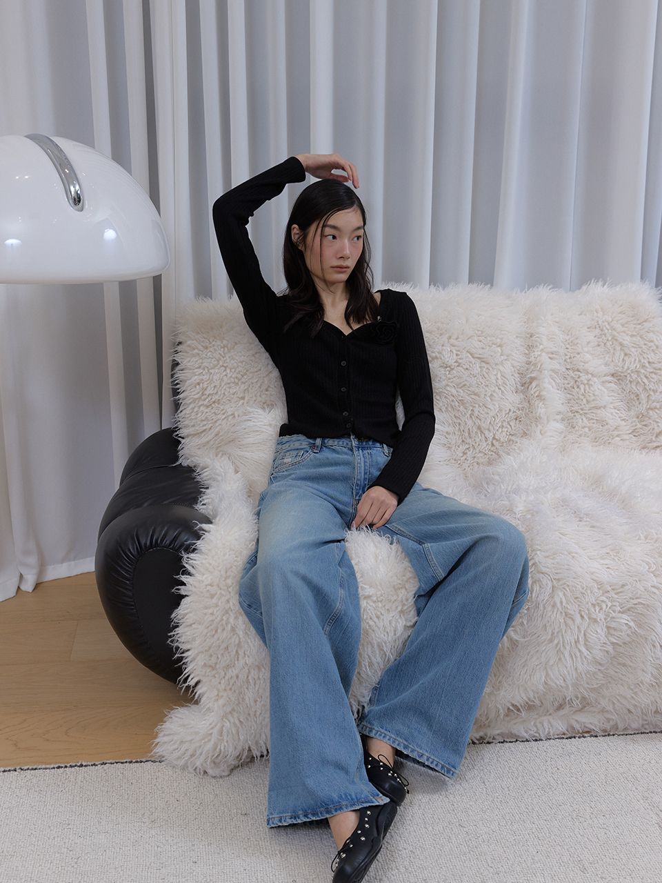 몸에 슬림하게 밀착되는 핏과 적당히 파인 V넥 라인이 여성스러운 실루엣을 강조해 줍니다.