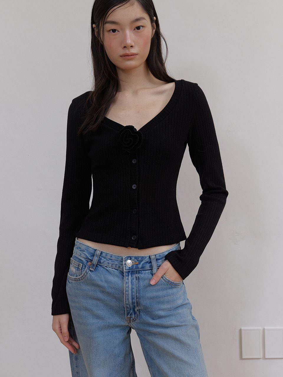 가슴 부분의 입체적인 톤온톤 로즈 (장미) 장식이 우아하고 로맨틱한 포인트를 더했으며, 버튼 디테일로 단독 탑 또는 가벼운 가디건으로 활용하기 좋습니다.