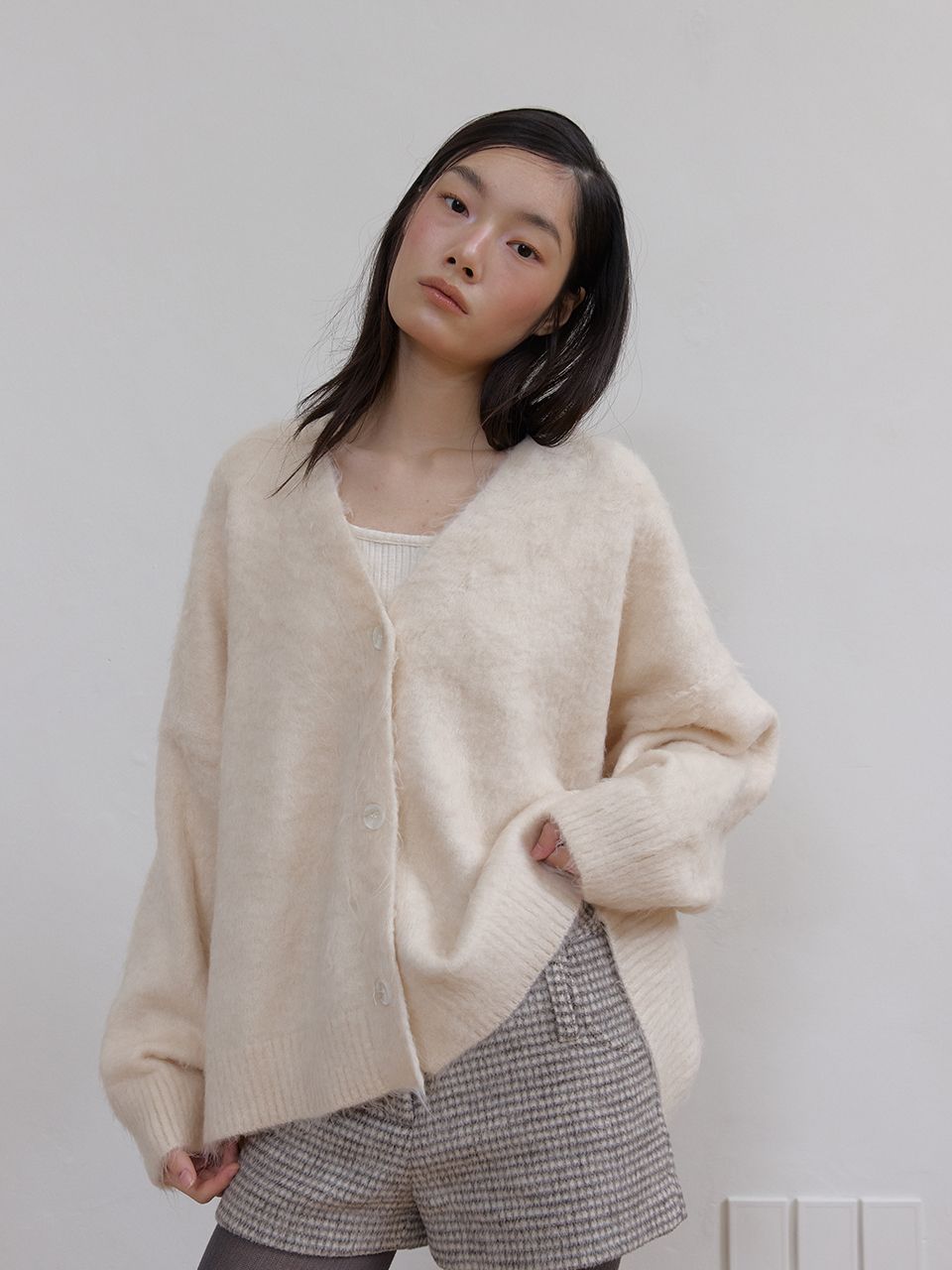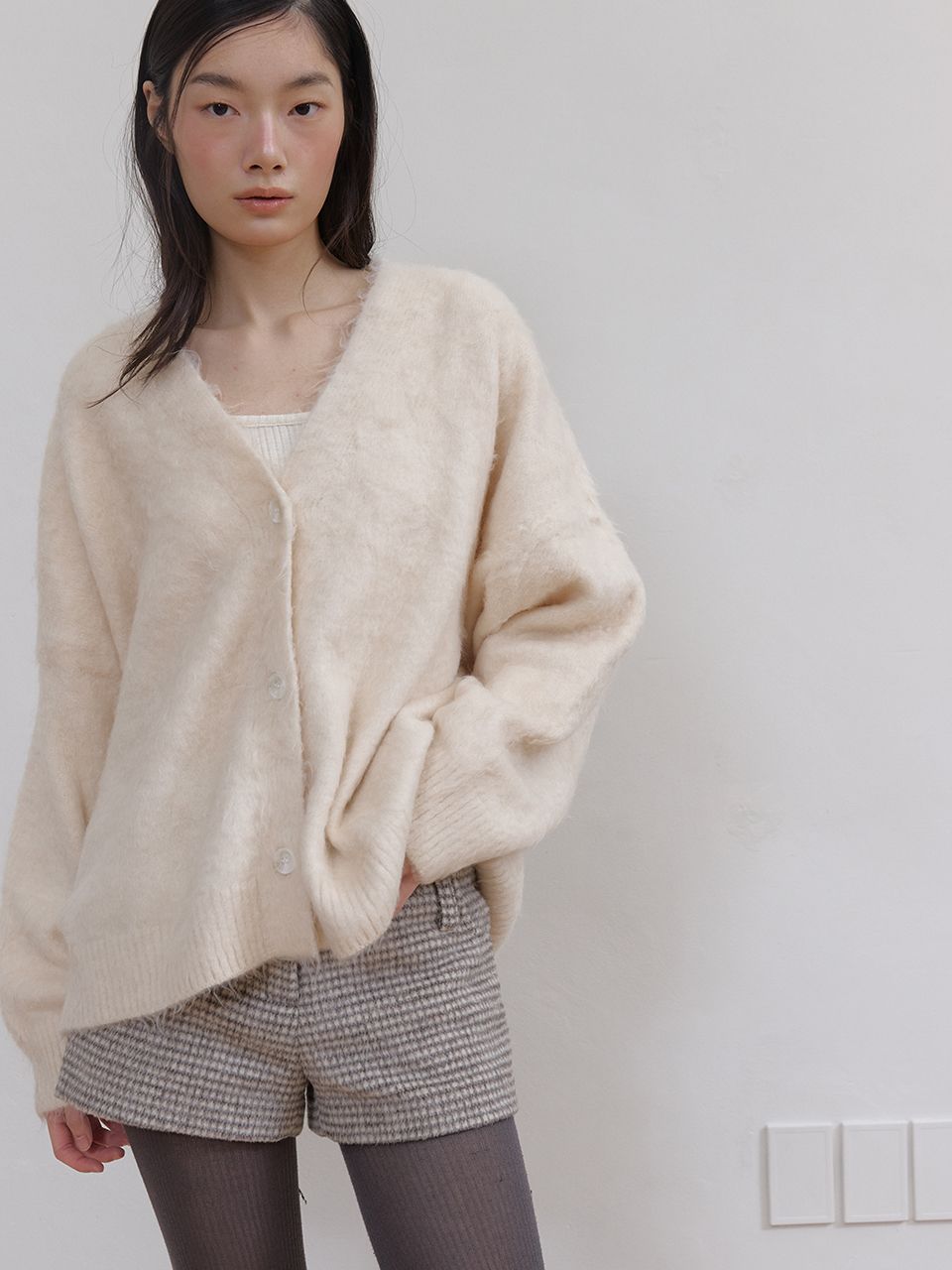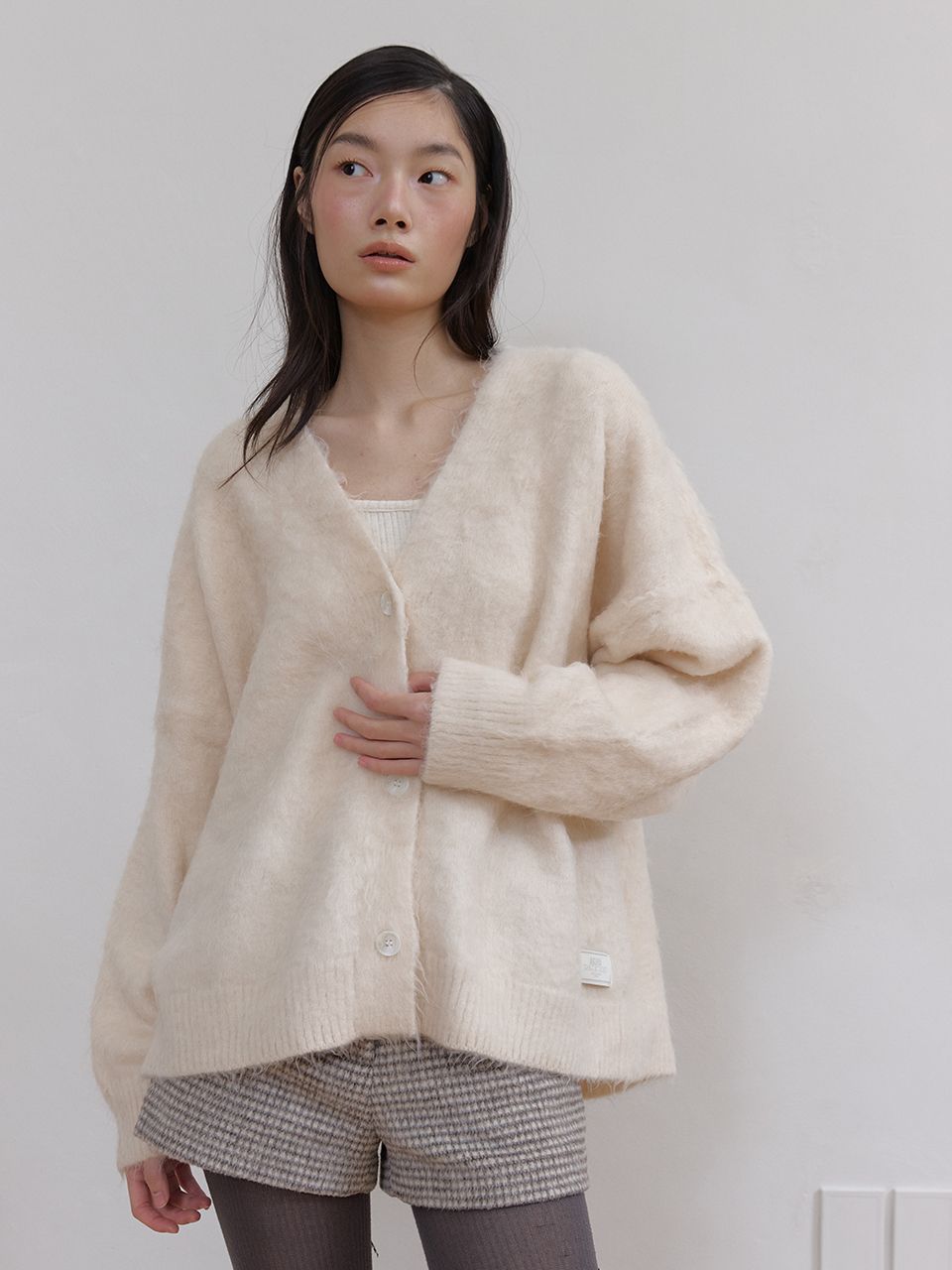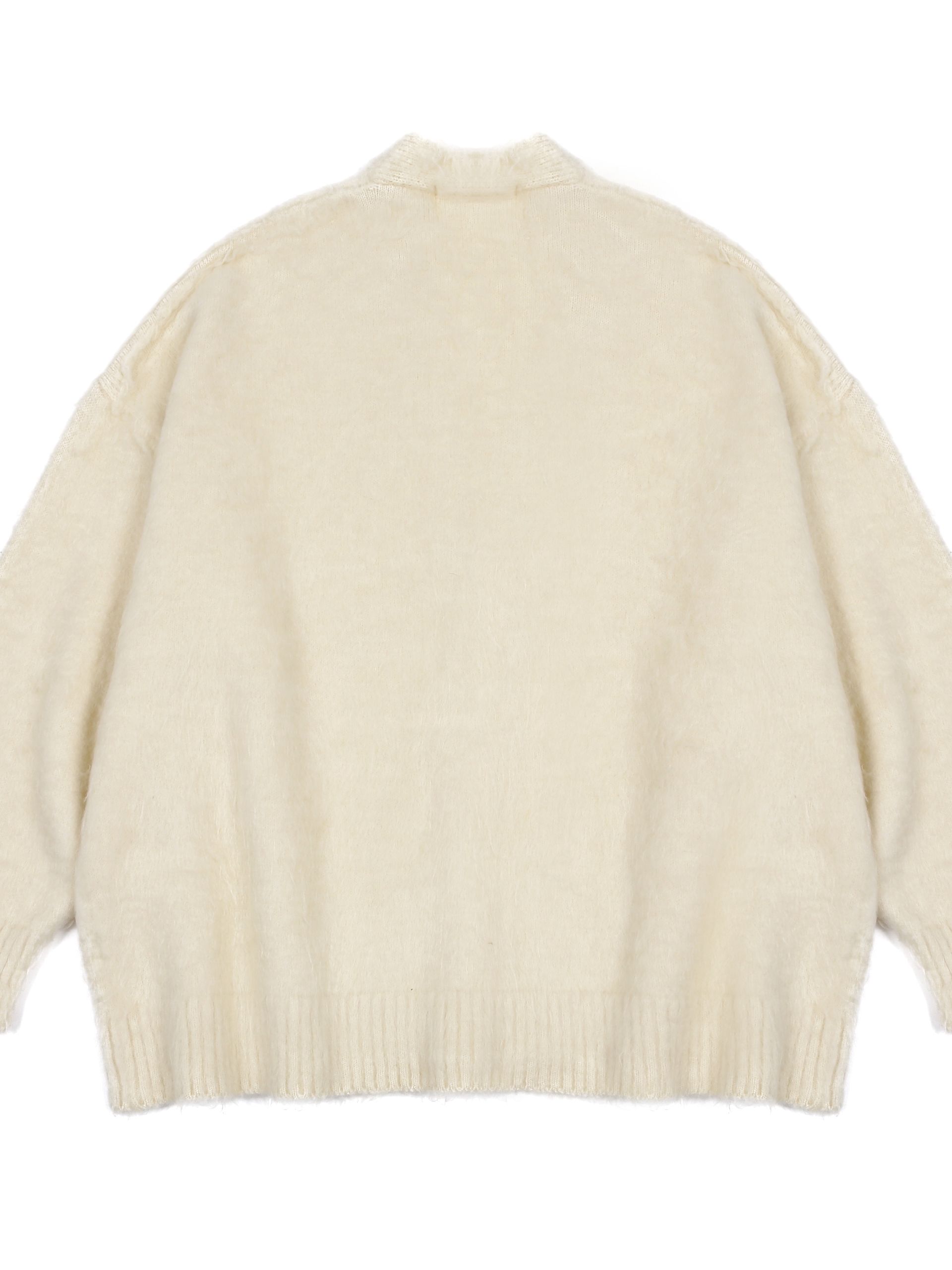 몽글몽글하고 풍성한 헤어리 텍스처가 매력적인 루즈핏 V넥 가디건입니다.