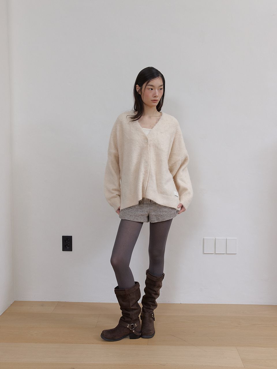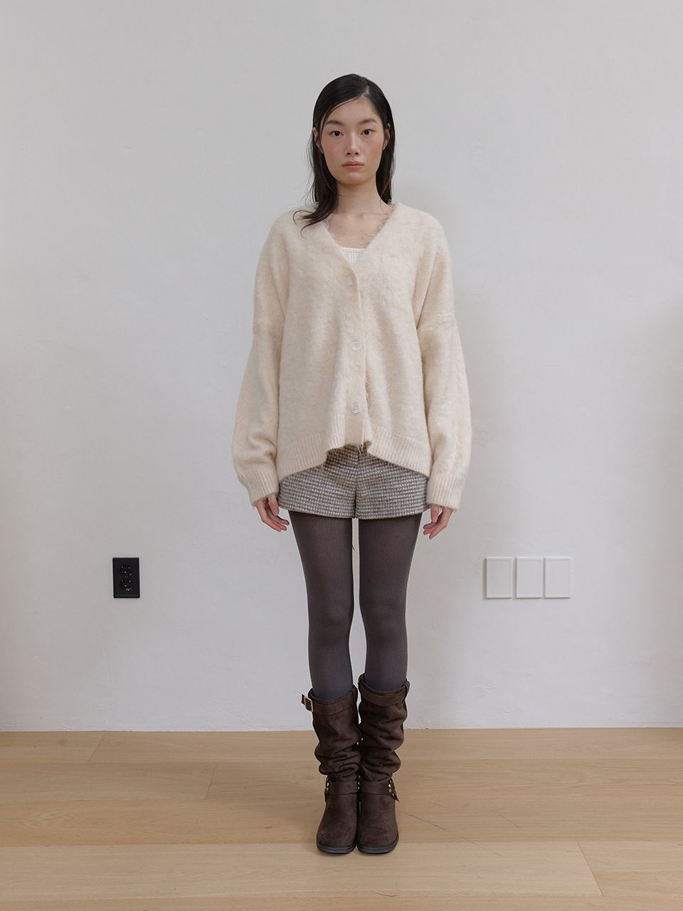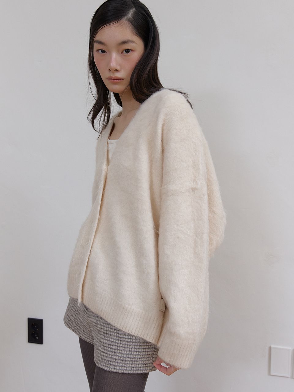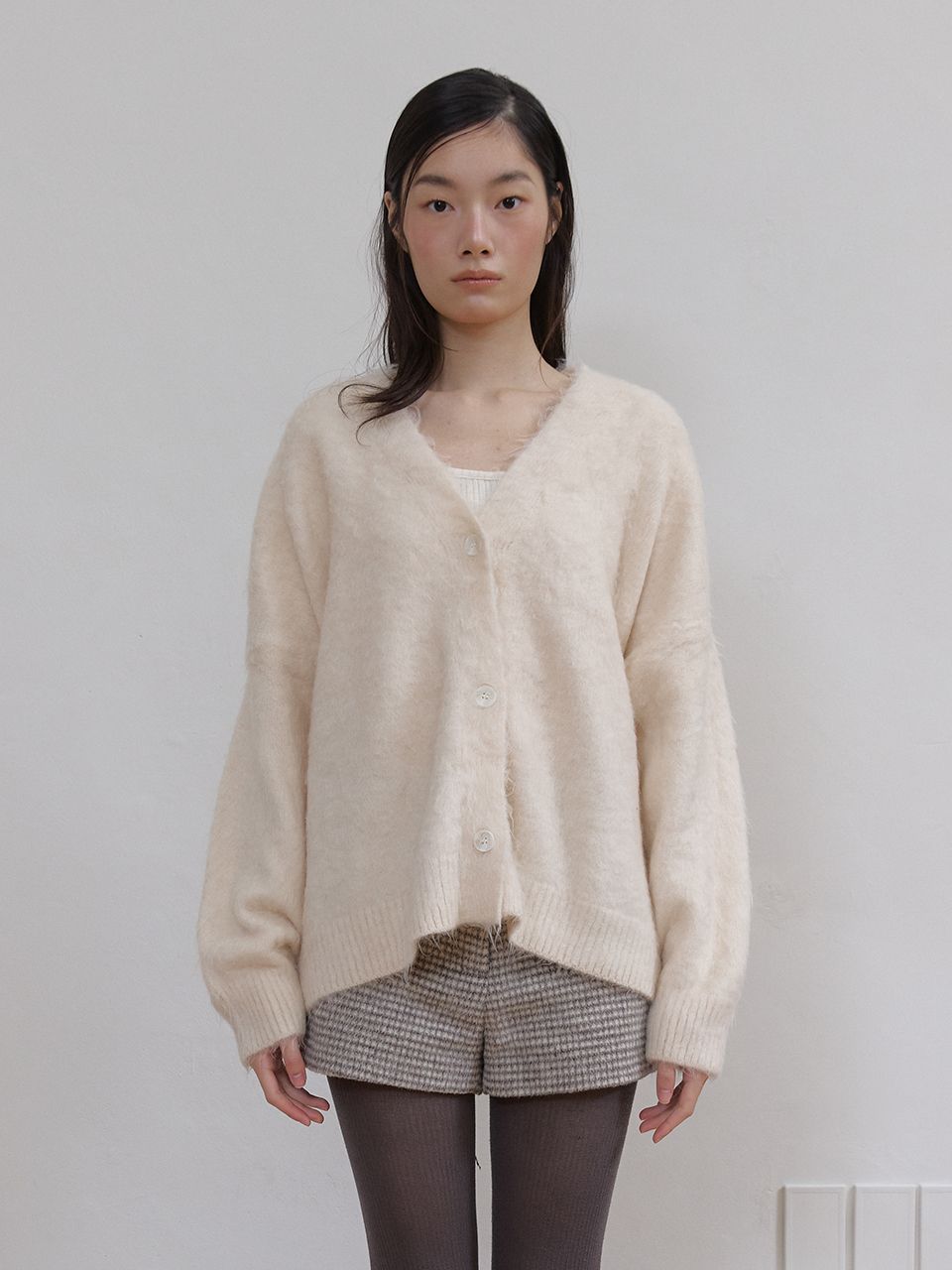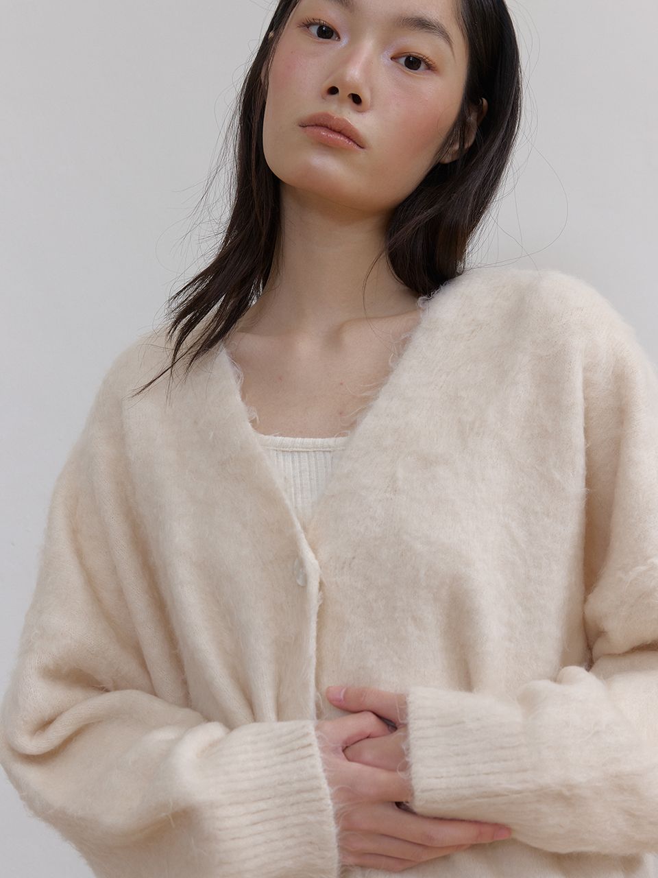 몽글몽글하고 풍성한 헤어리 텍스처가 매력적인 루즈핏 V넥 가디건입니다.