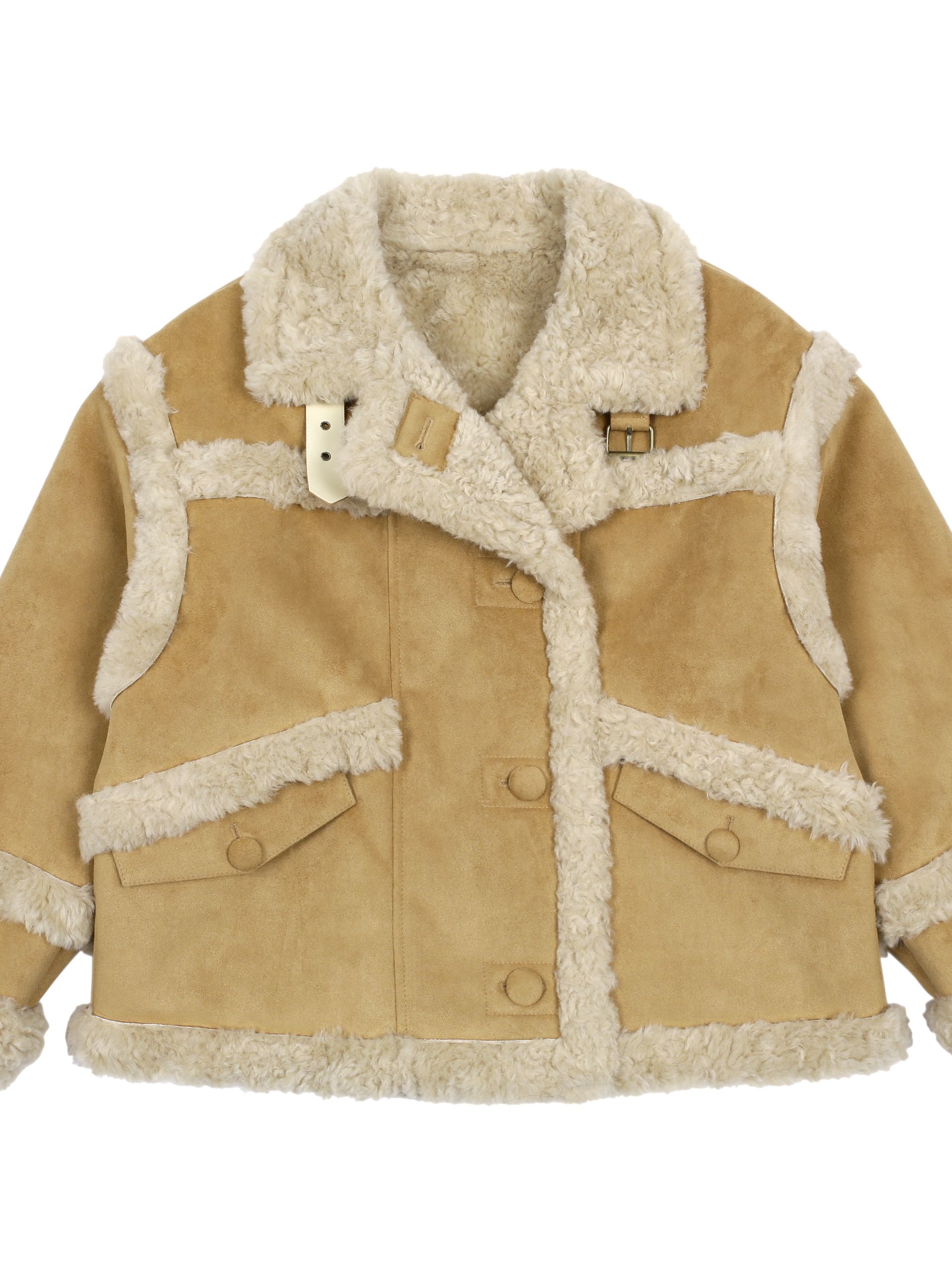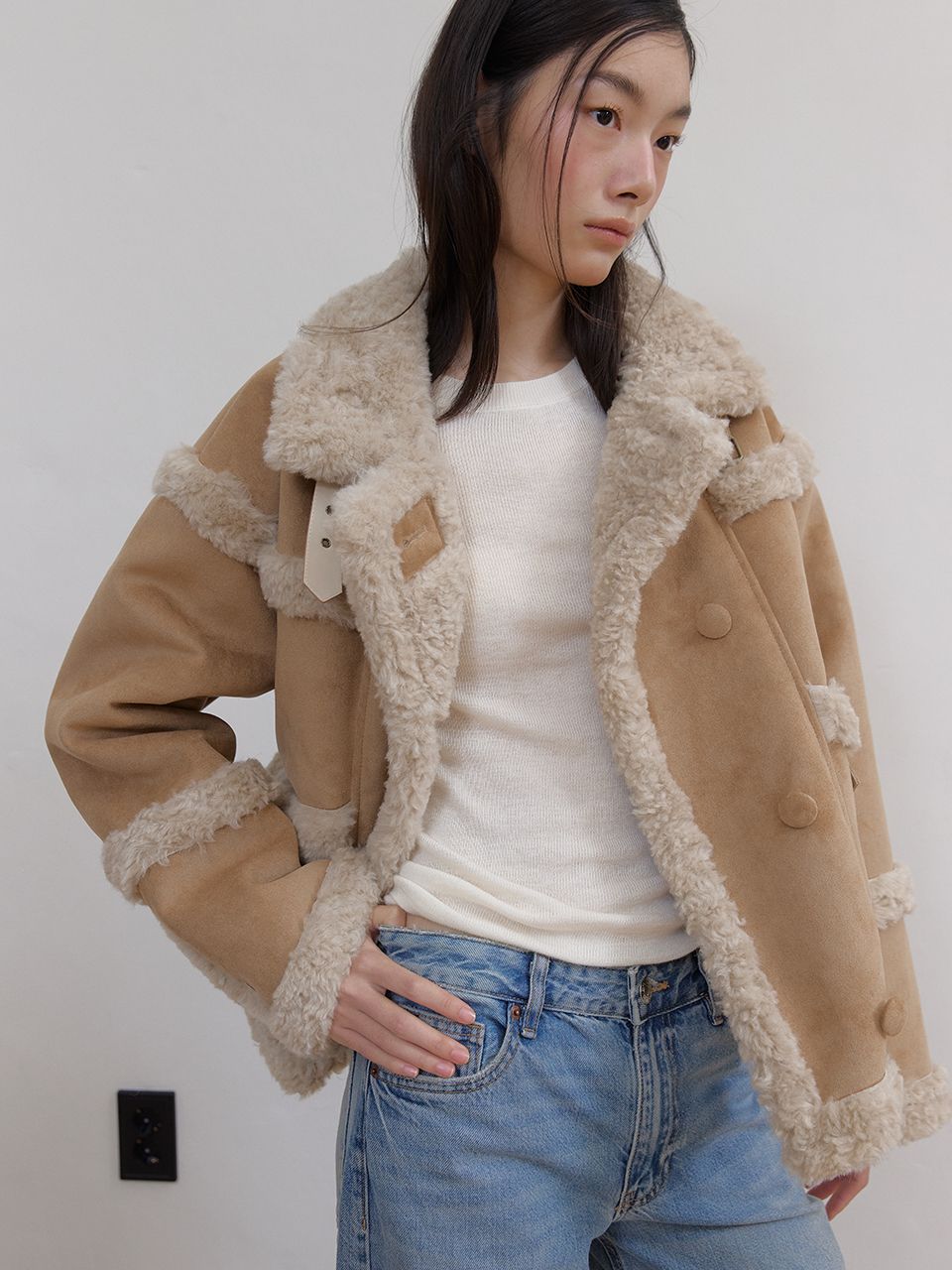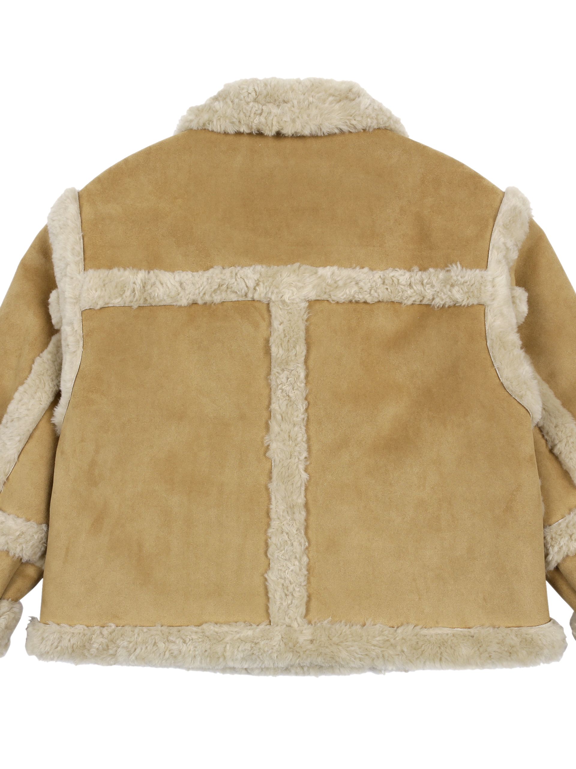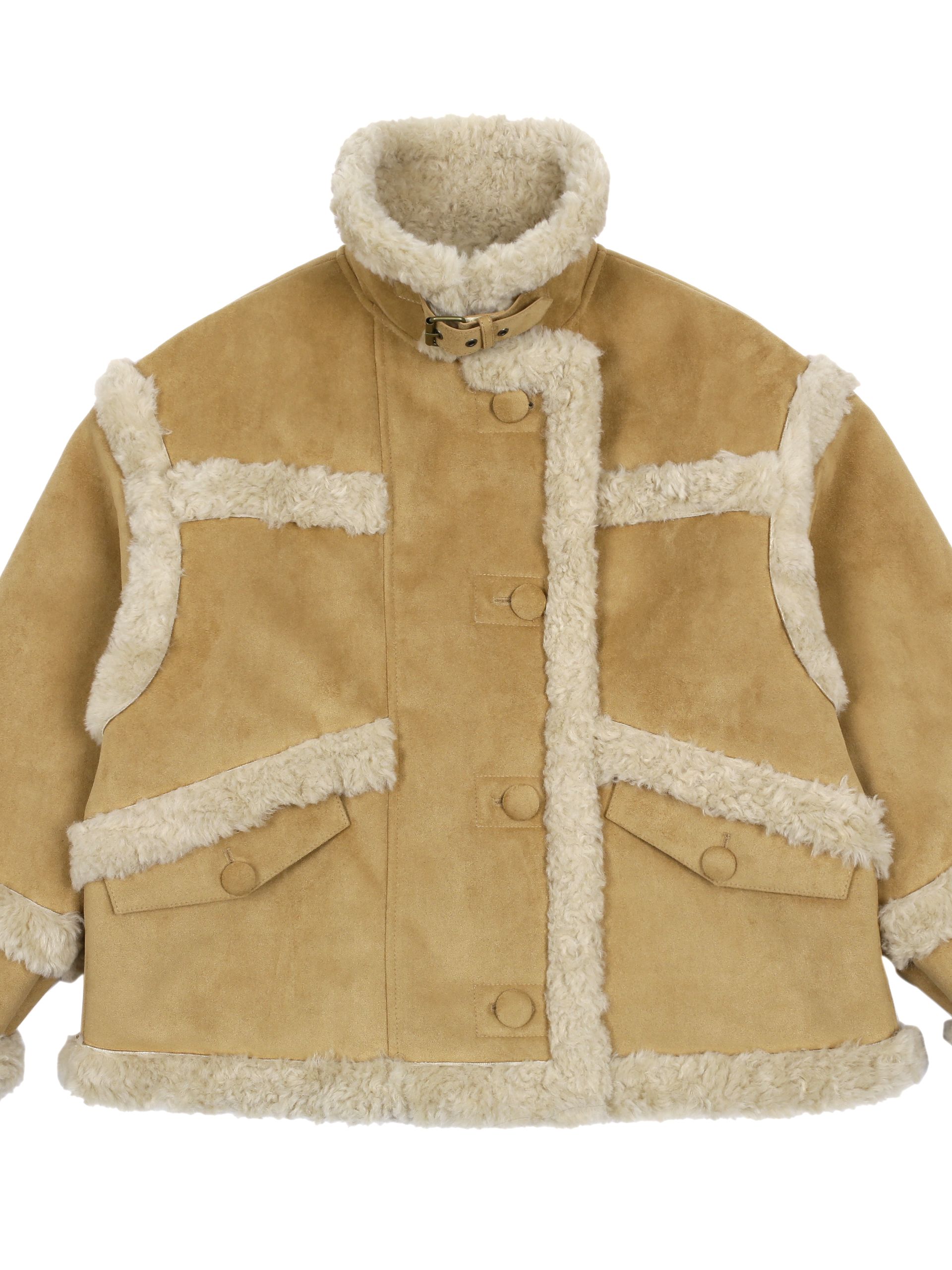 부드러운 스웨이드와 따뜻한 퍼 안감이 대비되어 매력적인 숏 무스탕 재킷입니다.