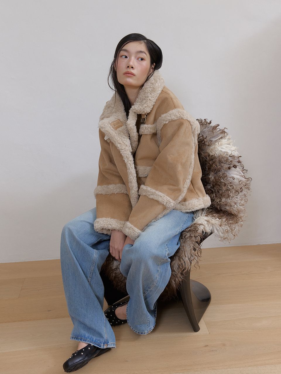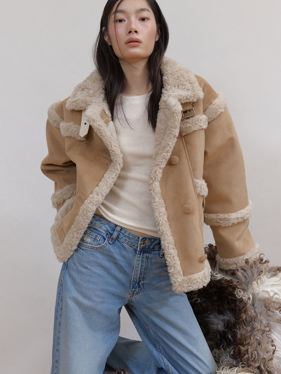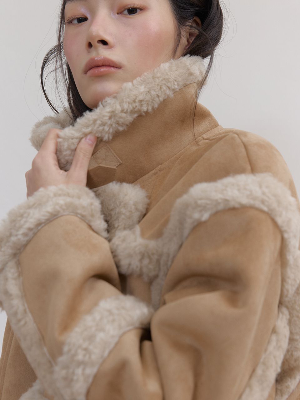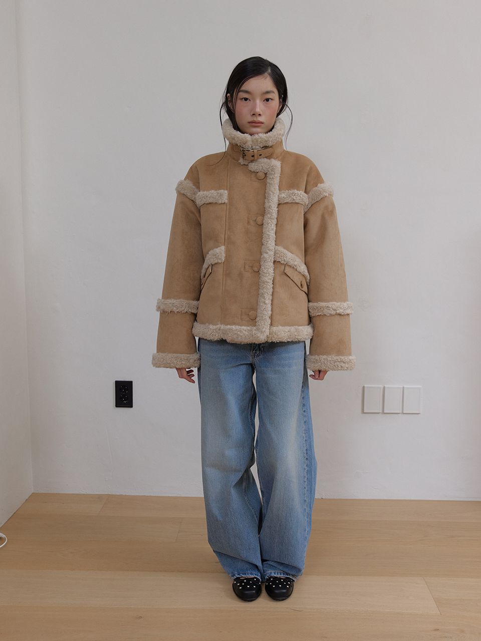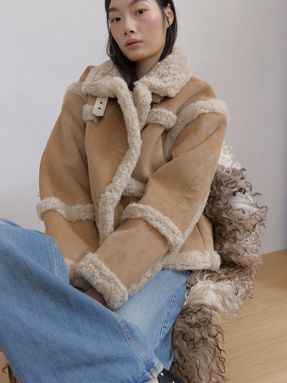 부드러운 스웨이드와 따뜻한 퍼 안감이 대비되어 매력적인 숏 무스탕 재킷입니다.
