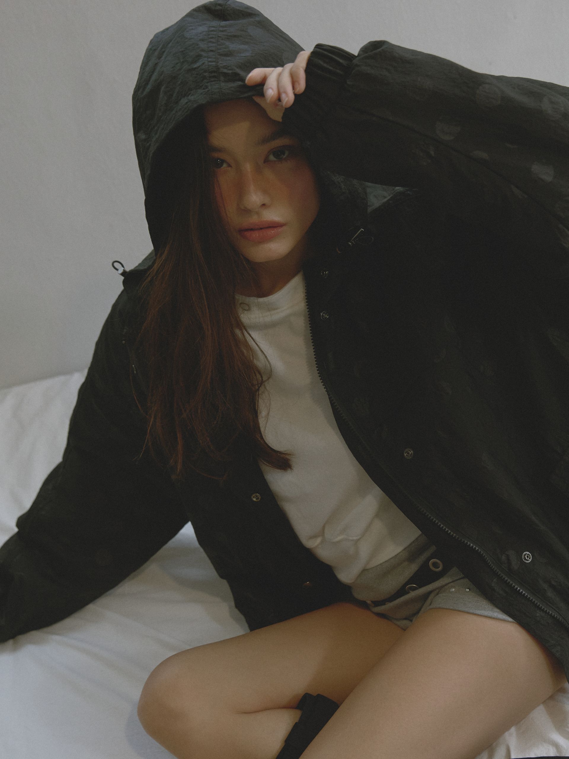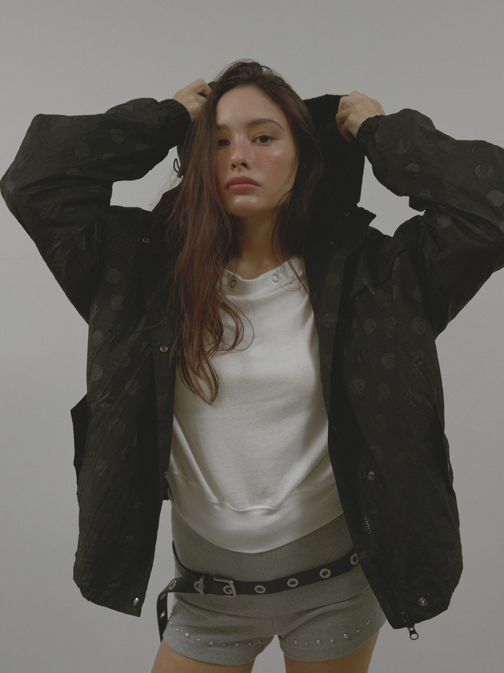 넉넉한 실루엣과 밴딩 처리로 활동성을 높였으며, 후드 스트링과 앞 지퍼 포켓으로 캐주얼한 무드를 완성했습니다.