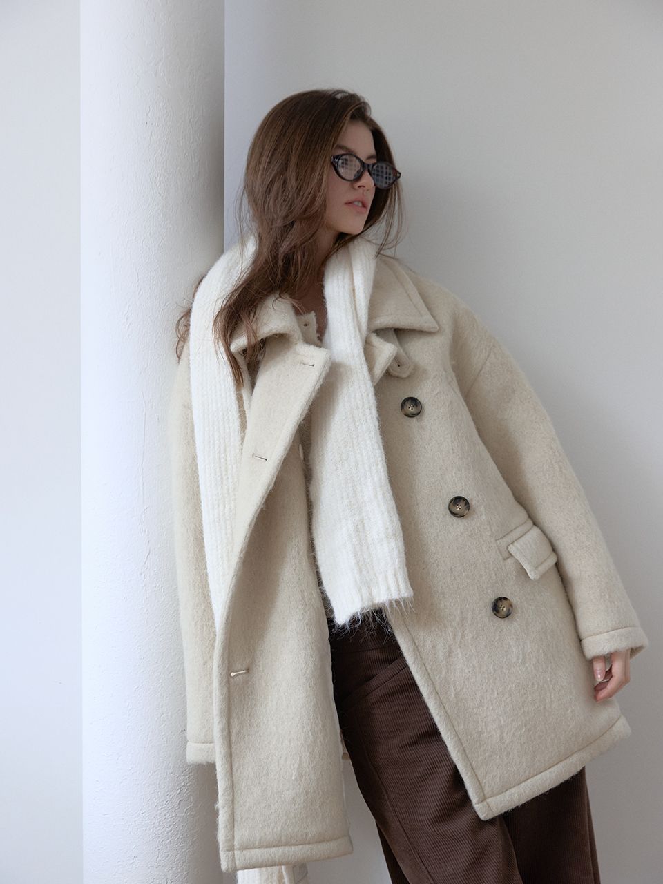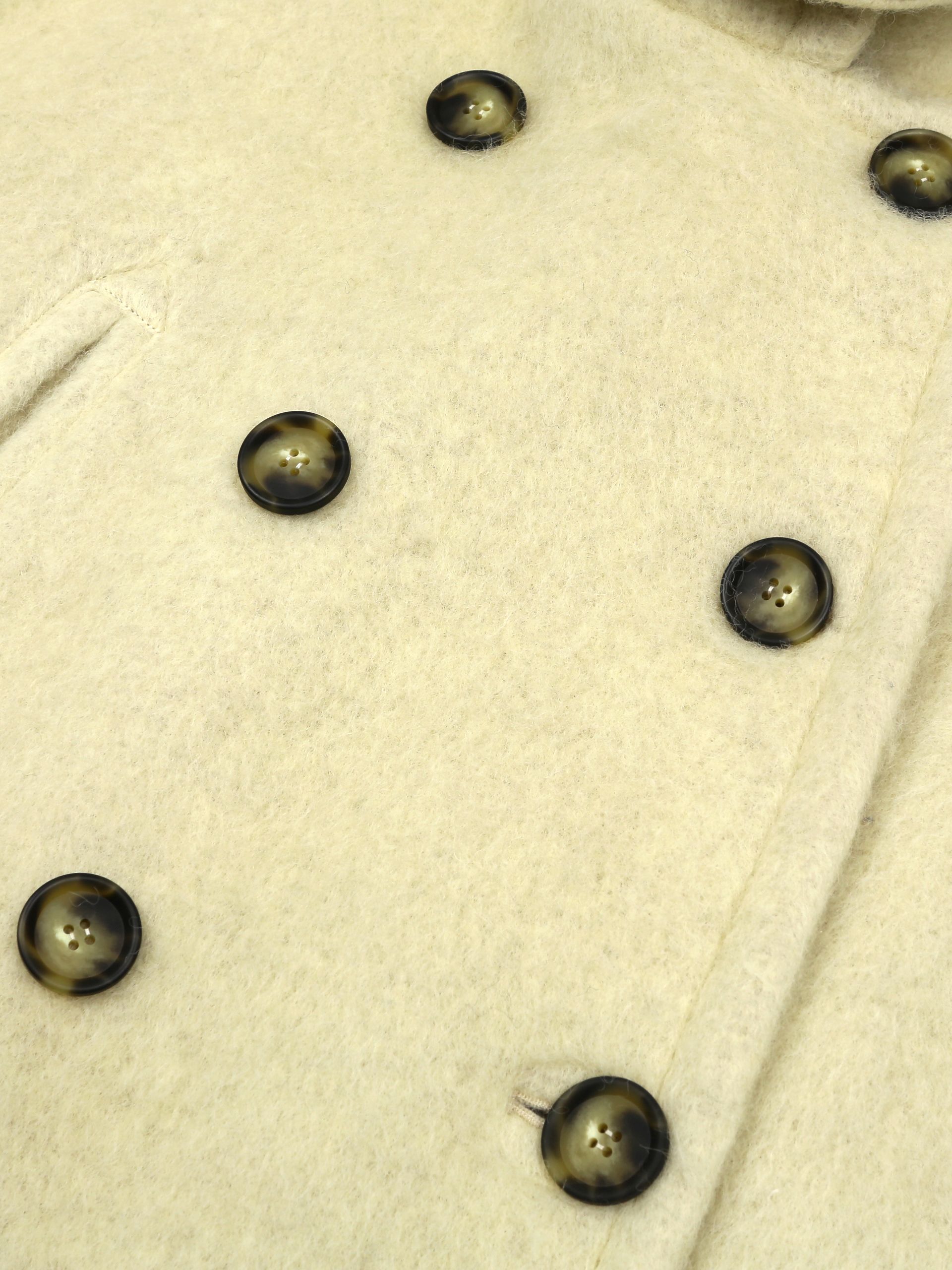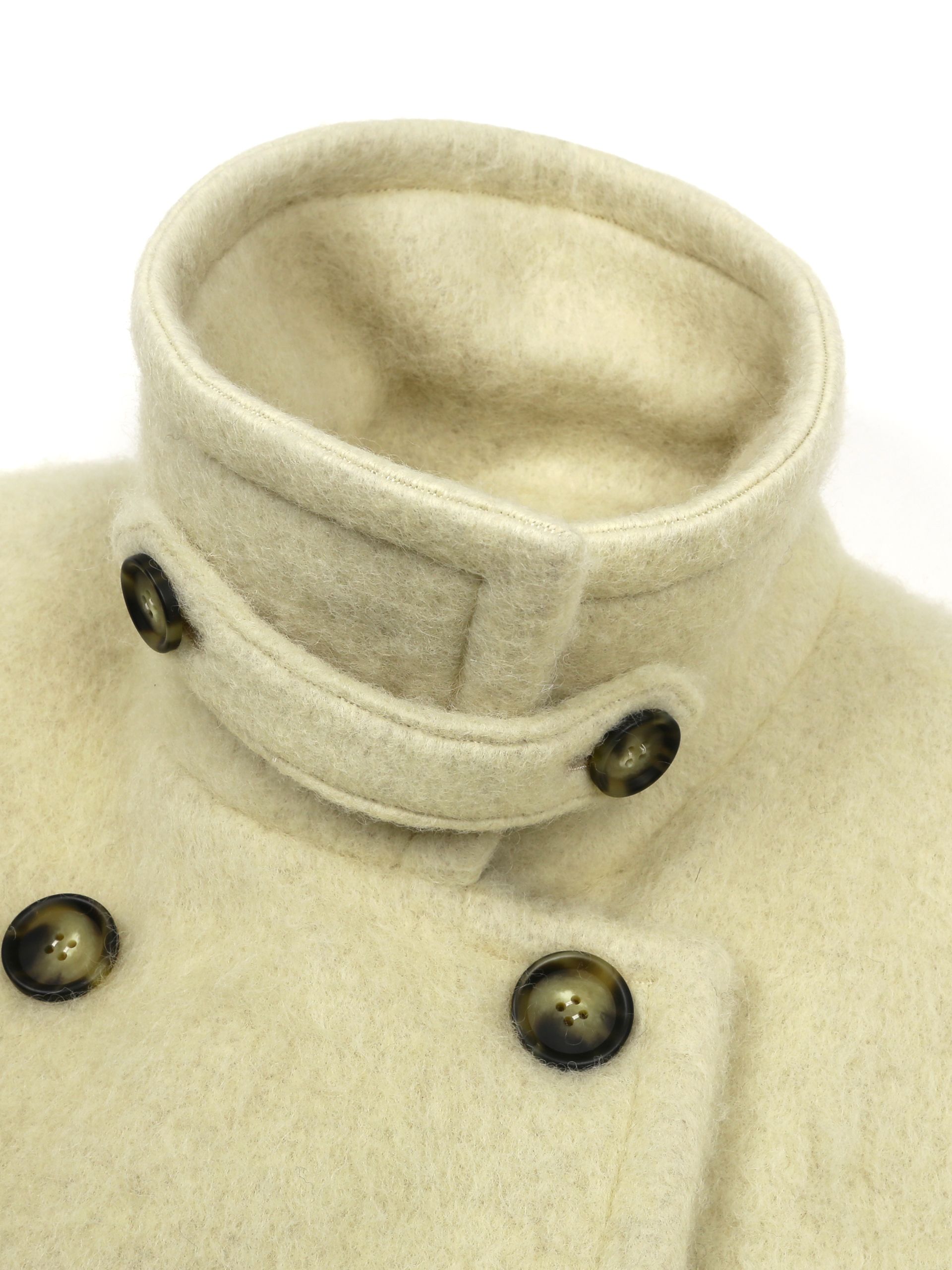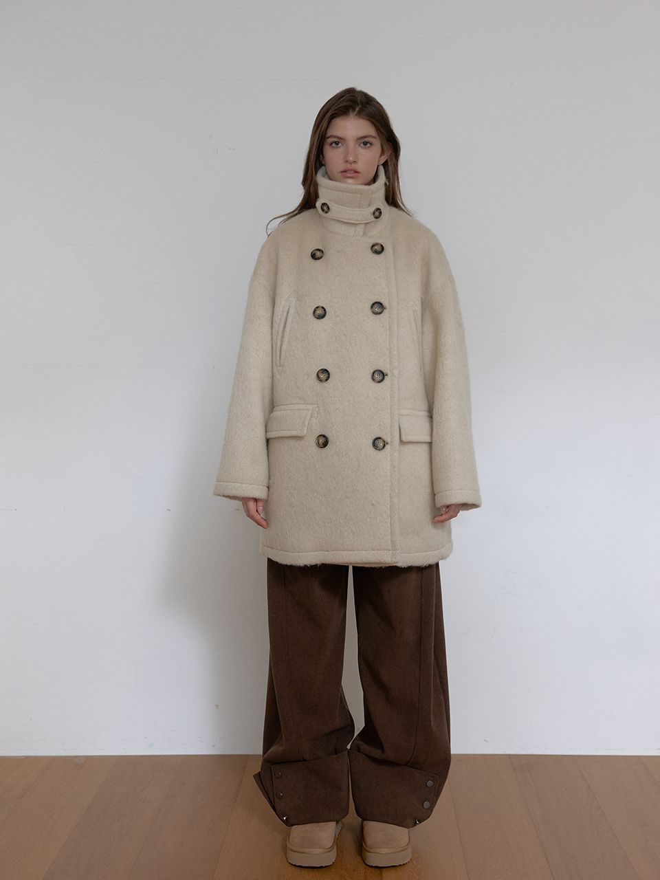 넥라인 단추 디테일이 포인트인 미니멀 무드의 울 블렌드 코트입니다.
