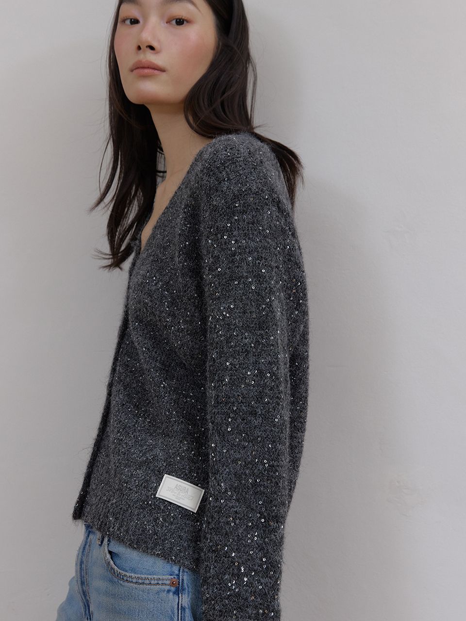헤어리한 텍스처와 반짝이는 스팽글이 믹스되어 화려하면서도 포근한 무드를 연출하는 V넥 가디건입니다.