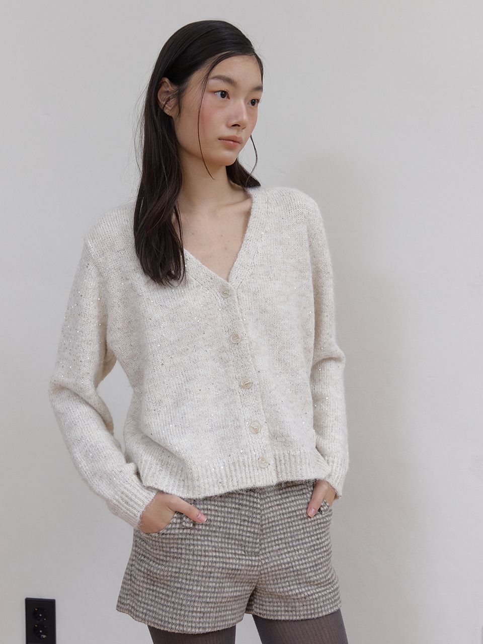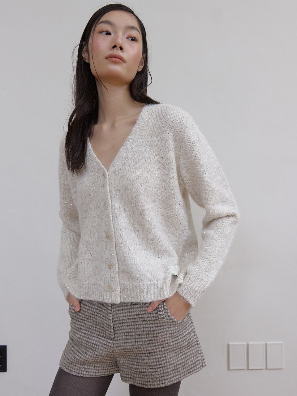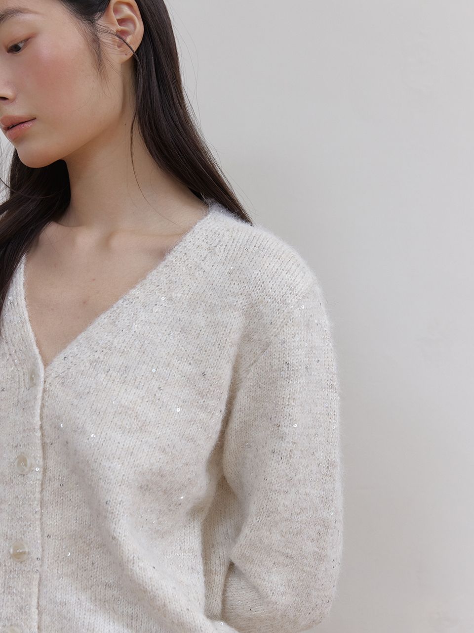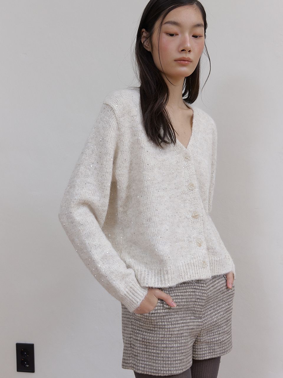 헤어리한 텍스처와 반짝이는 스팽글이 믹스되어 화려하면서도 포근한 무드를 연출하는 V넥 가디건입니다.