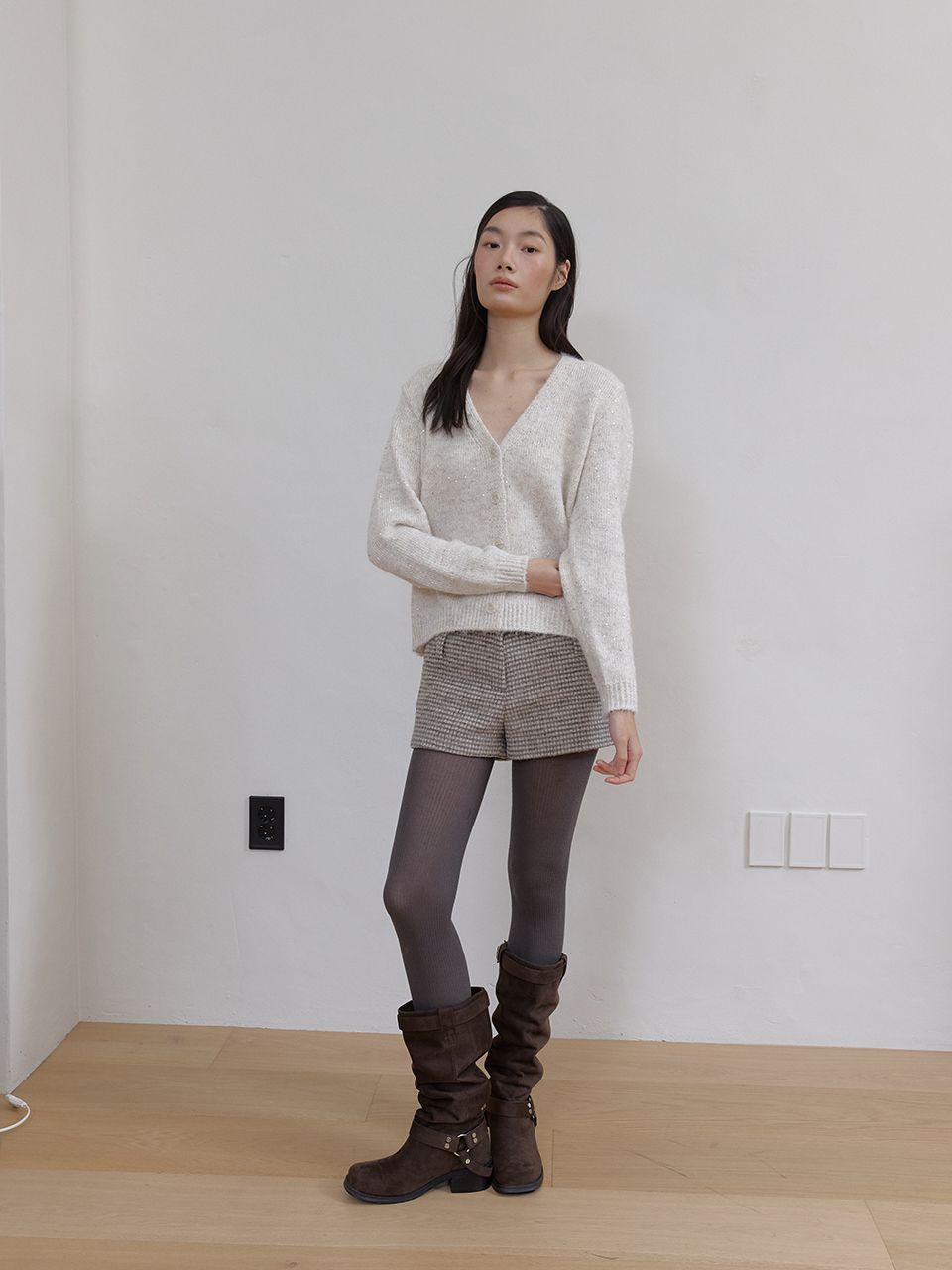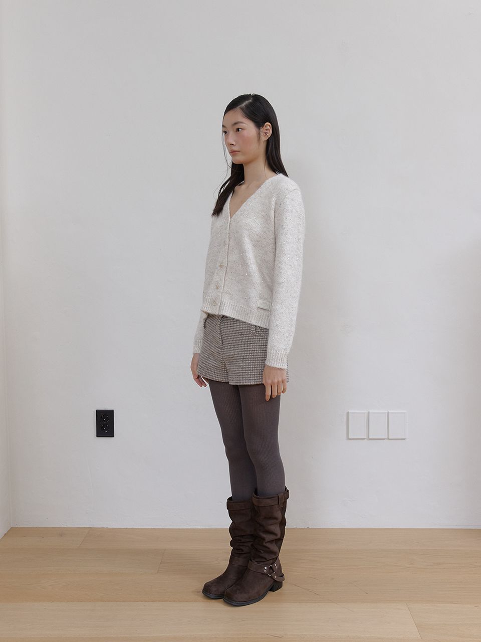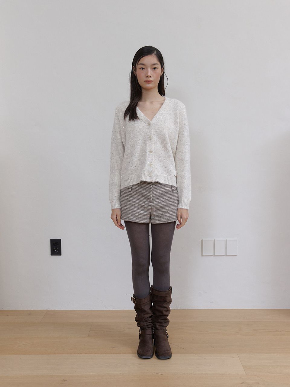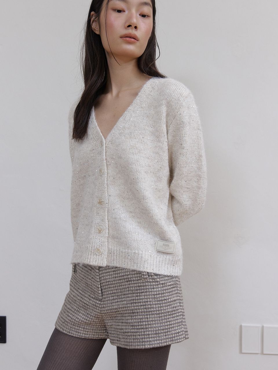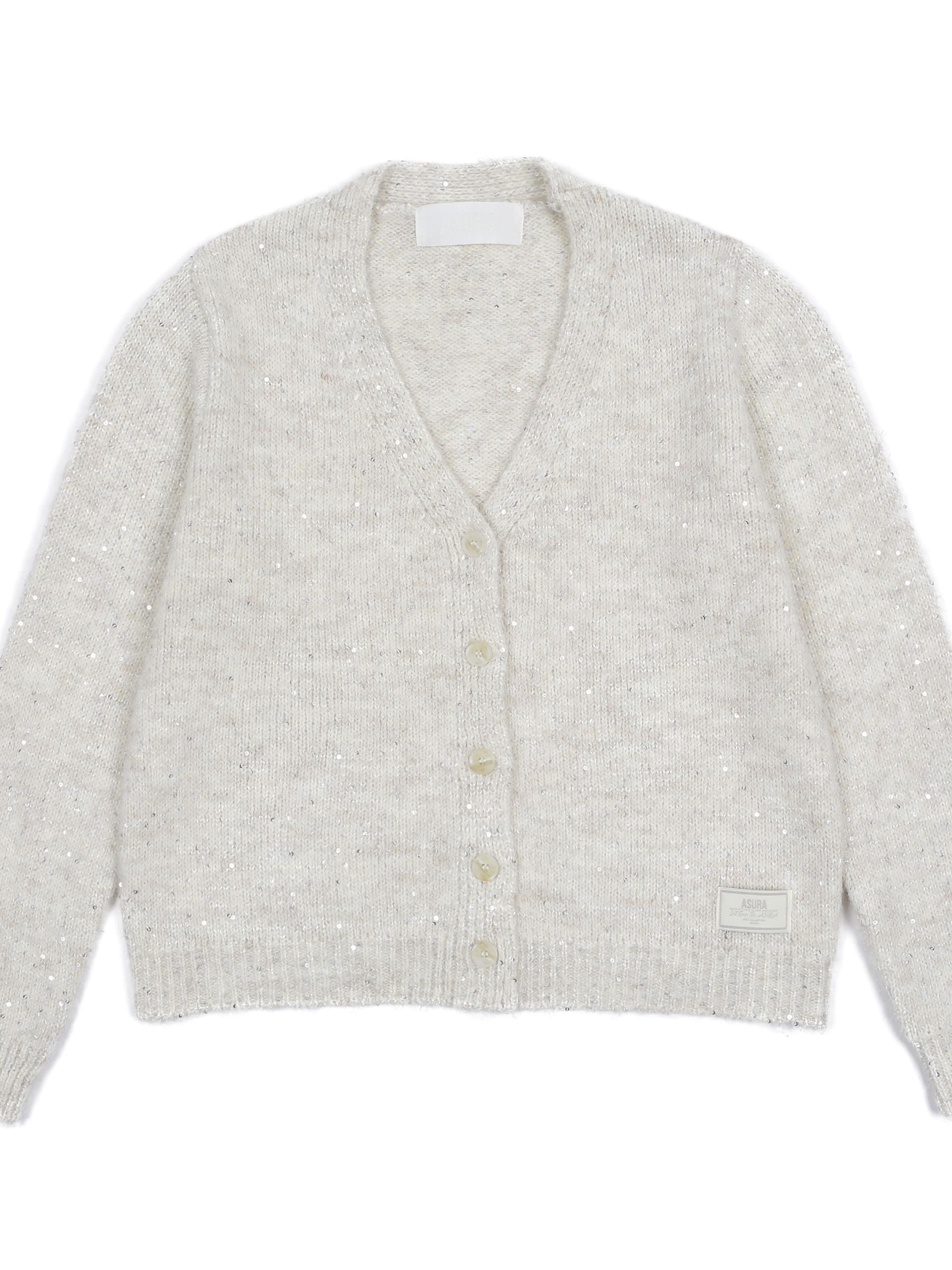 헤어리한 텍스처와 반짝이는 스팽글이 믹스되어 화려하면서도 포근한 무드를 연출하는 V넥 가디건입니다.