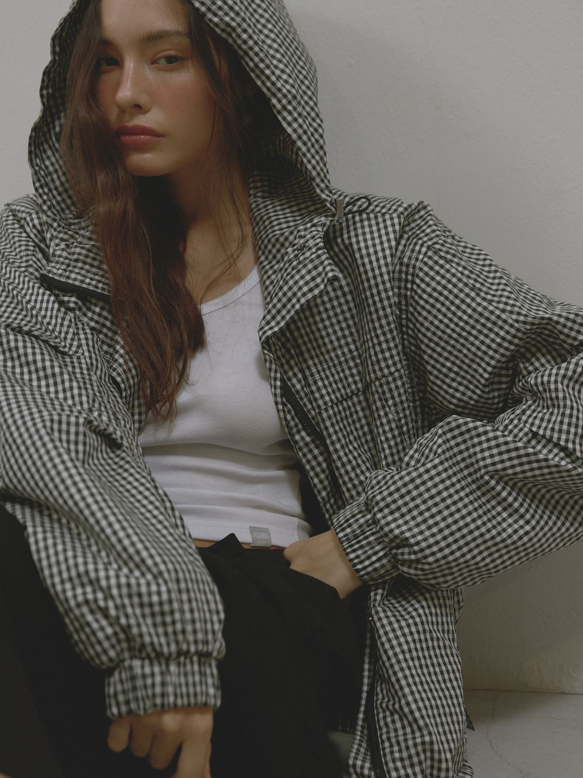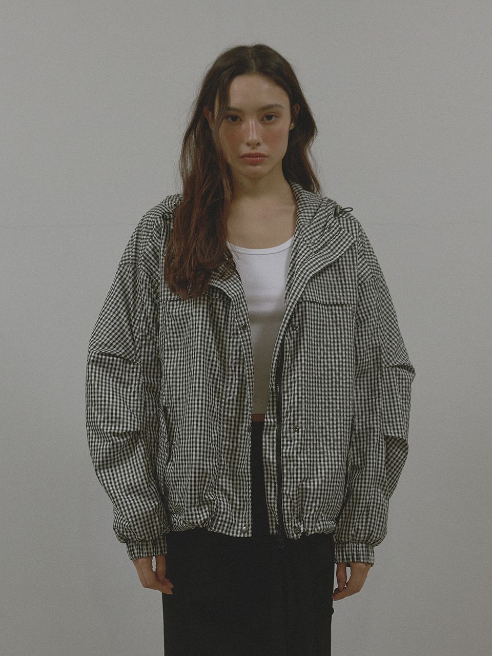 넉넉한 실루엣과 밴딩 처리로 활동성을 높였으며, 후드 스트링과 앞 지퍼 포켓으로 캐주얼한 무드를 완성했습니다.